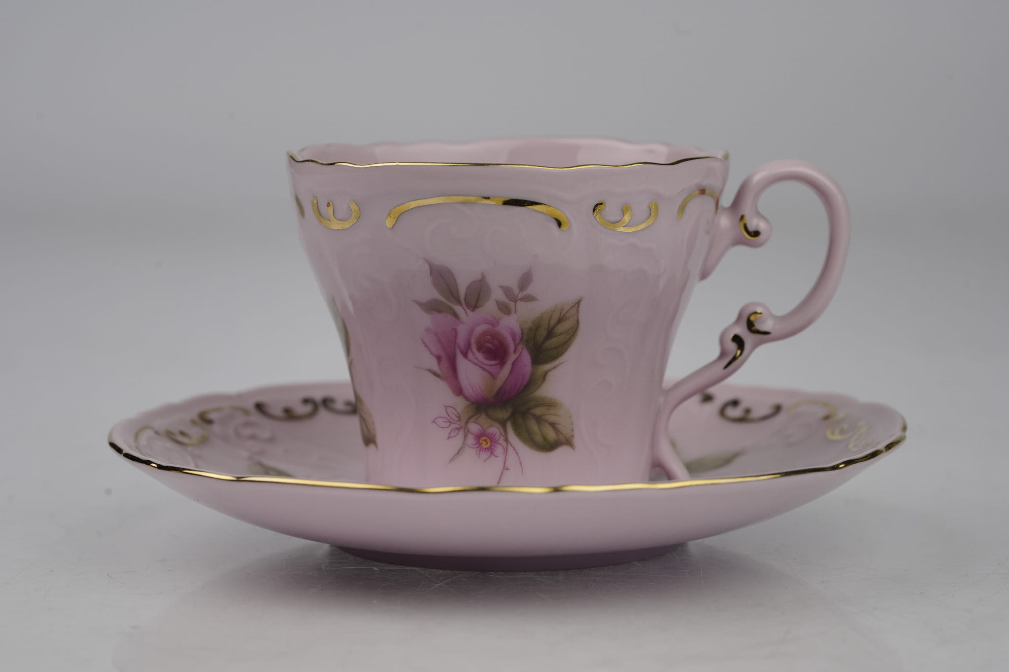 Cudowna filiżanka ze spodkiem z różowej porcelany, którą otrzymuje się przez dodatek złota. Pochodzi z Czech z miejscowości Loučky z wytwórni Leander Porcelán Loučky s.r.o. Sygnowana zielonym znakiem jak na zdjęciu z dopiskiem "Handgemalt 14 Karat Gold". Fason Ela. Klasyczny design oba elementy pokryte wyrafinowanymi reliefami, podkreślonymi złoceniami. Oba też zdobią kwiaty róż. Kształt i zdobienia tej filiżanki są kwintesencją tradycji i elegancji. Przedmiot jest bogato zdobiony 14-karatowym złotem na reliefach i konturach. Odcień nieco jaśniejszy niż wyszedł na zdjęciach.