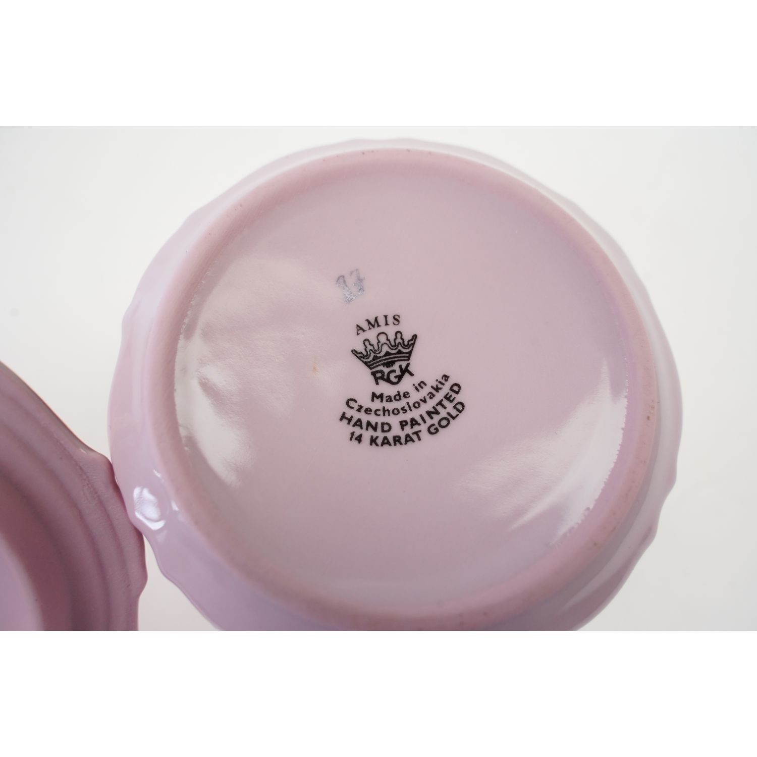 Pochodzi z Czech z miejscowości Loučky z Leander Porcelán Loučky s.r.o. Sygnatura z dopiskiem "Hand Painted 14 karat gold". Fason Amis. Porcelana w kolorze różowym, którą to barwę otrzymuje się przez dodatek złota. Ma prostą formę z pionowymi kanelowaniami i falowaną górną krawędzią podkreśloną złoceniem. Ozdobione wielobarwnymi, drobnymi kwiatszkami. Sterczynka w kształcie płomienia.