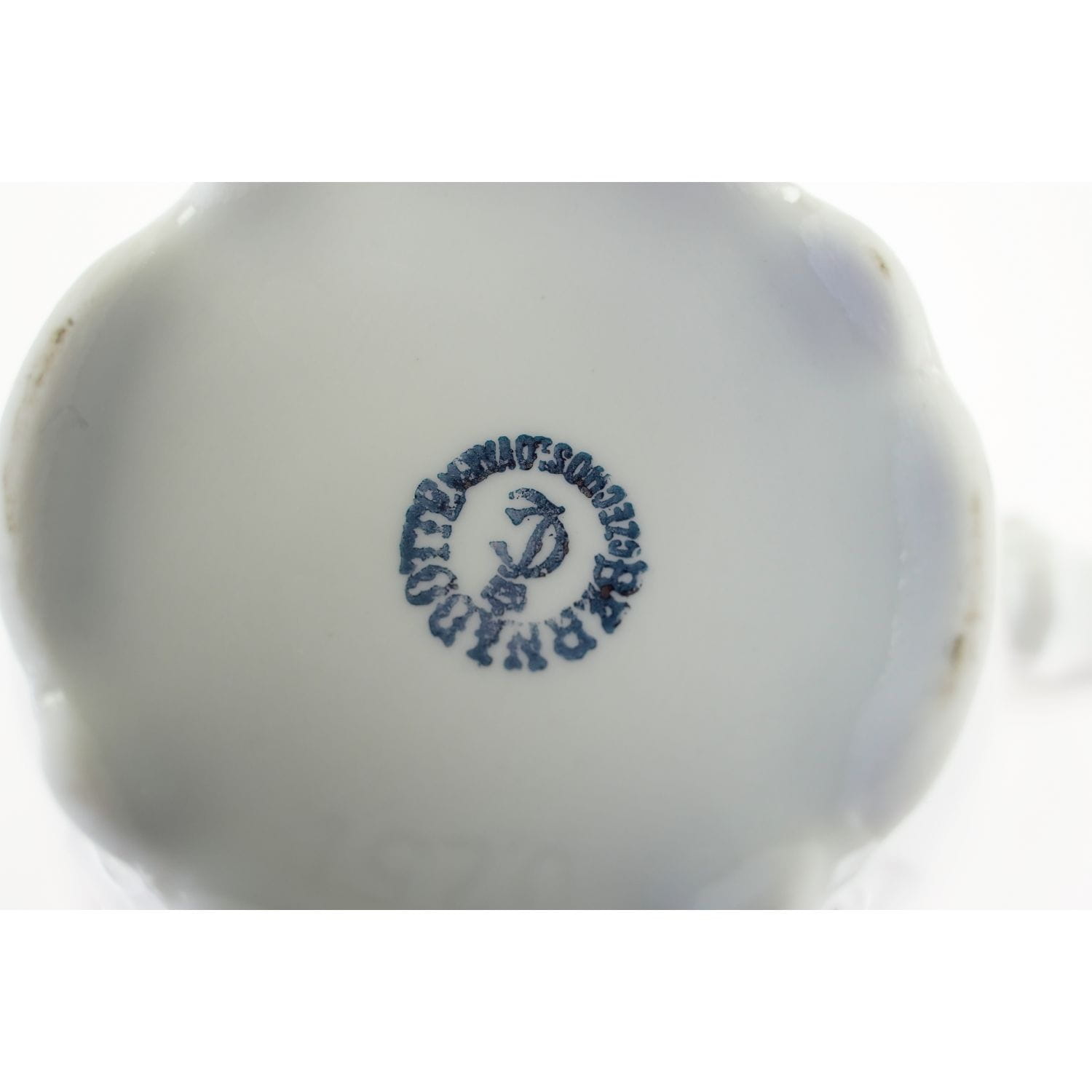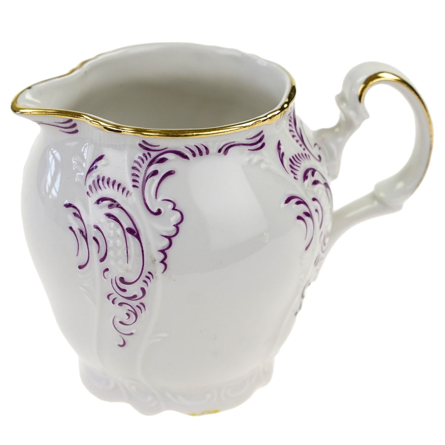 Pochodzi z Czech z miejscowości Lesov z Narodni Podnik Thunska, potem Karlovarský Porcelán a.s. závod Concordia Lesov. Fason Bernadotte. Sygnowany znakiem stosowanym po 1945 roku. Śliczna porcelana w kolorze białym z subtelnymi, ale wyrazistymi reliefami, które ręcznie podkreślone fioletową malatura. Całości dopełniają złocenia na krawędziach i uszku. Pięknie i elegancko się prezentuje.