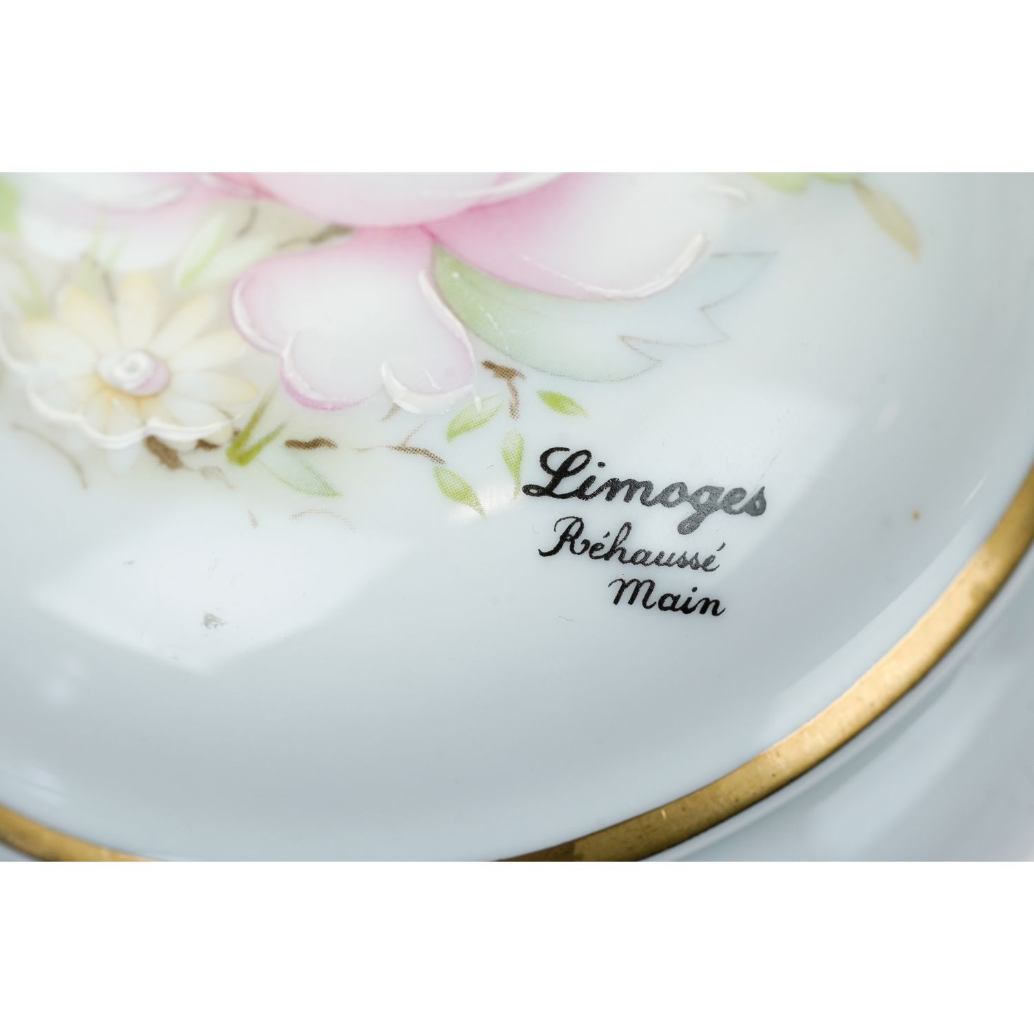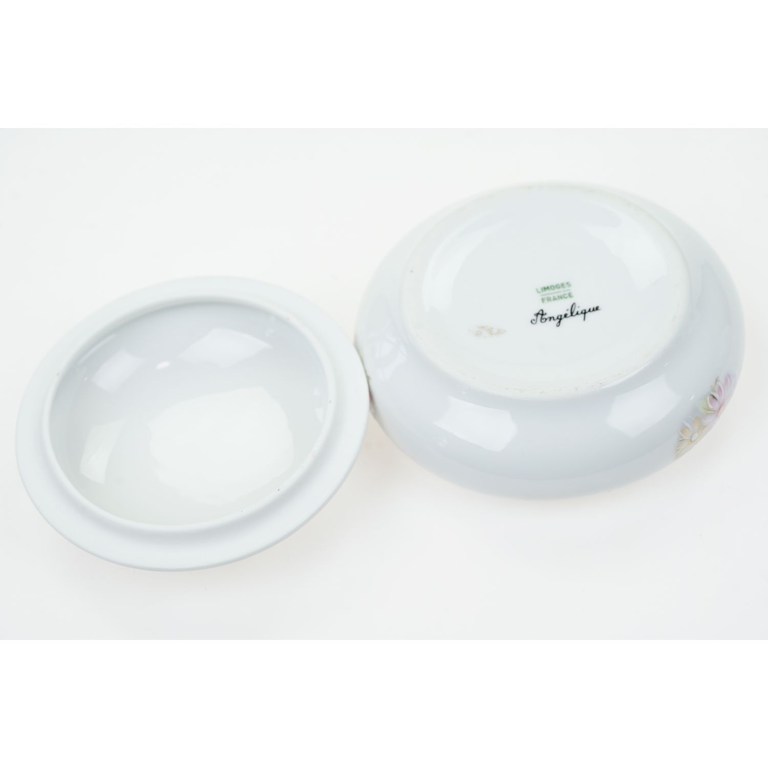 Pochodzi z Francji z Limoges. Angélique. Sygnowane jak na zdjęciu. Wykonane z białej porcelany. Na nim pastelowe kwiaty magnolii ręcznie podmalowane. Na pokrywie dodatkowo złoty napis "Limoges Rehaussé Main". Krawędzie w złotej obwódce.