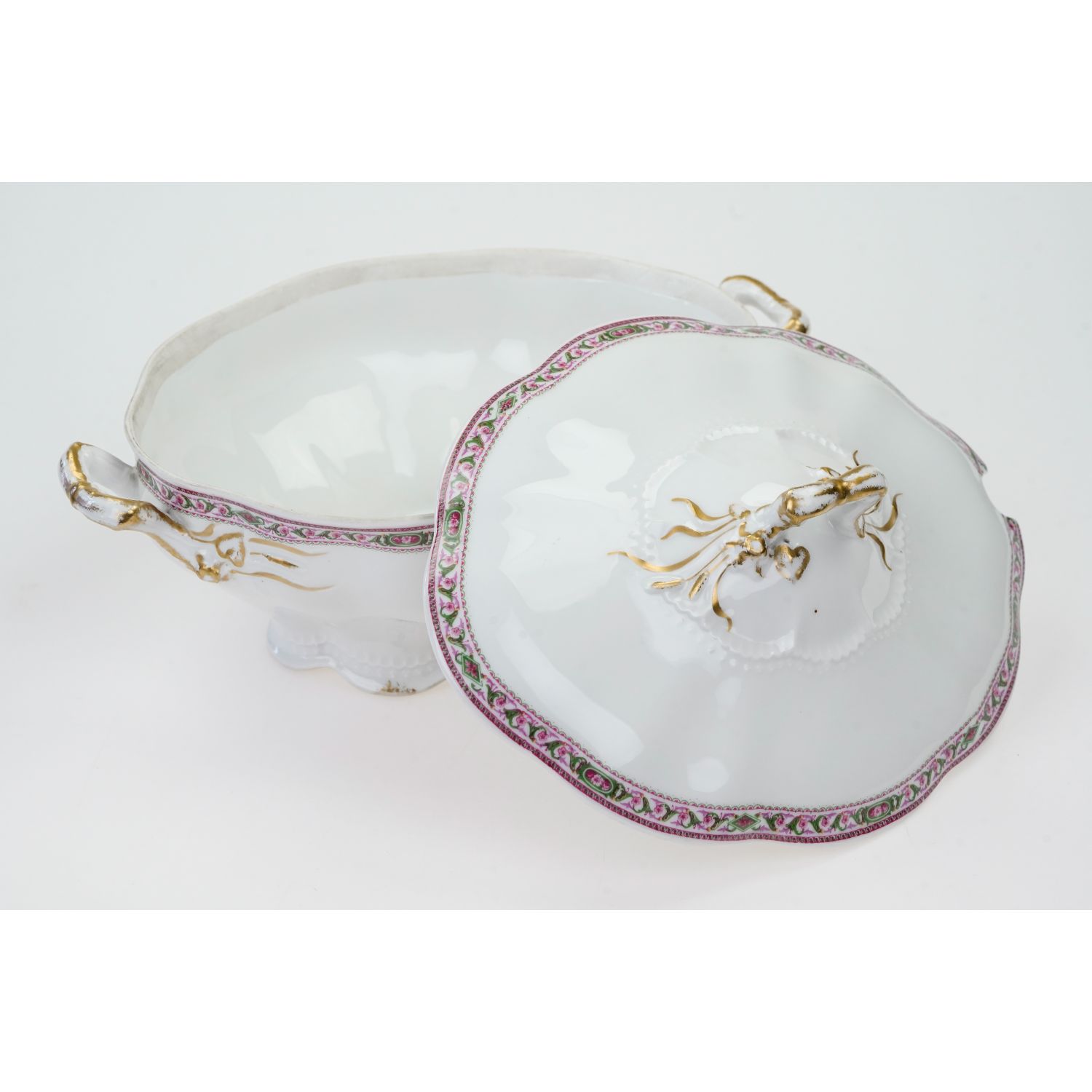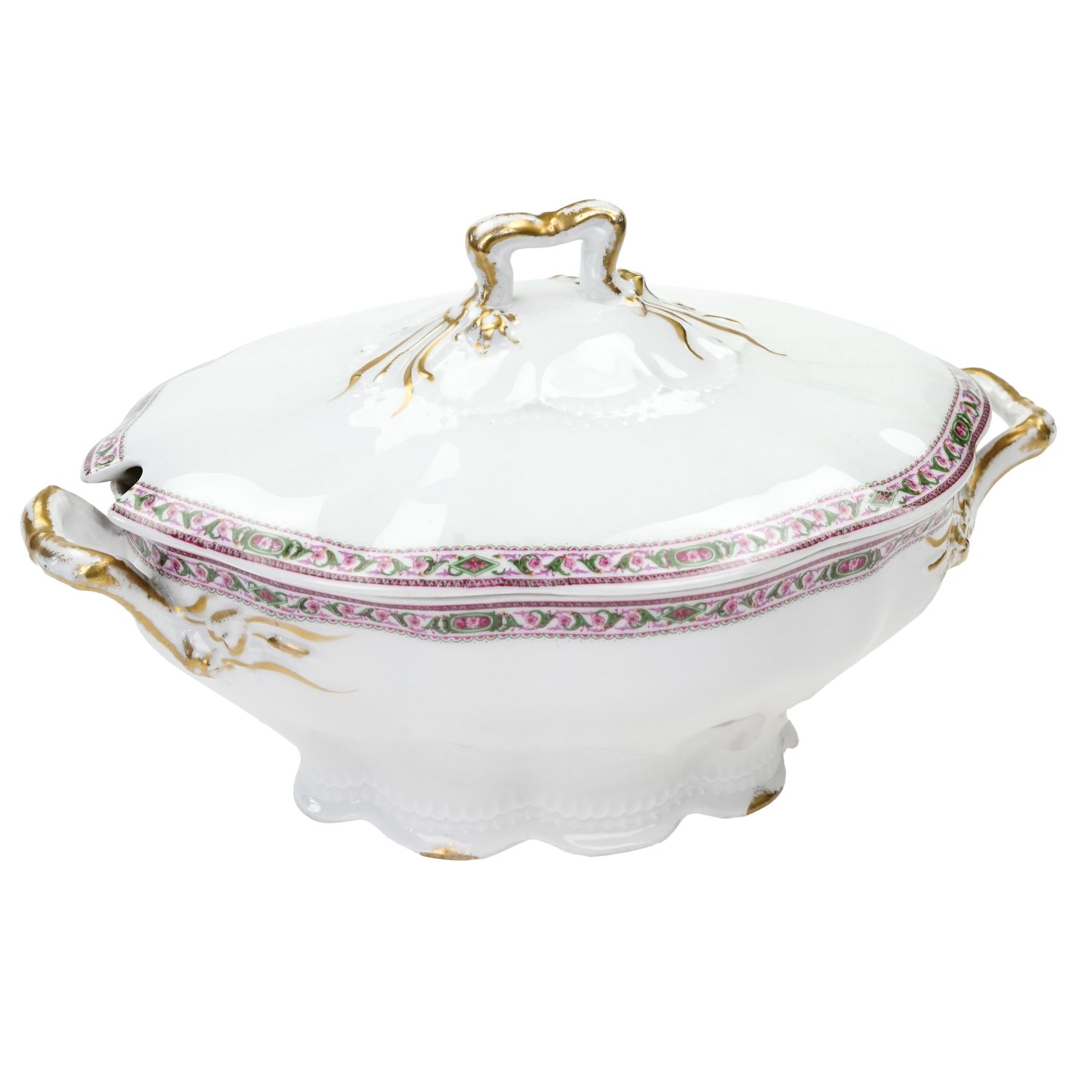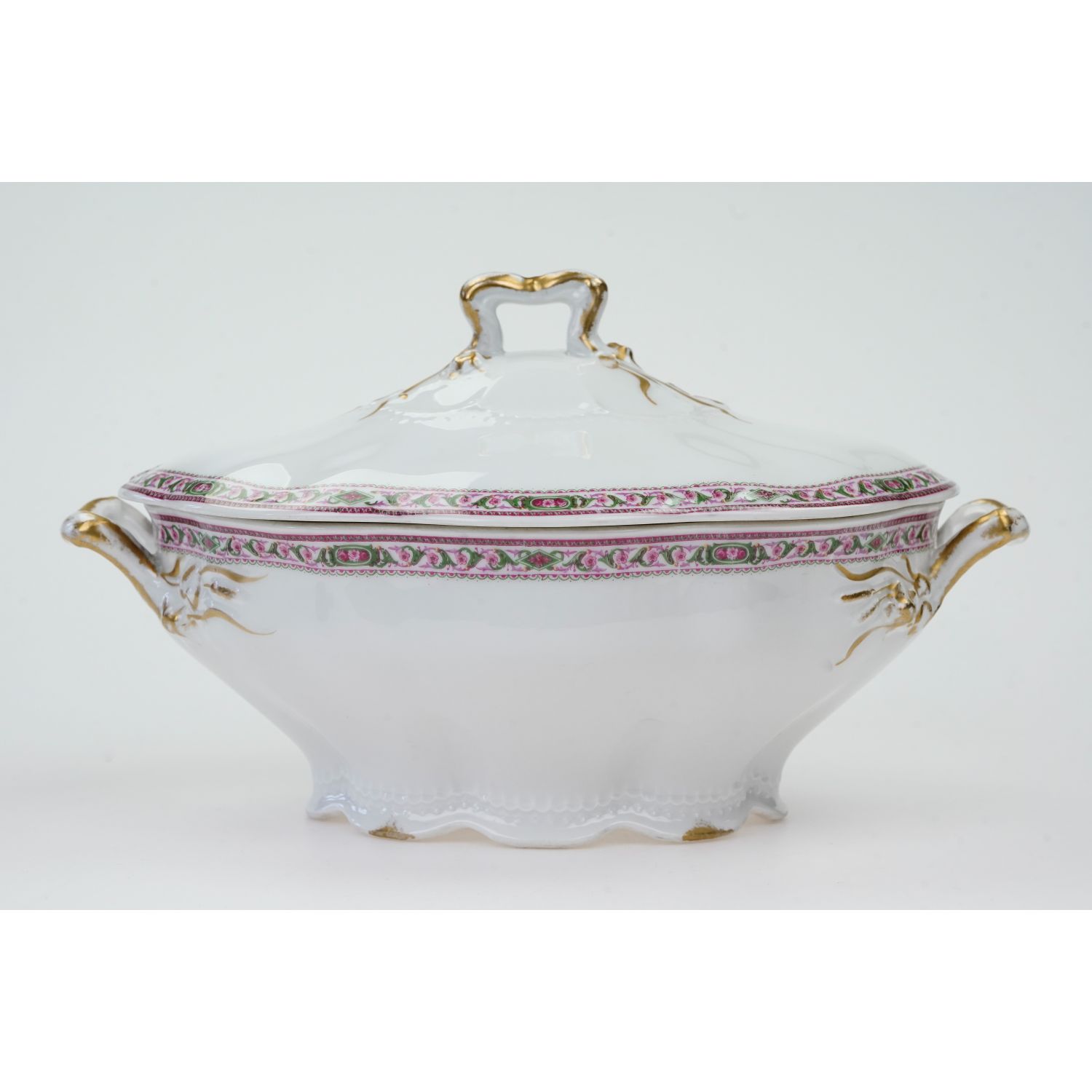 Pochodzi z Limoges z wytwórni Charlsa J. Ahrenfeldta. Sygnowana znakiem stosowanym od 1894 roku. Wykonana z białej, delikatnej porcelany o eleganckiej formie. Z ładnymi uszkami ozdobionymi roślinnymi reliefami nieregularnie pokrytym złoceniami. Ozdobiona przy krawędziach kwiatowym szlaczkiem. W pokrywie otworek na chochlę.