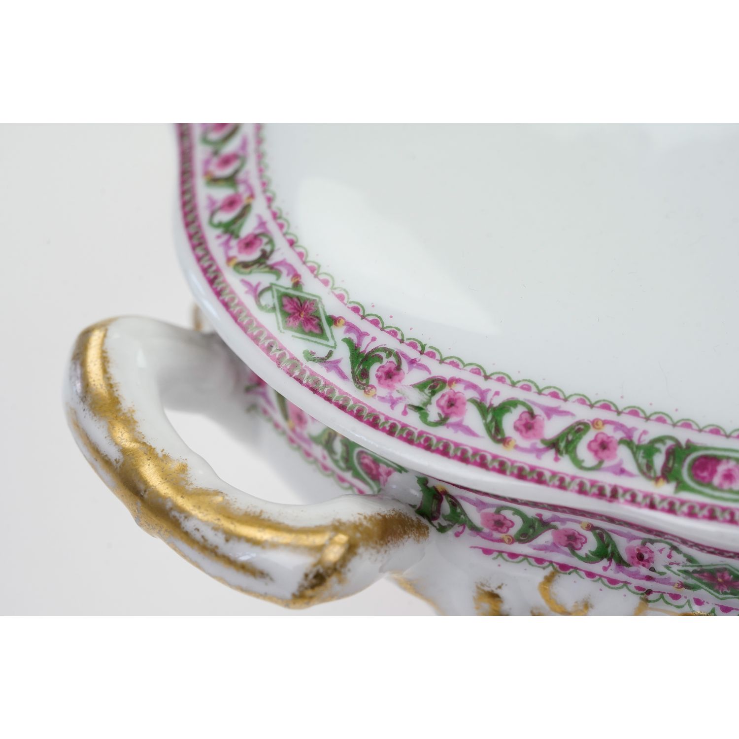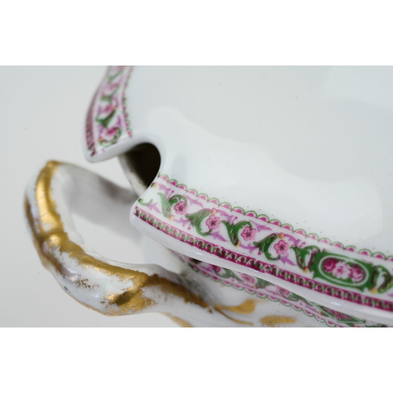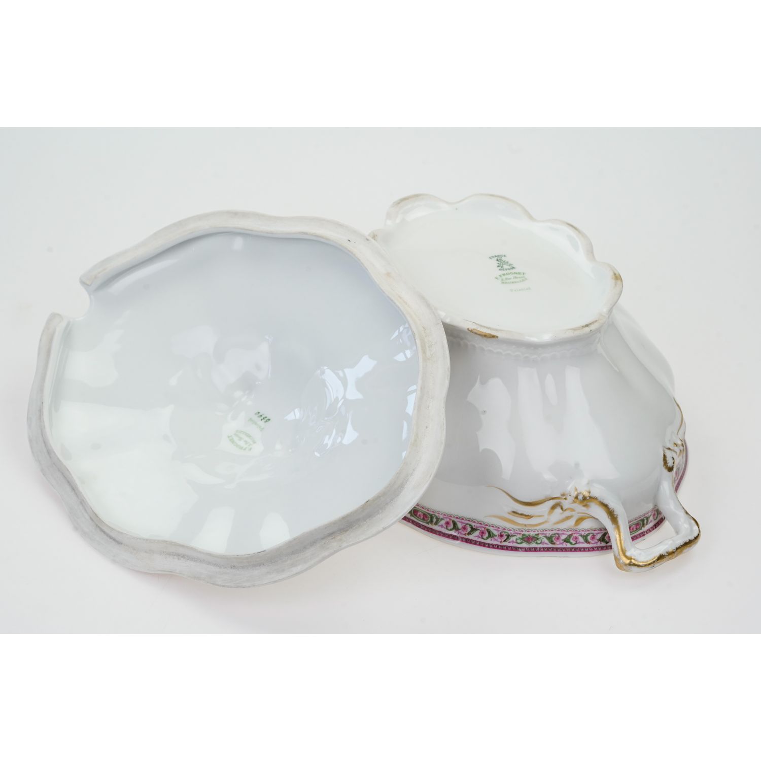 Pochodzi z Limoges z wytwórni Charlsa J. Ahrenfeldta. Sygnowana znakiem stosowanym od 1894 roku. Wykonana z białej, delikatnej porcelany o eleganckiej formie. Z ładnymi uszkami ozdobionymi roślinnymi reliefami nieregularnie pokrytym złoceniami. Ozdobiona przy krawędziach kwiatowym szlaczkiem. W pokrywie otworek na chochlę.