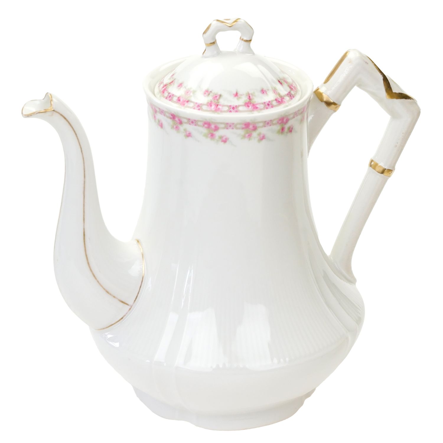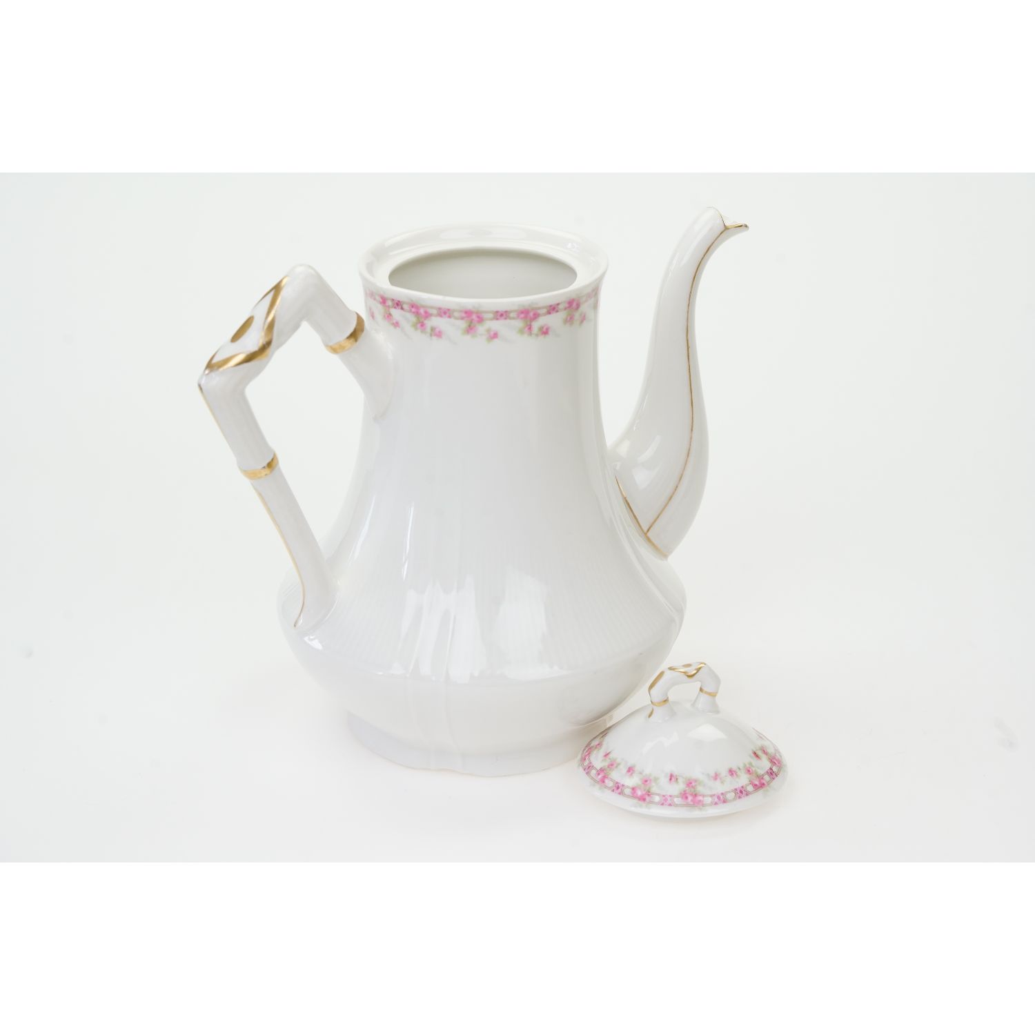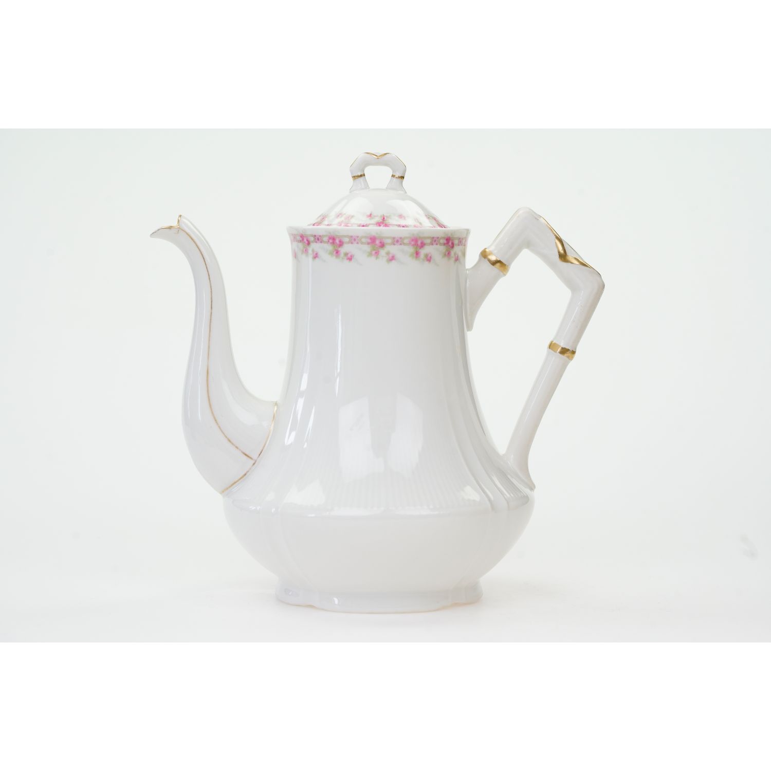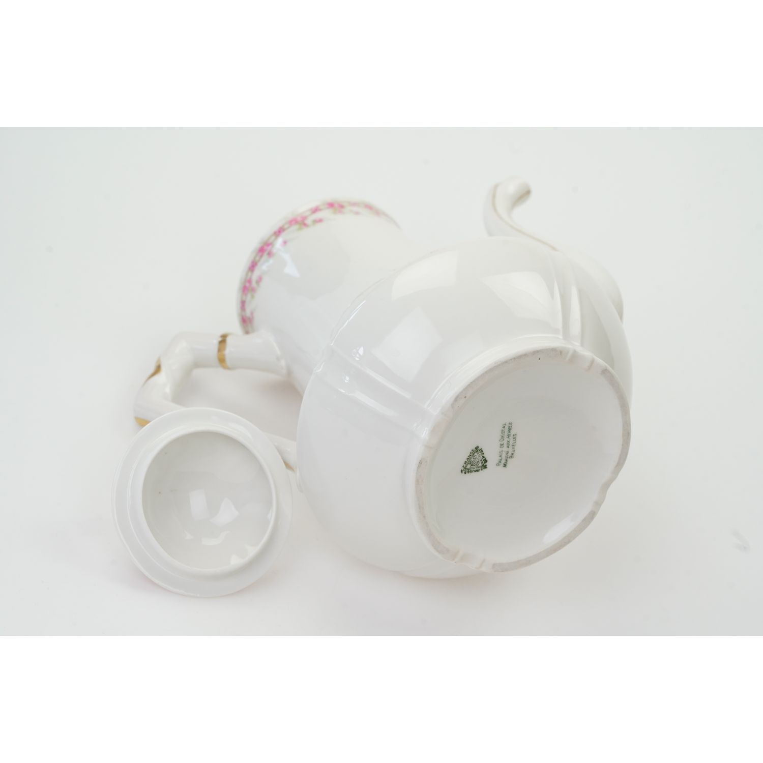 Pochodzi z Limoges z wytwórni Charlesa Martina. Sygnowany znakiem stosowanym od 1892 do 1900 roku. Porcelana biała, delikatna pokryta delikatnym kanelowaniem. Przy krawędziach subtelne szlaczki różyczek. Ucho, sterczynka, wlewka i krawędź w złoceniu. Fabrycznie wyposażony w wewnętrzne siteczko.
