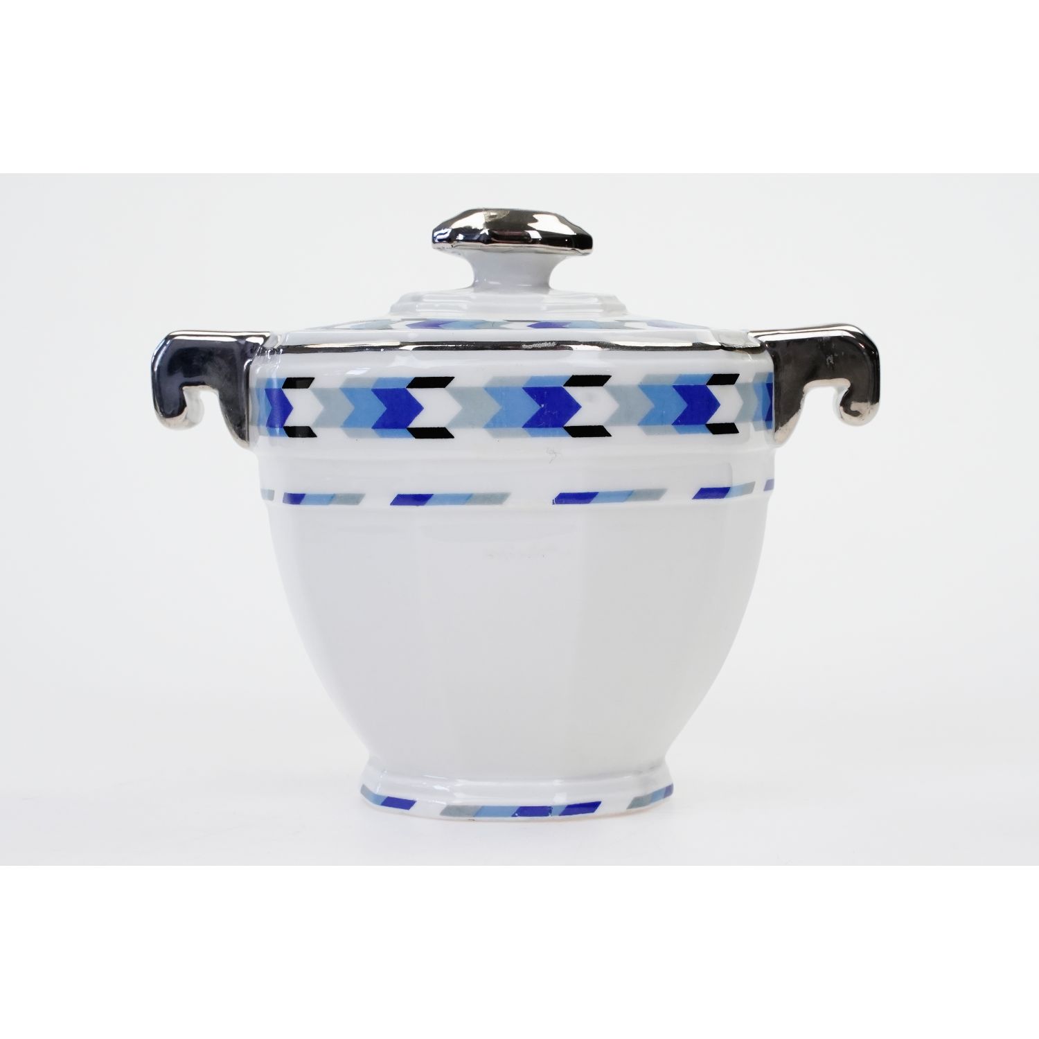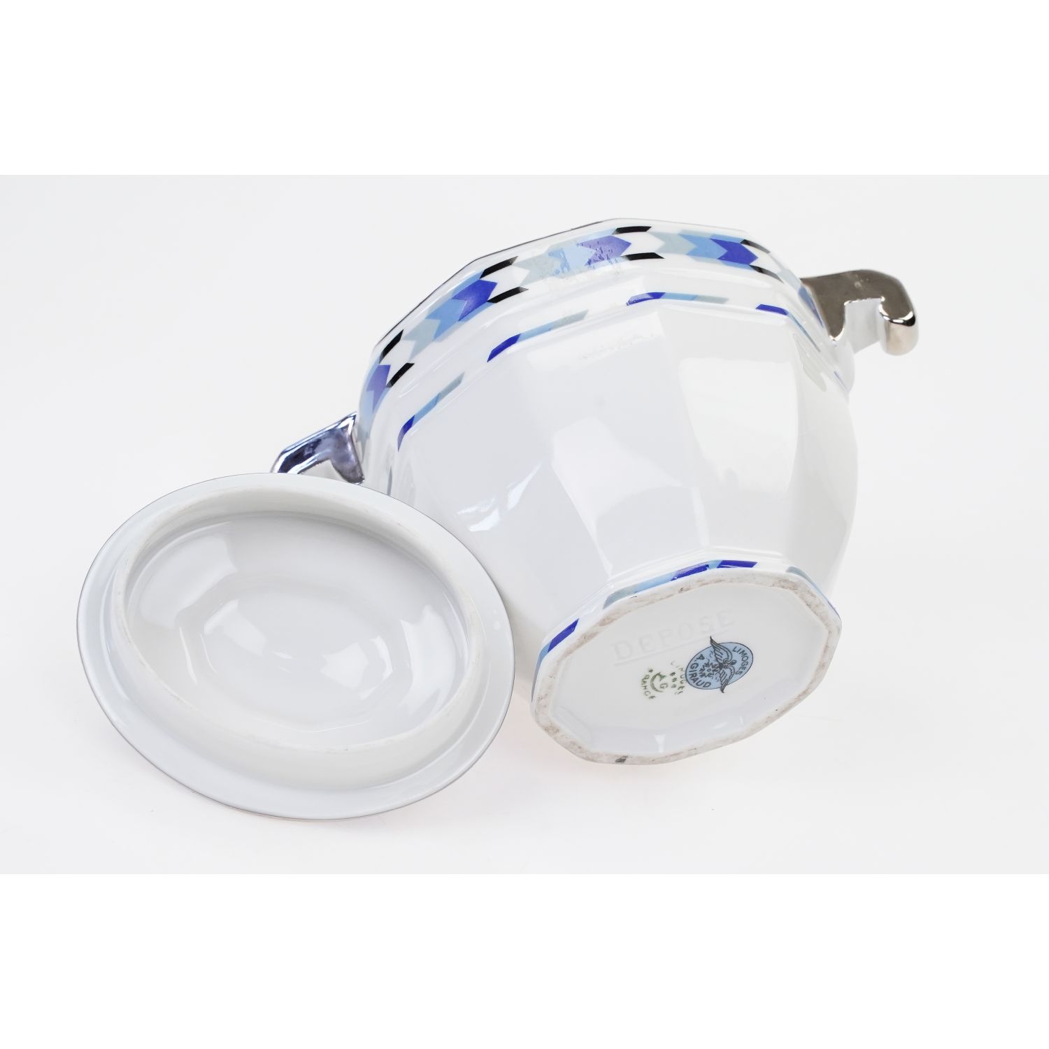 Pochodzi z Limoges z wytwórni Giraud. Zachowana w stylu Art-Deco. Lśniąca, biała porcelana. Przy górnej krawędzi i na pokrywie szaro-niebieskie zgeometryzowane szlaczki. Kontury srebrzone i w pełni srebrzone uszka i sterczynka.