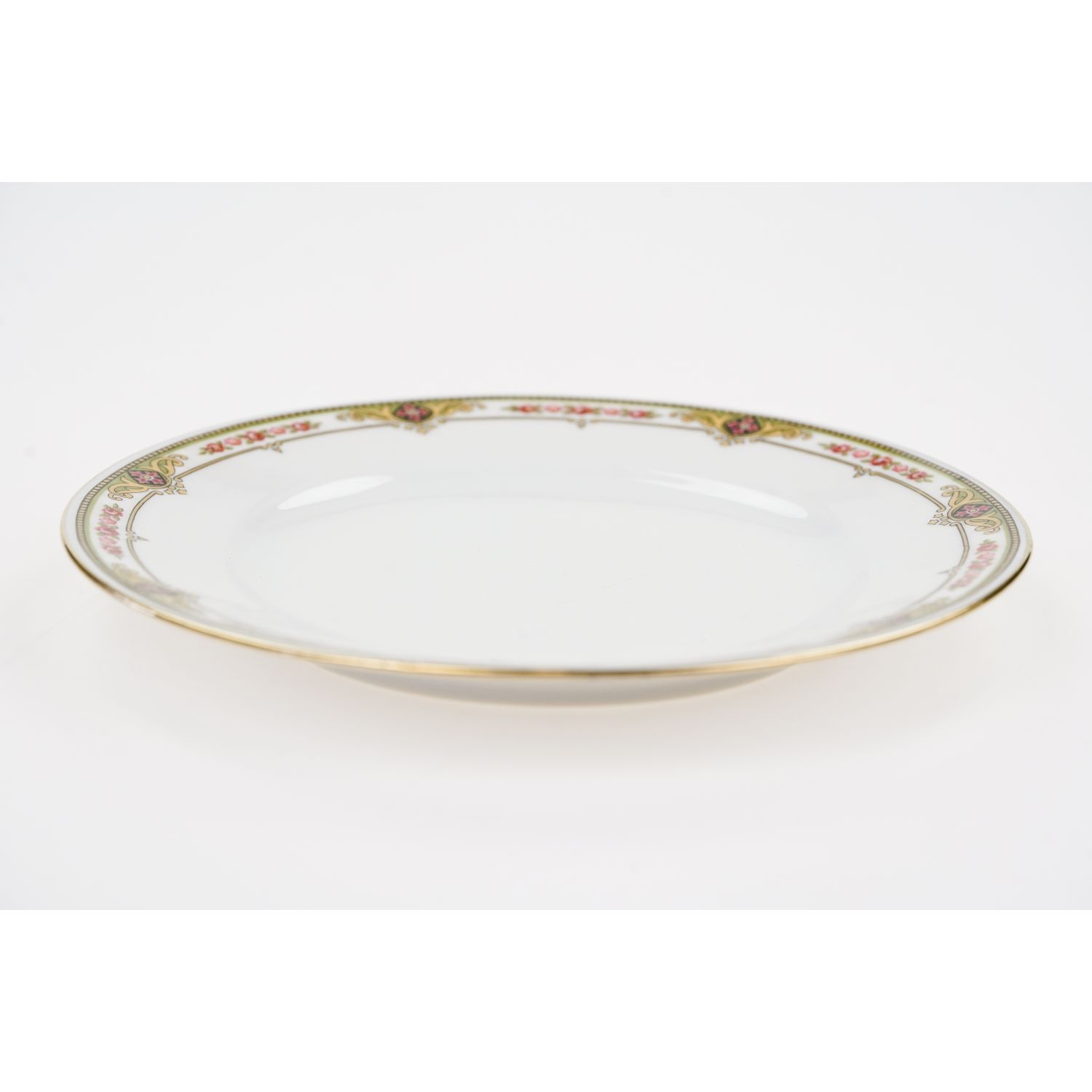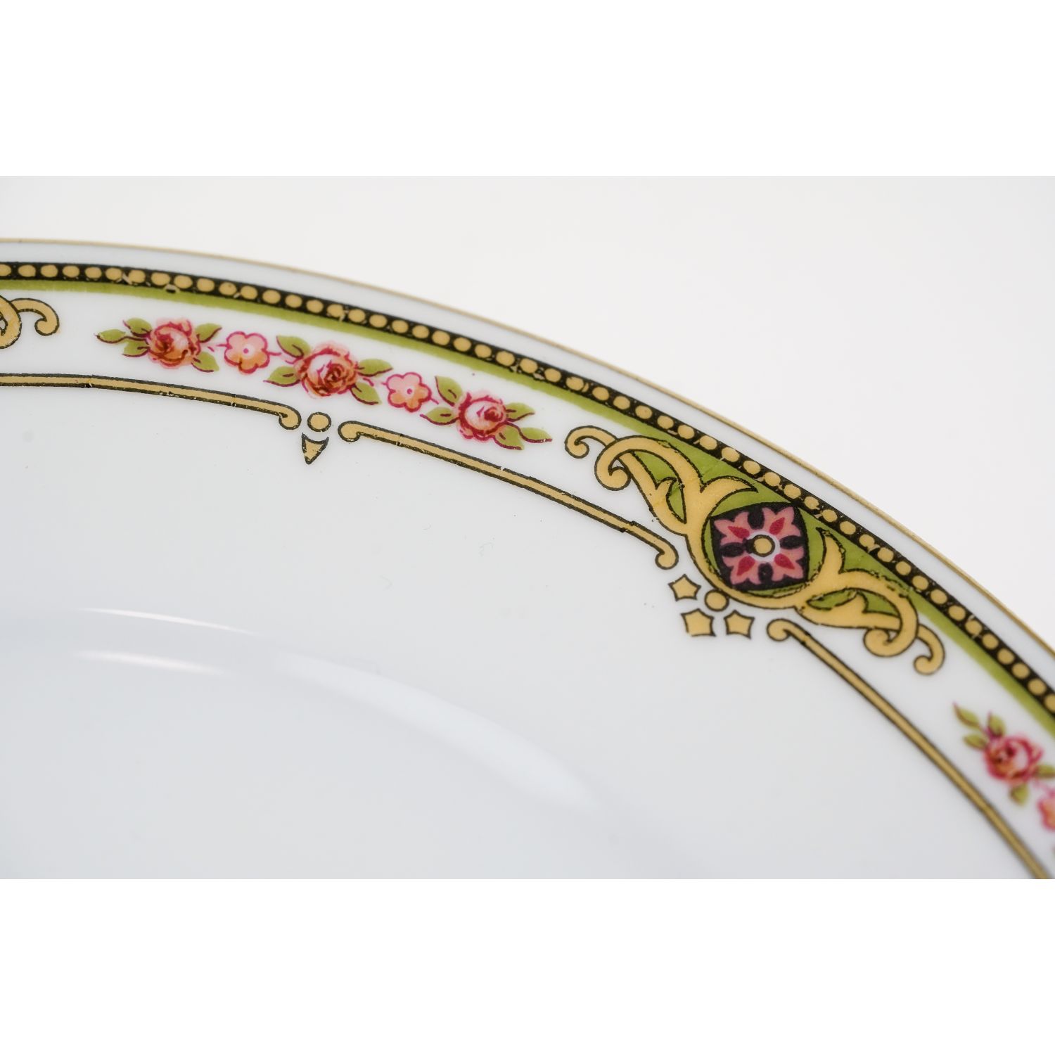 Pochodzi z Francji z Limoges z wytwórni Balleroy et Cie. Sygnowane znakiem stosowanym od 1903 do 1940 roku. Porcelana w odcieniu bieli, o prostych, eleganckich kształtach. Wszystkie elementy zdobione przy krawędziach różaną, barwną bordiurą i złoceniami na krawędzi.
