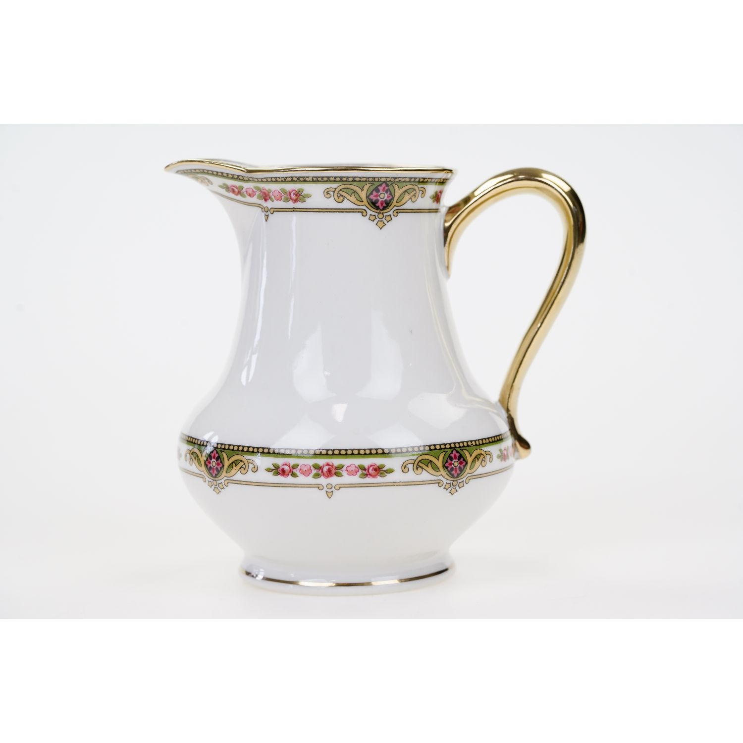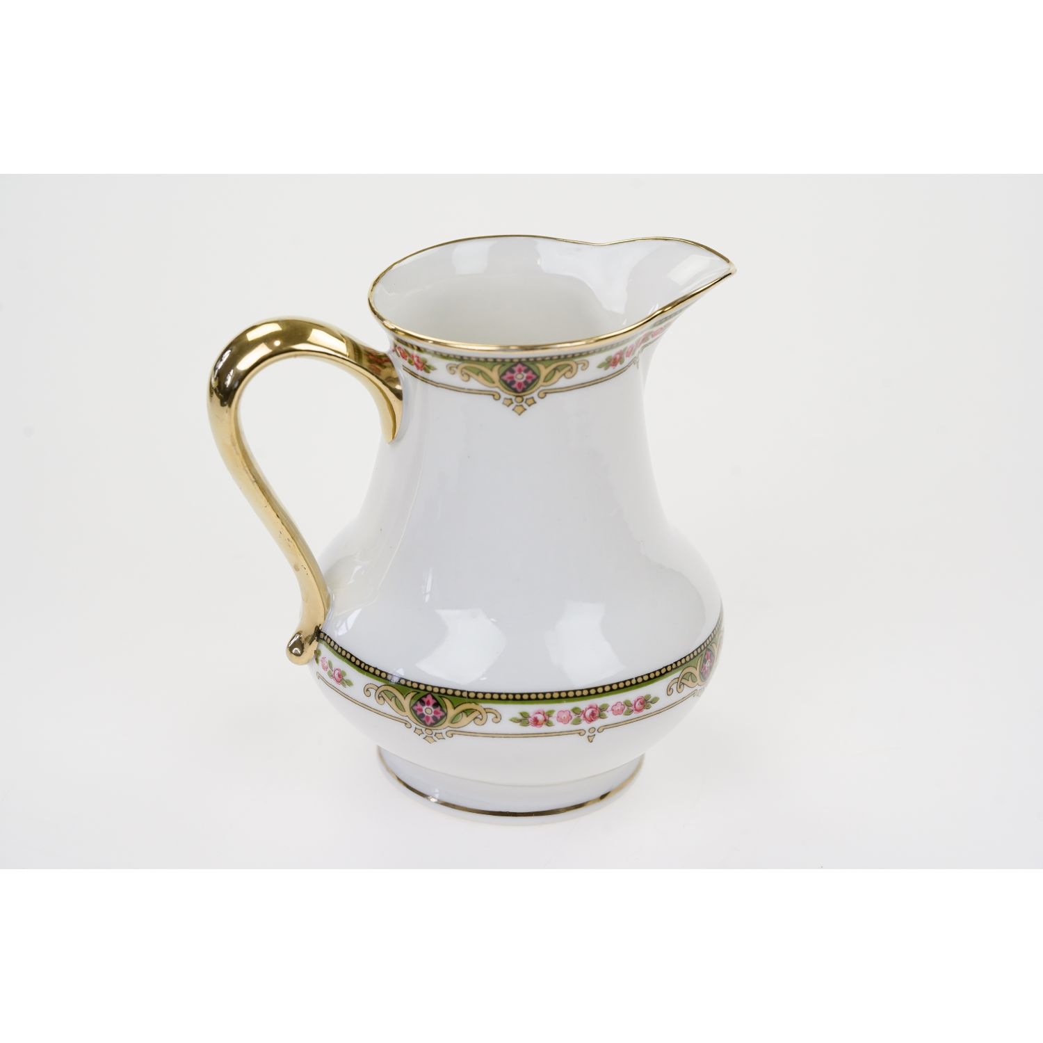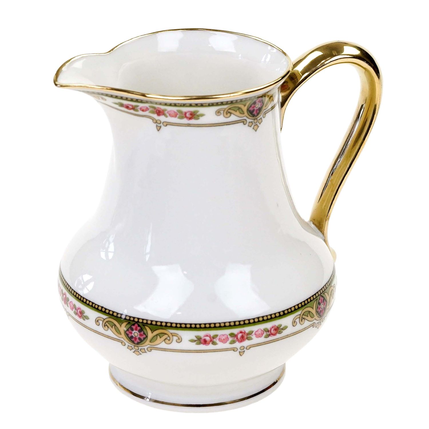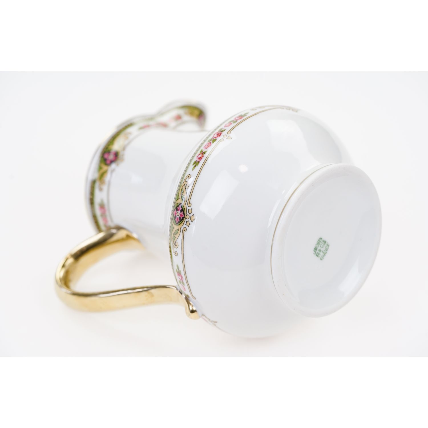 Pochodzi z Francji z Limoges z wytwórni Balleroy et Cie. Sygnowany znakiem stosowanym od 1903 do 1940 roku. Porcelana w odcieniu bieli, o prostych, eleganckich kształtach. Ozdobiona przy górnej krawędzi różaną, barwną bordiurą i złoceniami na krawędzi. Uszko w pełni złocone.
