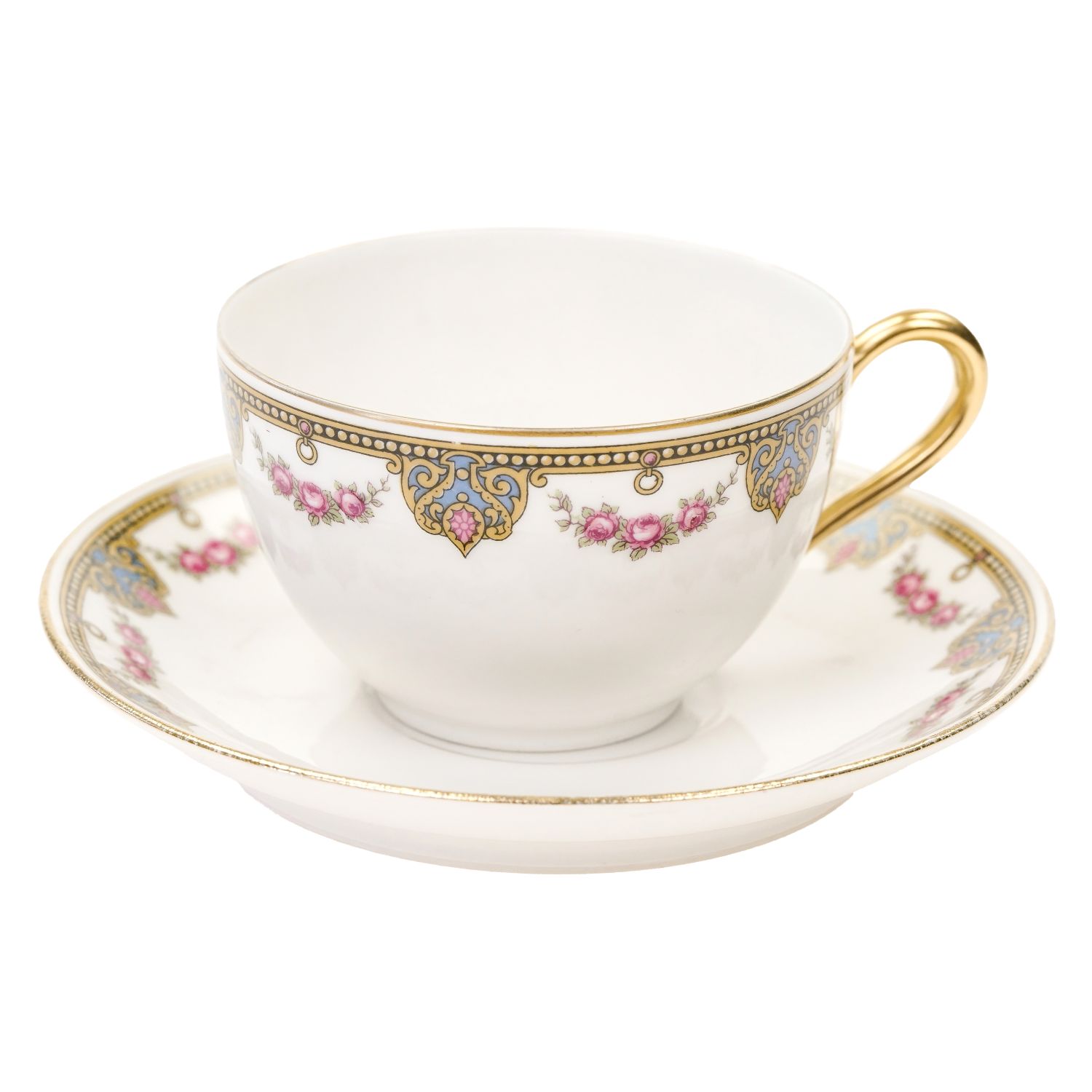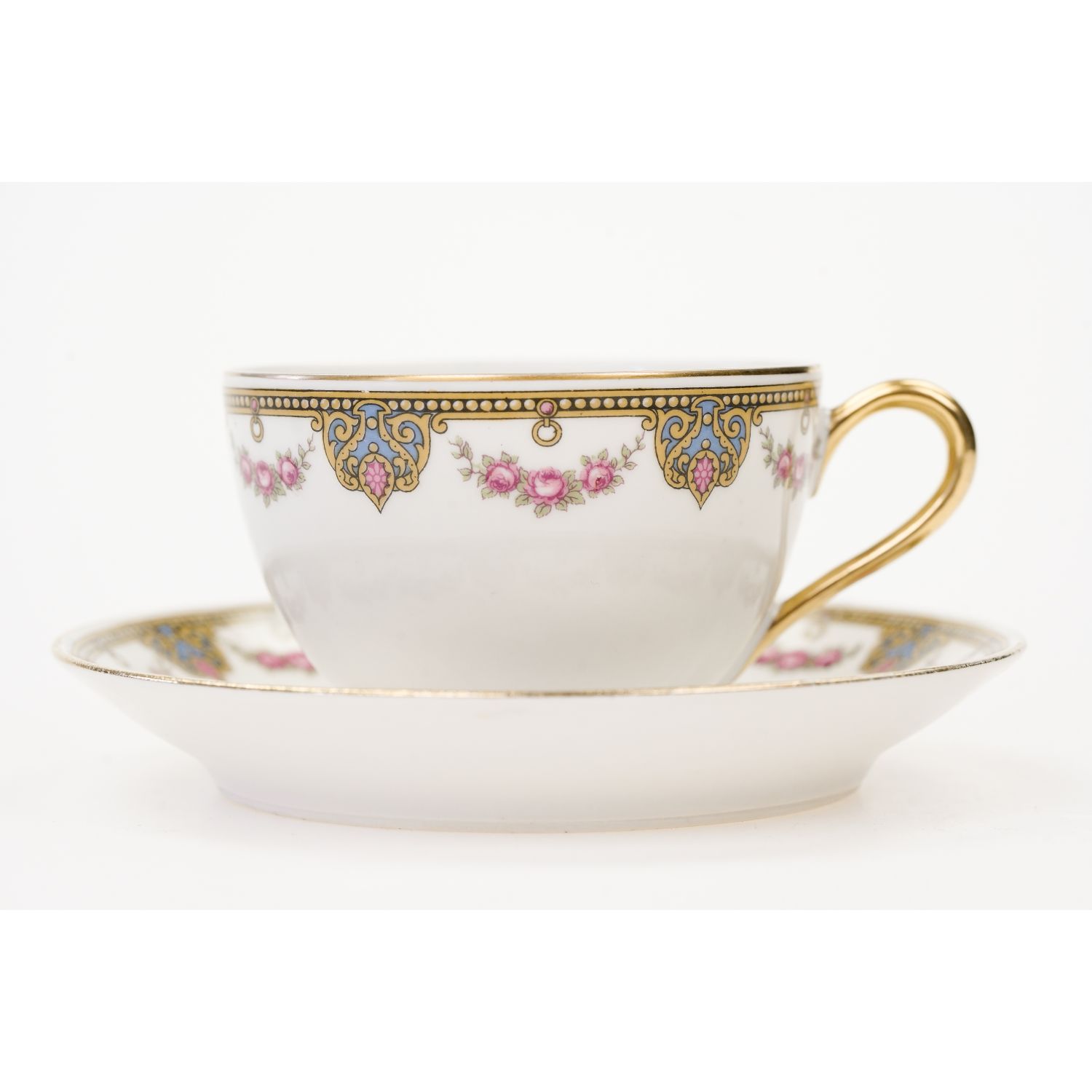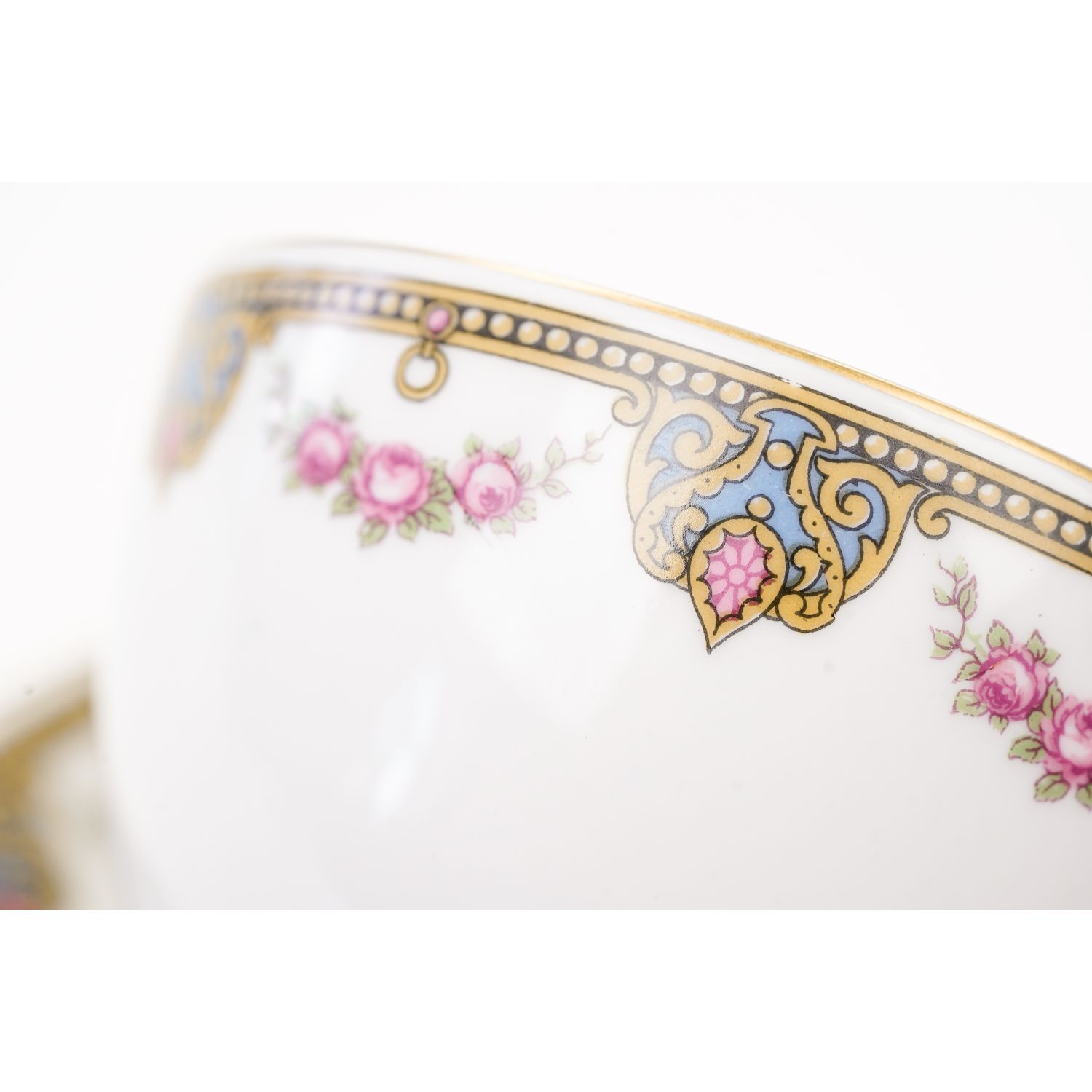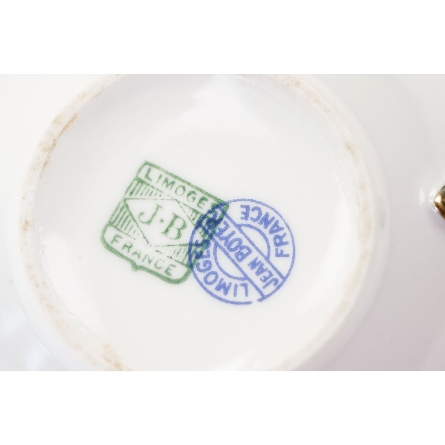 Urocza filiżanka i spodek ze wspaniałym wzorem dekoracyjnym w postaci przyjemnych szlaczków i girland różyczek. Oznaczona na podstawie „Jean Boyer” w kolorze niebieskim i „Limoges J. B. France” w kolorze zielonym. Wykonane w fabryce porcelany z Rue du Velodrome w Limoges. Musi pochodzić z lat 1920-34, kiedy syn Jeana Boyersa, Georges, przejął firmę w 1934 roku.