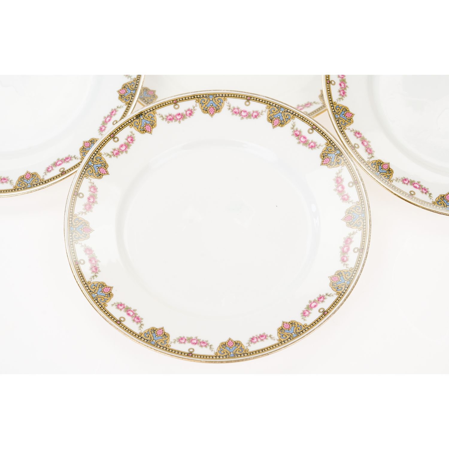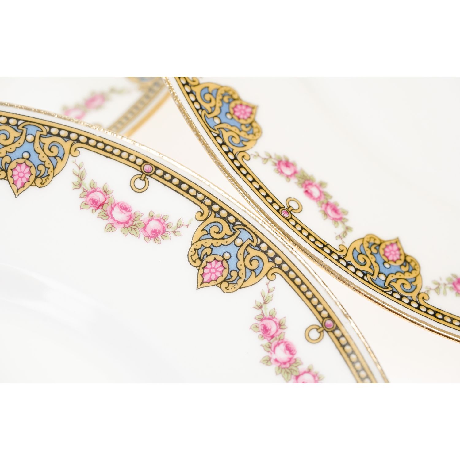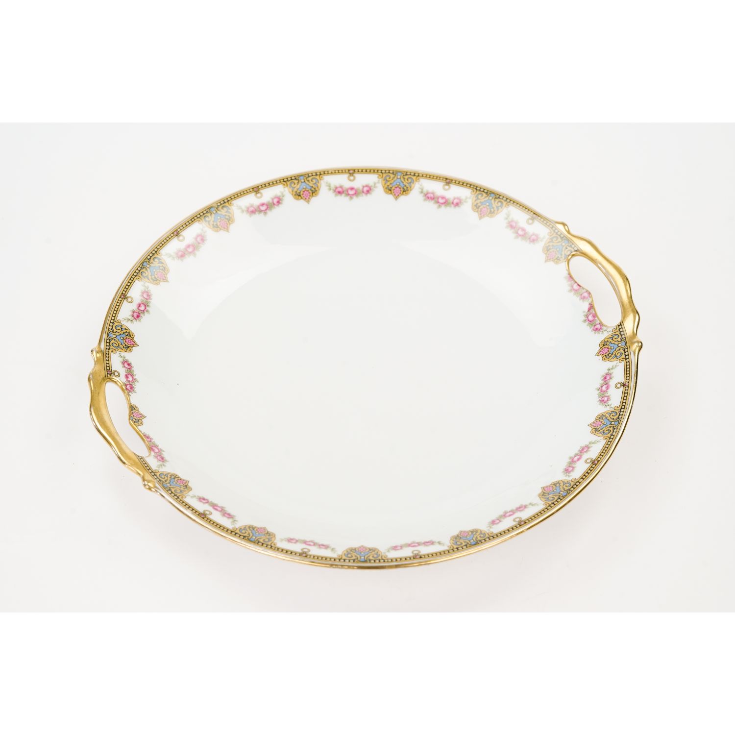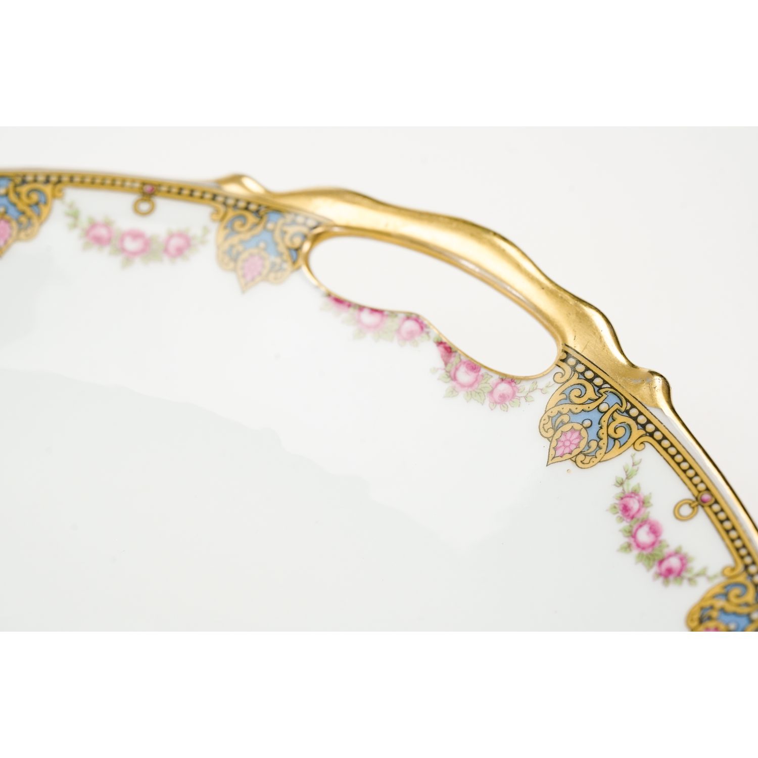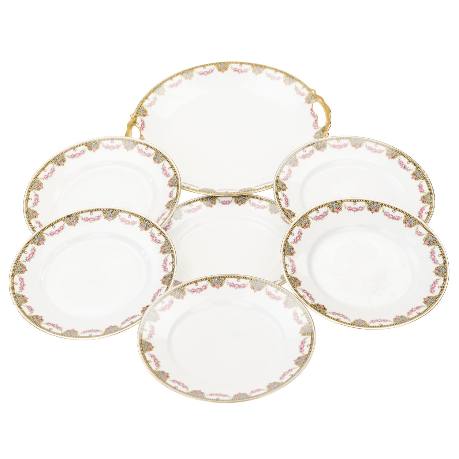 Uroczy serwis składający się z patery z uszami i sześciu talerzy deserowych ze wspaniałym wzorem dekoracyjnym w postaci przyjemnych szlaczków i girland różyczek. Oznaczona na podstawie „Jean Boyer” w kolorze niebieskim i „Limoges J. B. France” w kolorze zielonym.