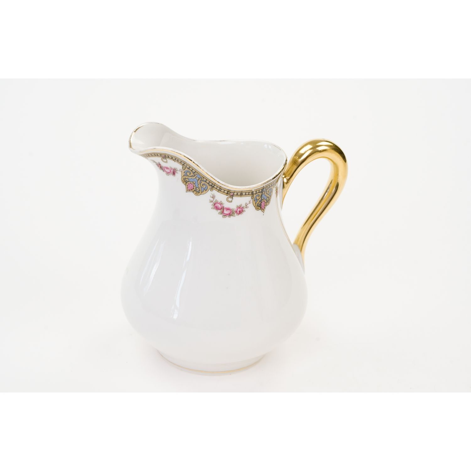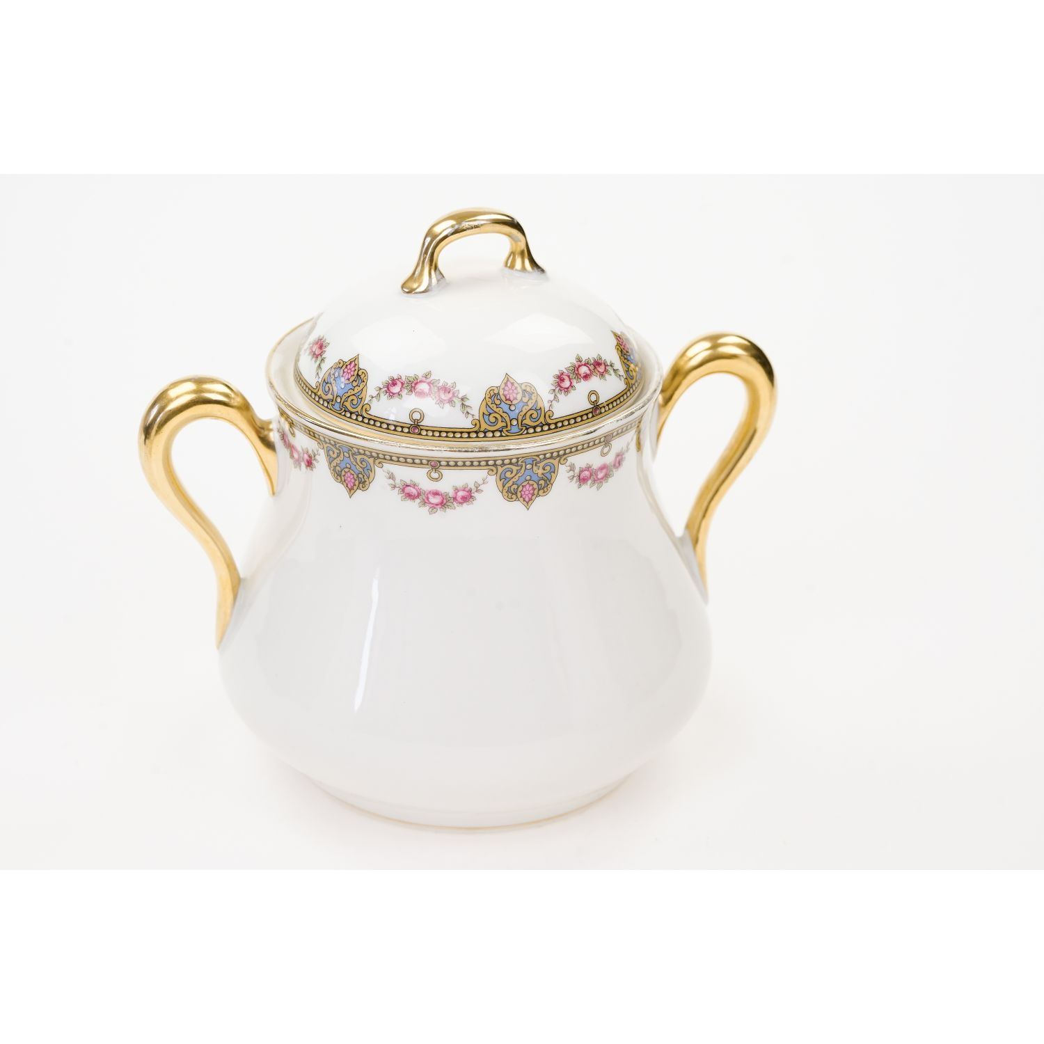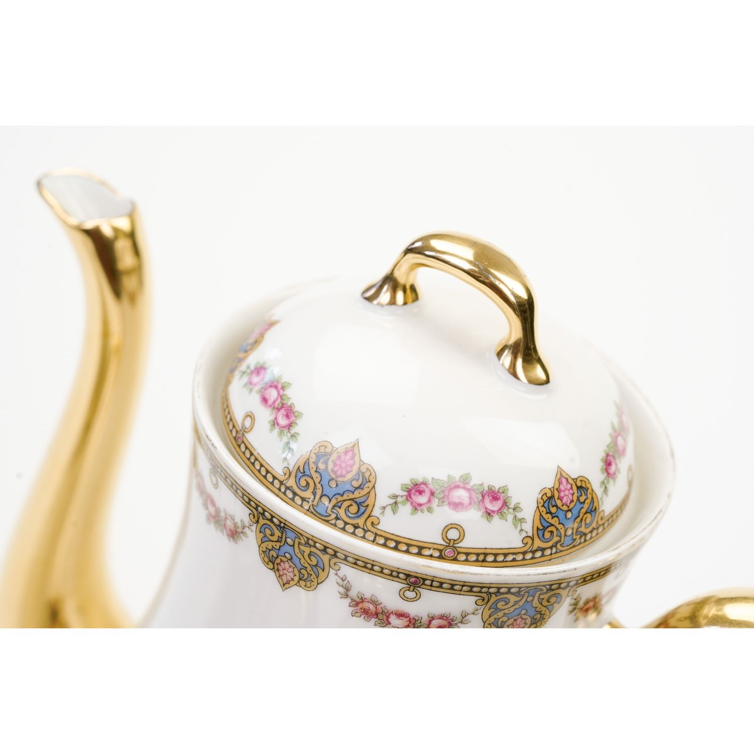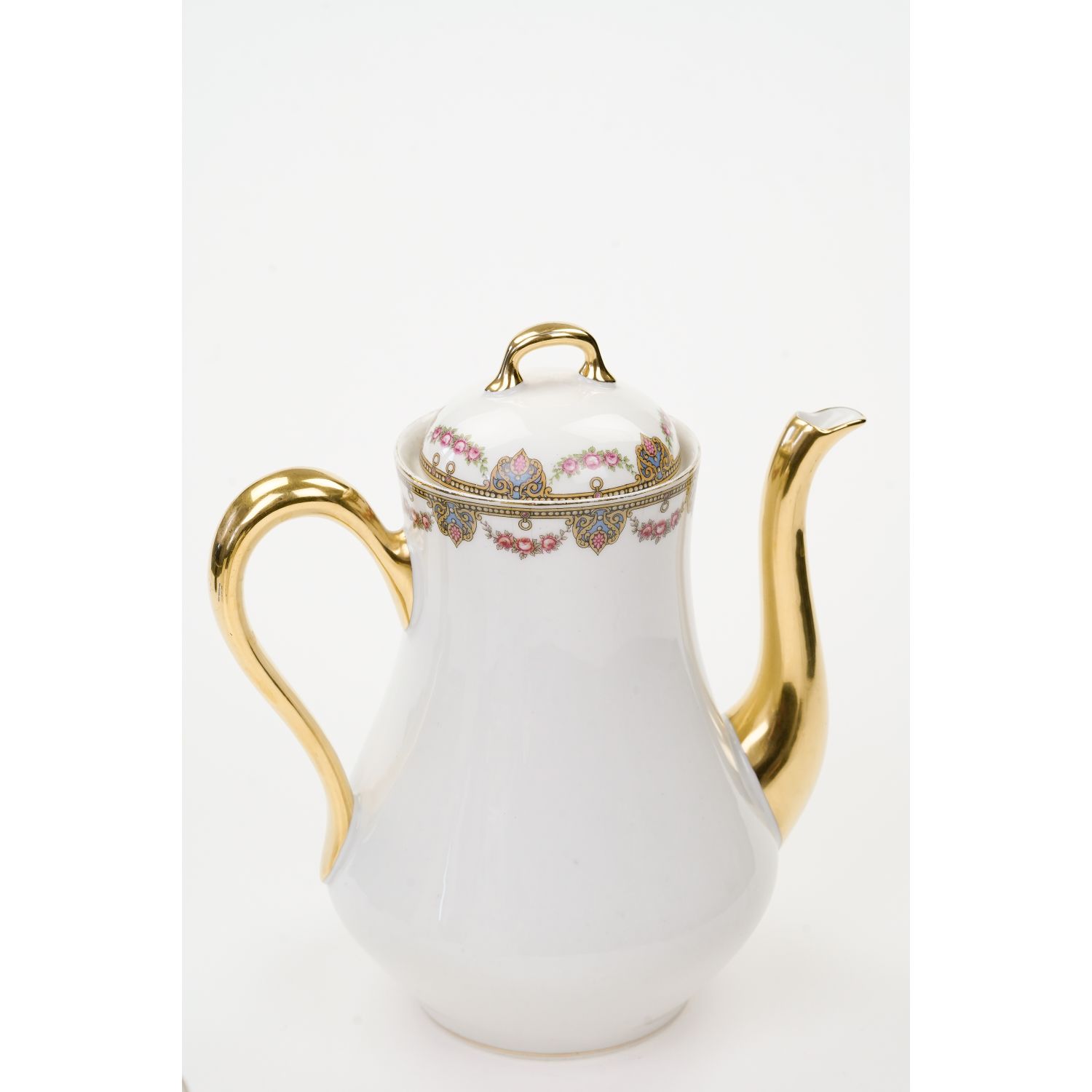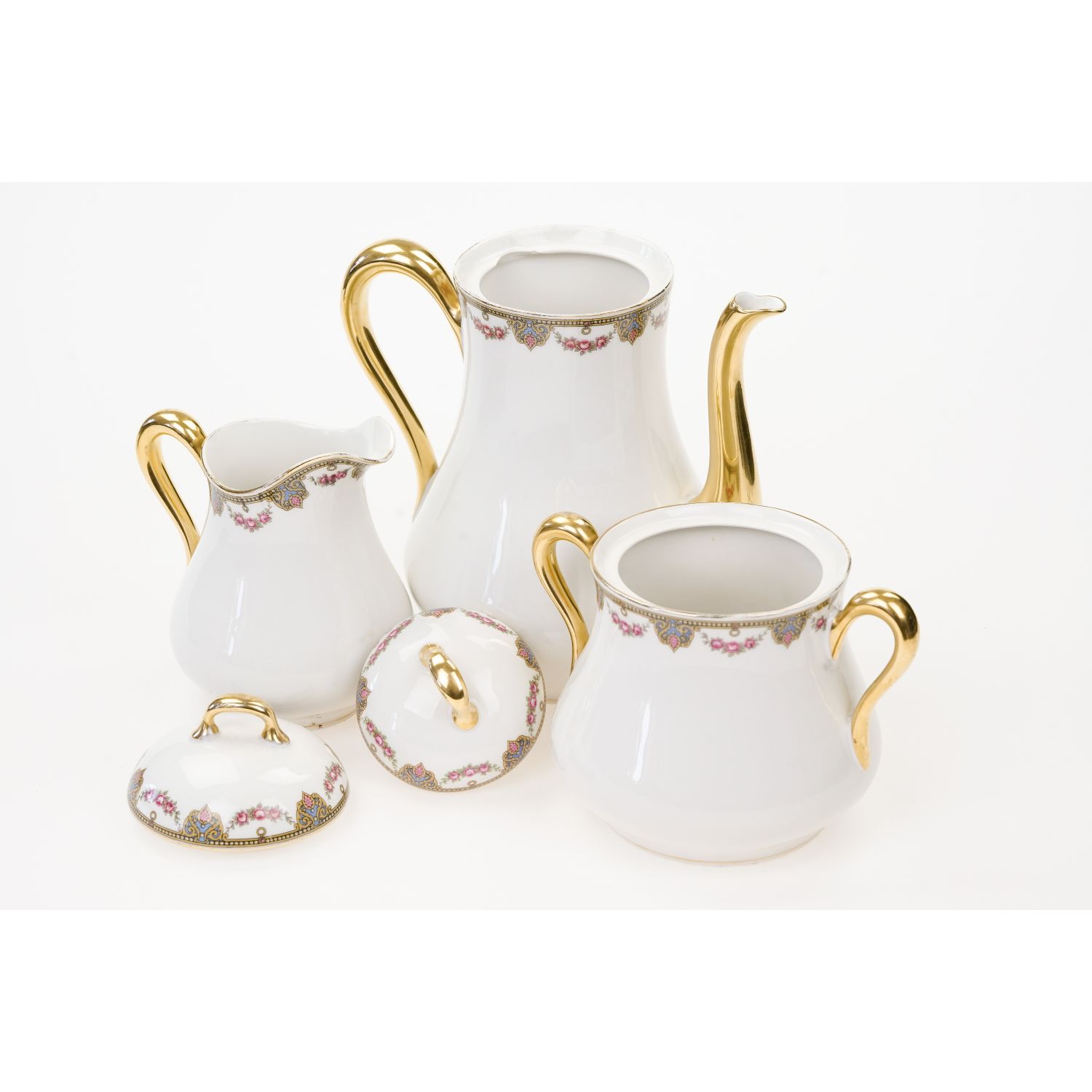 Uroczy garnitur składający się z dzbanka do kawy, cukiernicy i mlecznika ze wspaniałym wzorem dekoracyjnym w postaci przyjemnych szlaczków i girland różyczek. Oznaczona na podstawie „Jean Boyer” w kolorze niebieskim i „Limoges J. B. France” w kolorze zielonym.