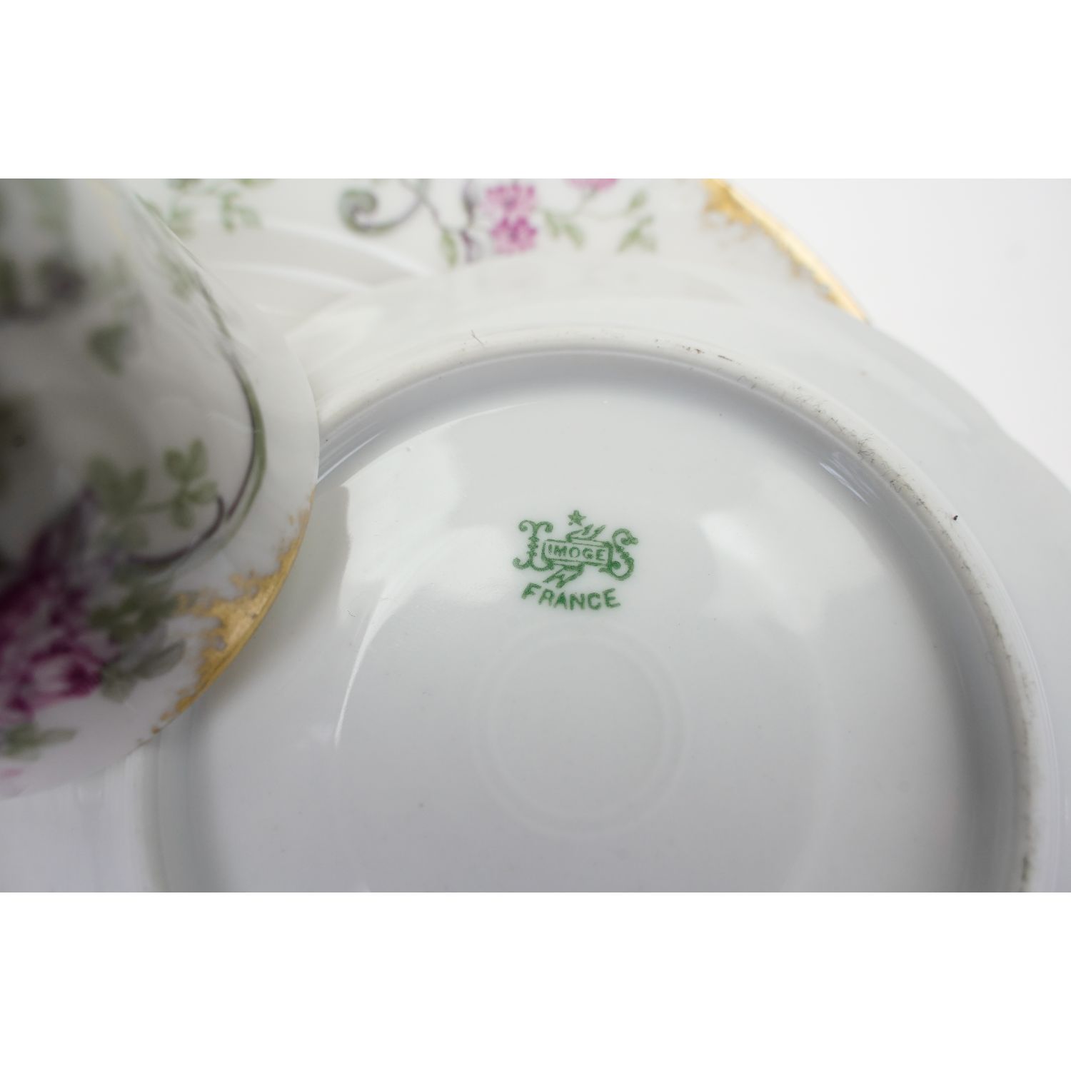 Pochodzi z Limoges z wytwórni Leon Sazerat & Blondeau. Sygnowana znakiem stosowanym od 1891 roku. Wczesne lata 90-te XIX wieku. W stylu secesyjnym. Wykonana z białej porcelany. Kontury podkreślono złoceniami. Na porcelanie fioletowe kwiaty różyczek. Rant oprószony zlotem.