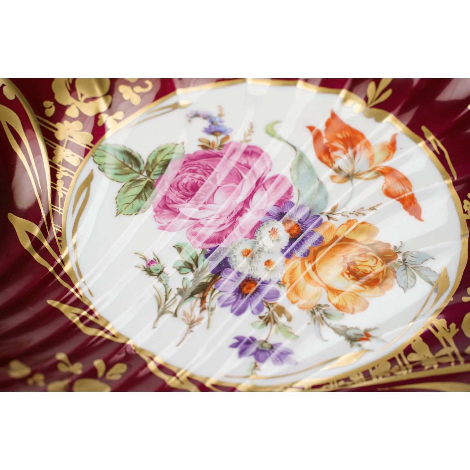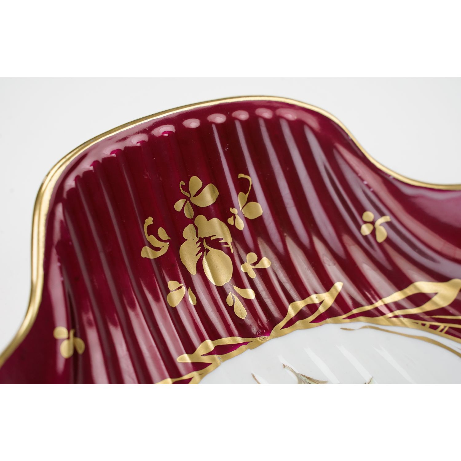 Pochodzi z Francji z Limoges. Sygnowana jak na zdjęciu. Wykonany z porcelany w odcieniu bieli. Ma formę muszli. Grubo złocona. Na lustrze malinowa malatura z ręcznie malowanymi kwiatami, które otaczają lustro na którym widnieje barwny bukiet kwiatów.