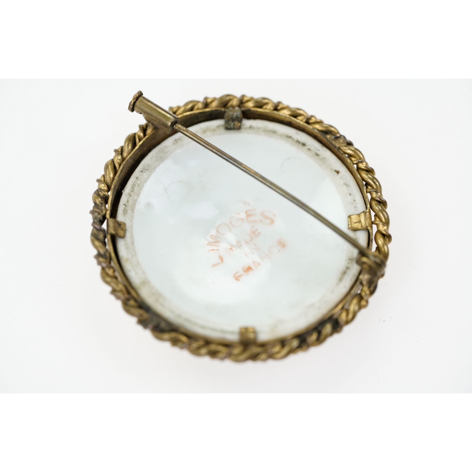 Piękna zabytkowa porcelanowa brosza z podobizną wiktoriańskiej damy w czerwonej sukni ręcznie podmalowywana. Pochodzi z lat 30-tych XX wieku. Pochodzi Francji z Limoges sygnowany znak „Limoges France”. Brosza ma okrągły kształt, porcelanowy medalion jest w kremowym kolorze, a na nim portret arystokratki.