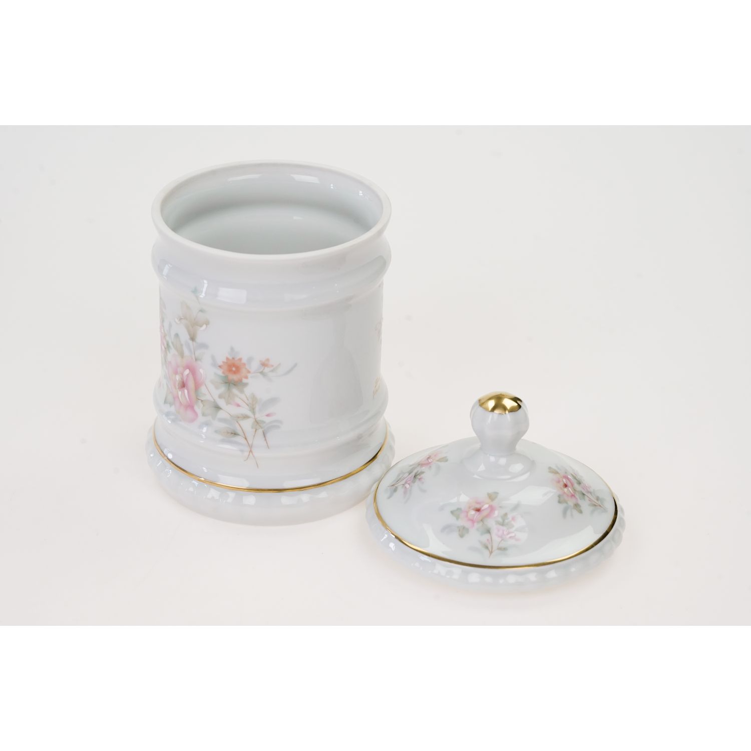 Sygnowany Limoges France. Na pojemniku większe i mniejsze kwiaty z sygnaturą artysty. Ranty złocone.