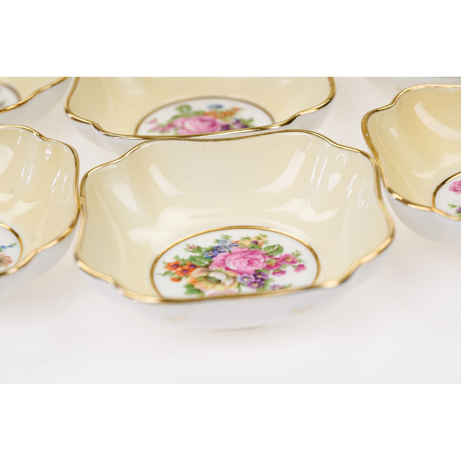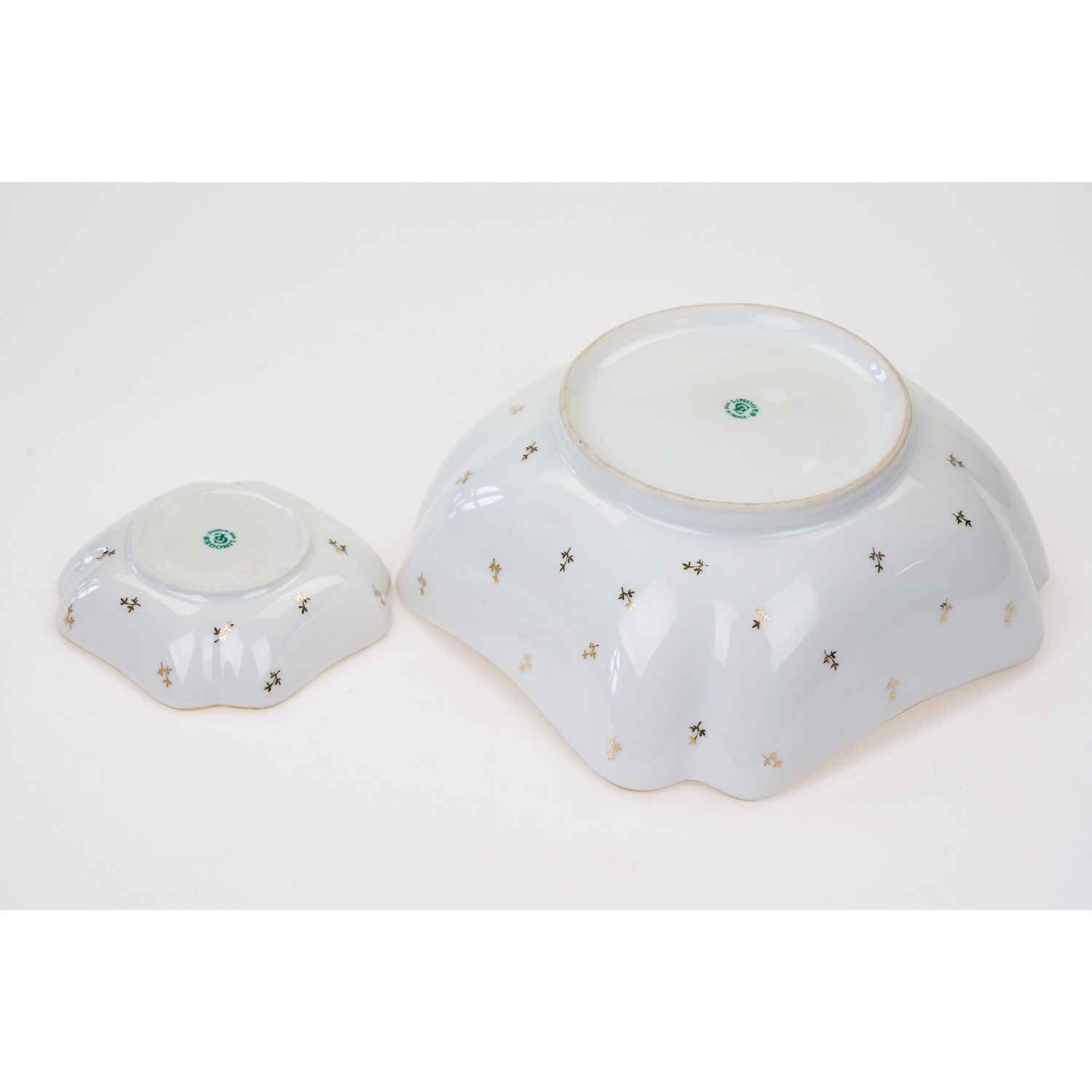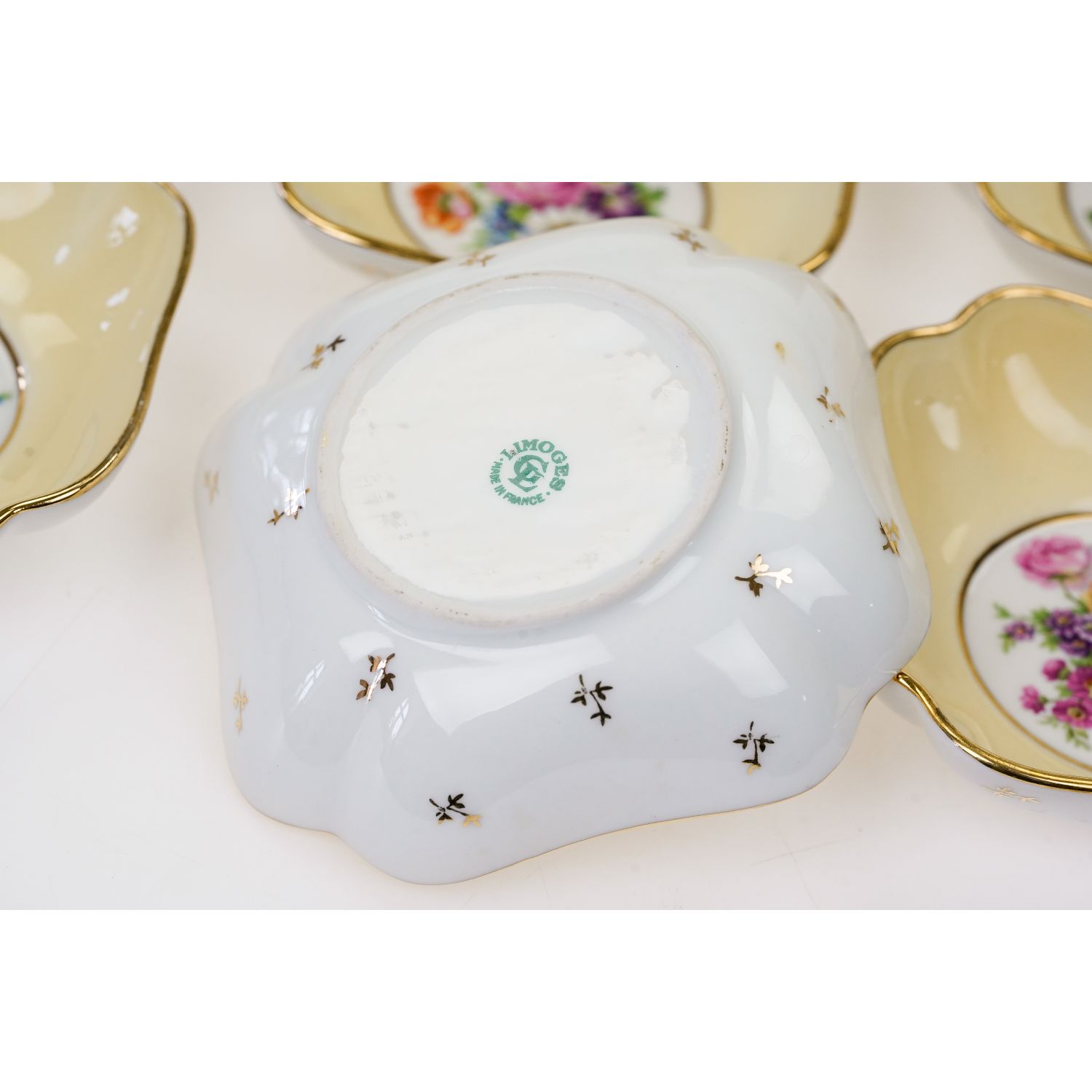 Pochodzi z Limoges. Sygnowany jak na zdjęciu. Wykonany z porcelany w od cieniu bieli. Wewnątrz ścianki pokryte żółtą malaturą. Na dnie każdego elementu inny, barwny bukiet kwiatów. Kontury złocone. Na zewnątrz ścianki dekorowane gałązkami ze złotymi listkami.