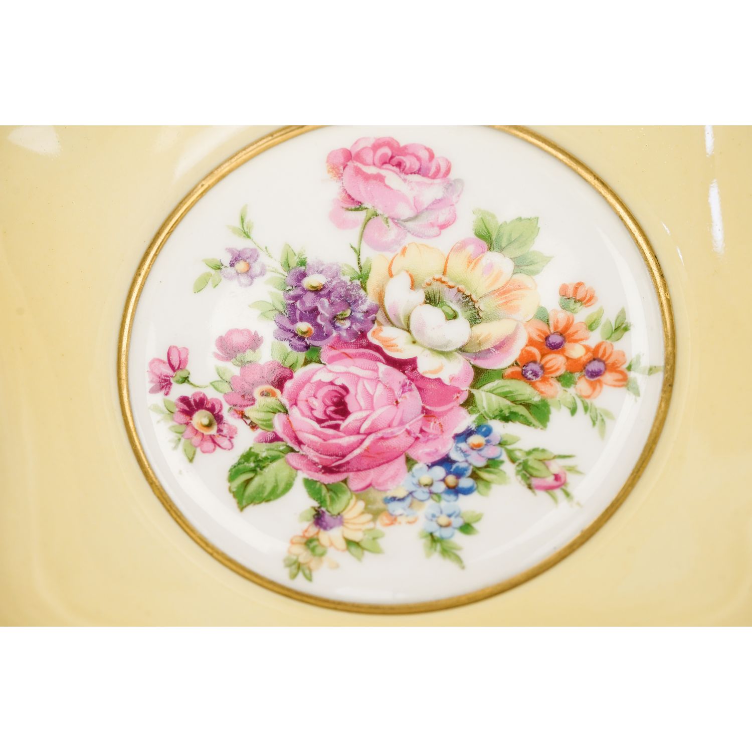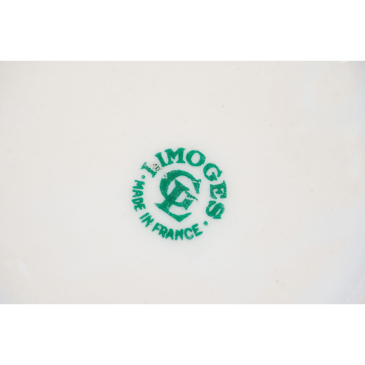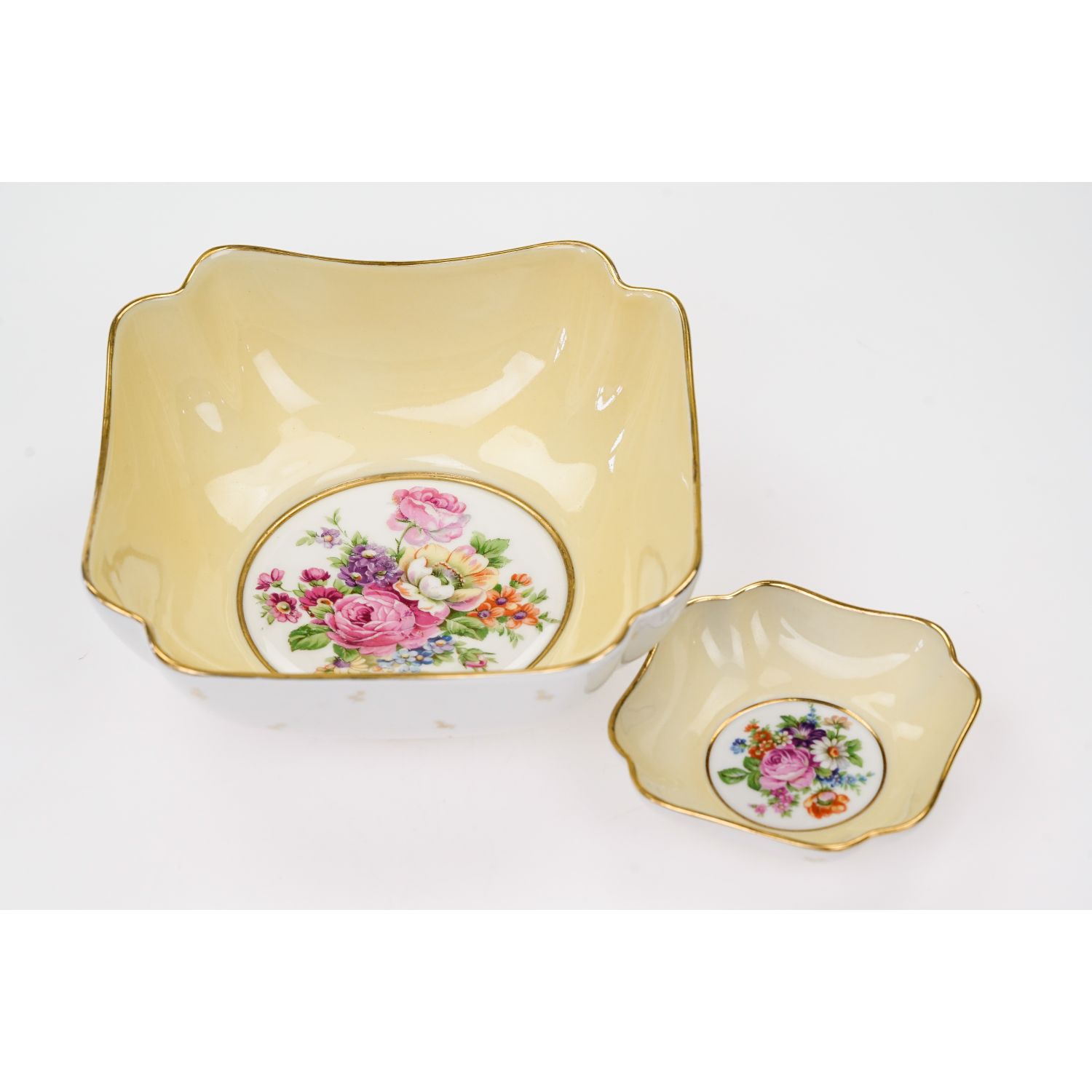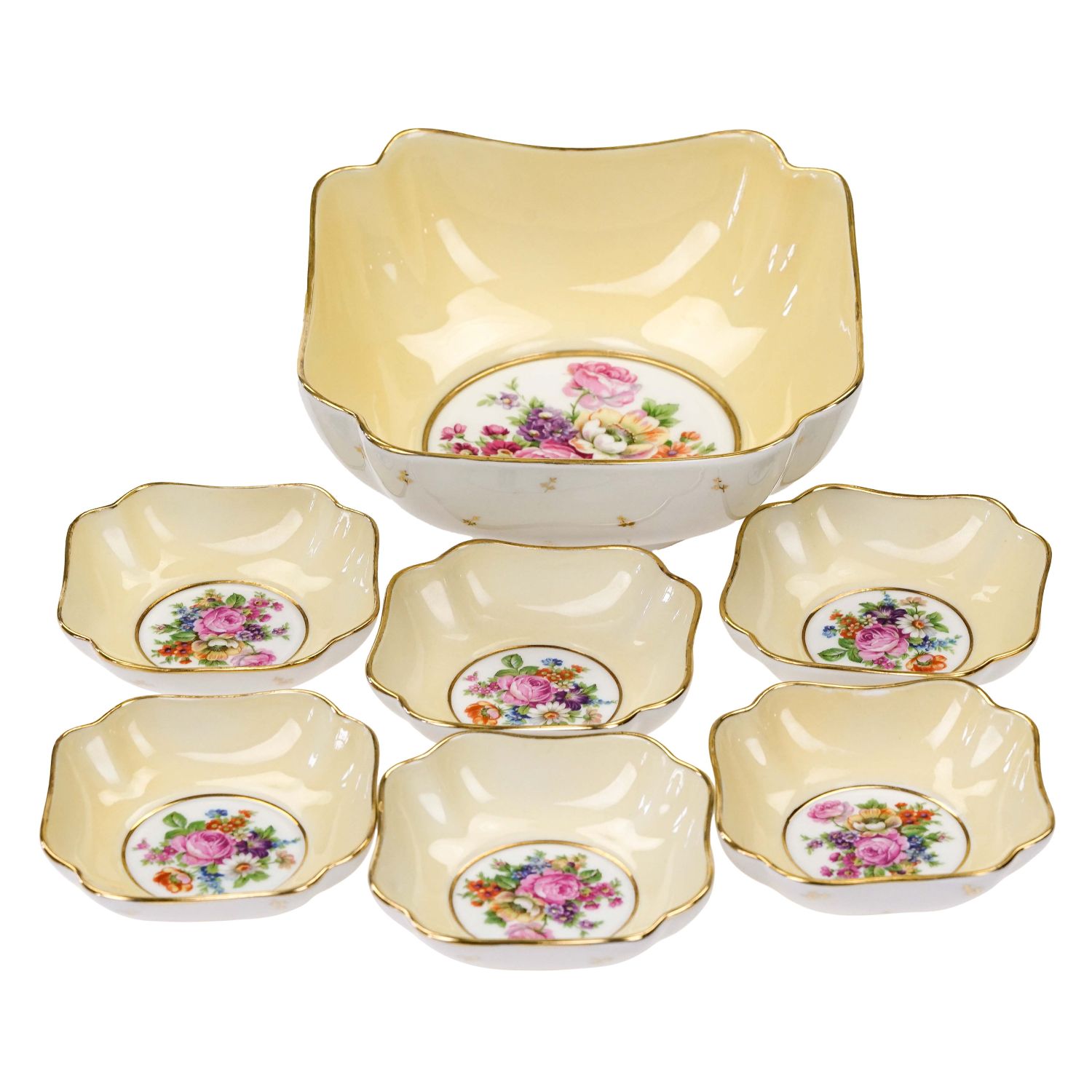Pochodzi z Limoges. Sygnowany jak na zdjęciu. Wykonany z porcelany w od cieniu bieli. Wewnątrz ścianki pokryte żółtą malaturą. Na dnie każdego elementu inny, barwny bukiet kwiatów. Kontury złocone. Na zewnątrz ścianki dekorowane gałązkami ze złotymi listkami.