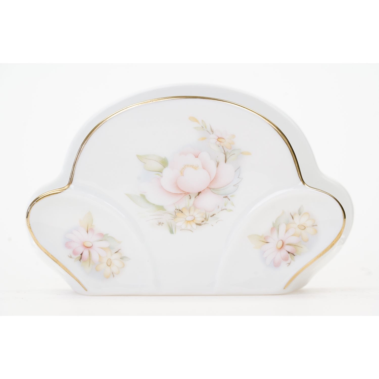 Pochodzi z Limoges, sygnowany “Porcelains TERNET Limoges France”. Z lat 50/60-tych XX wieku. Porcelana biała, szkliwiona. Ozdobiona gustownymi kwiatami lilii wodnej i stokrotek. Kontury z ręcznie nakładanym, delikatnym złoceniem.