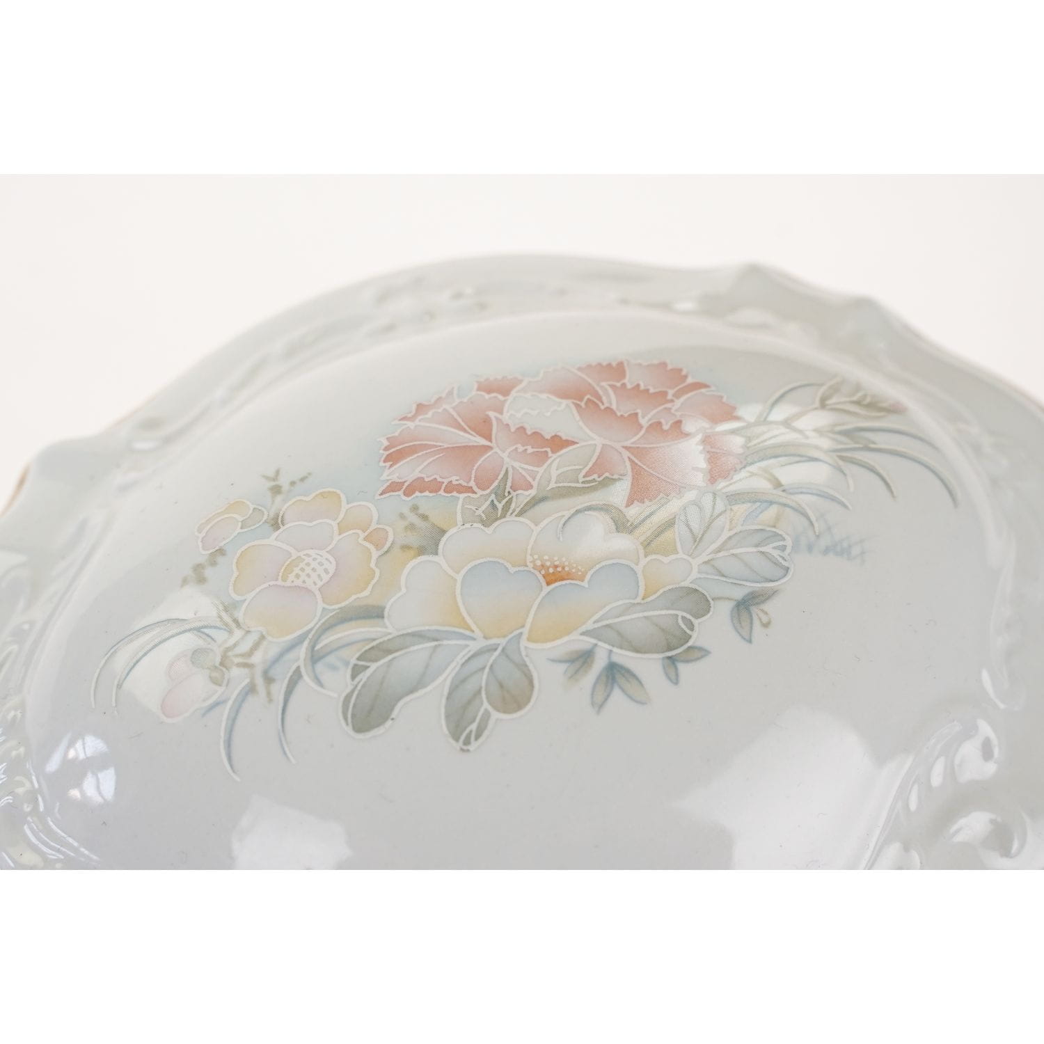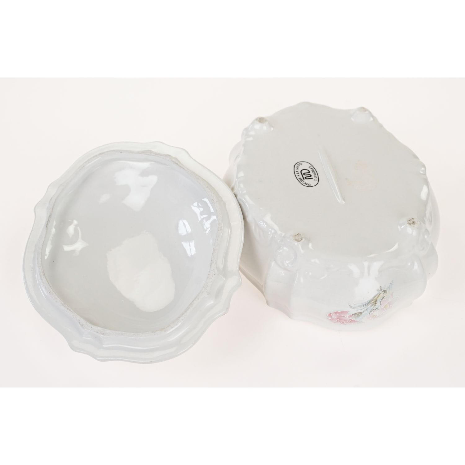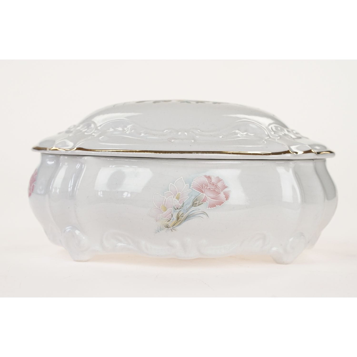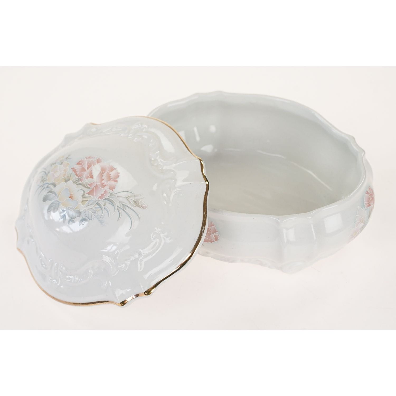 Pochodzi z Francji z Limoges. Sygnowane jak na zdjęciu. Porcelana w odcieniu bieli. Z wyrazistymi reliefami podkreślonymi ręcznie nakładanymi złoceniami, Dodatkowo na pokrywie i na ściankach dekoracje przedstawiające pastelowe kwiaty.