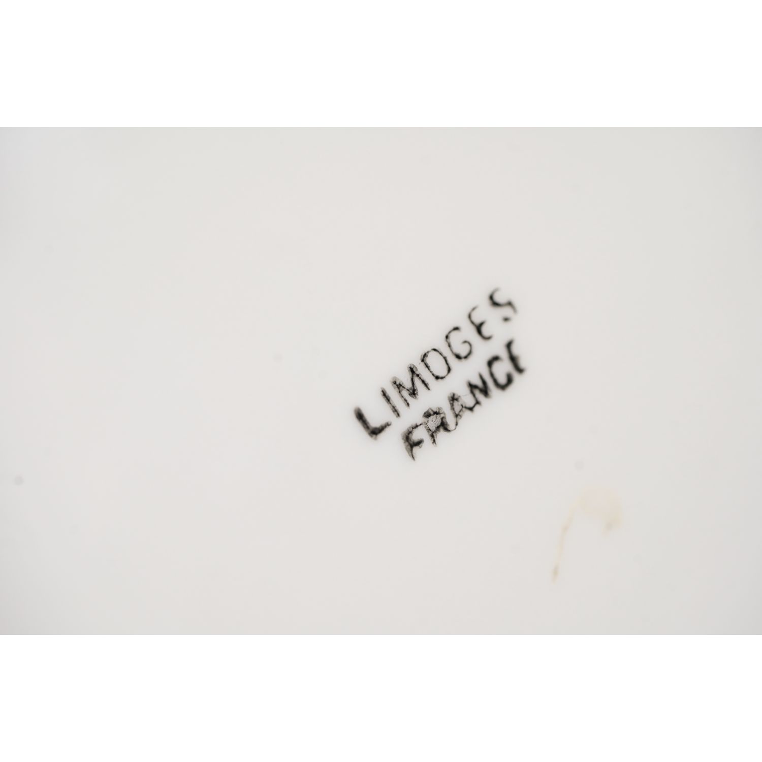 Pochodzi z Limoges, sygnowany jak na zdjęciu. Wykonany z białej porcelany, pokrytej drobniutkimi reliefami, brzuchaty w dolnej części. Na niej girlandy różyczek i roślinne szlaczki. Krawędzie pokryte nieregularnymi złoceniami. Tyle dekoracji na tak małej powierzchni!