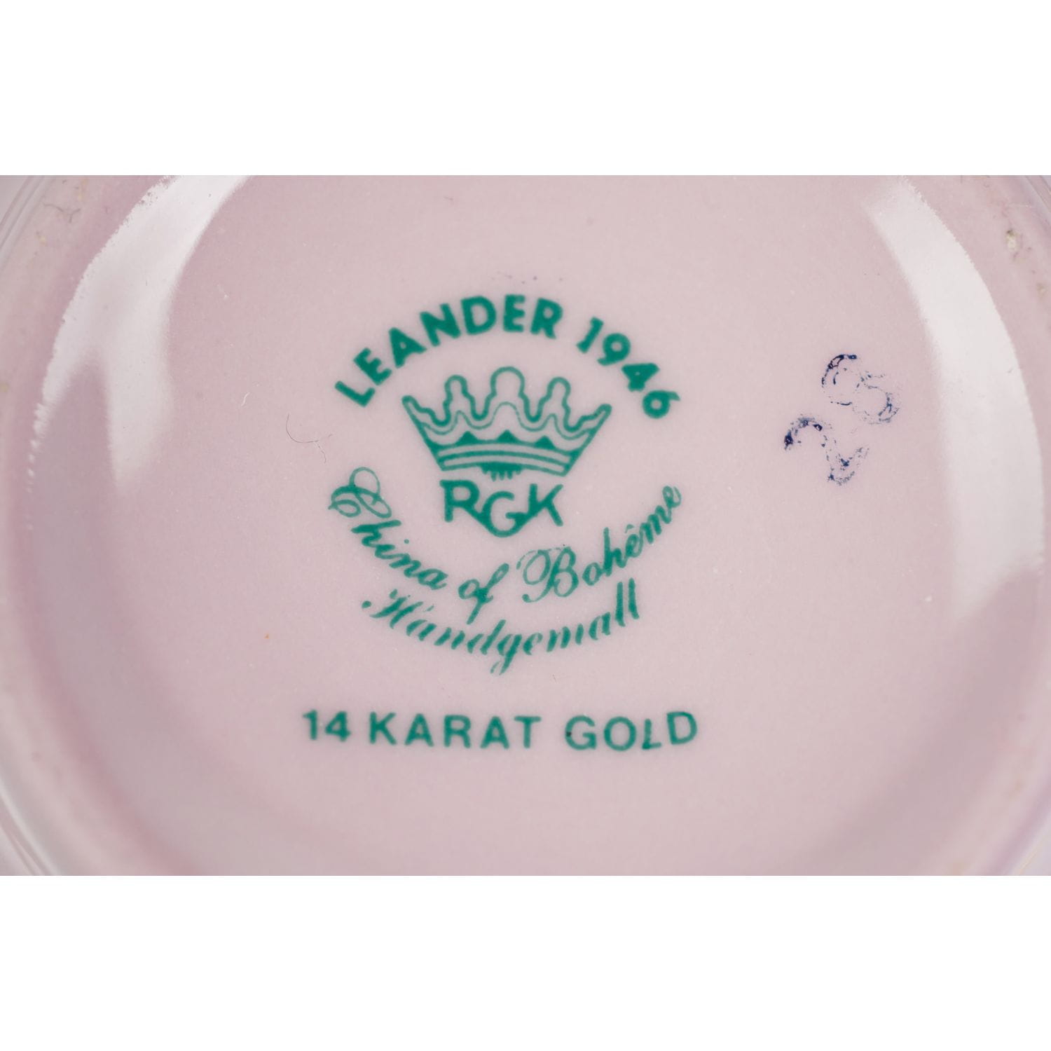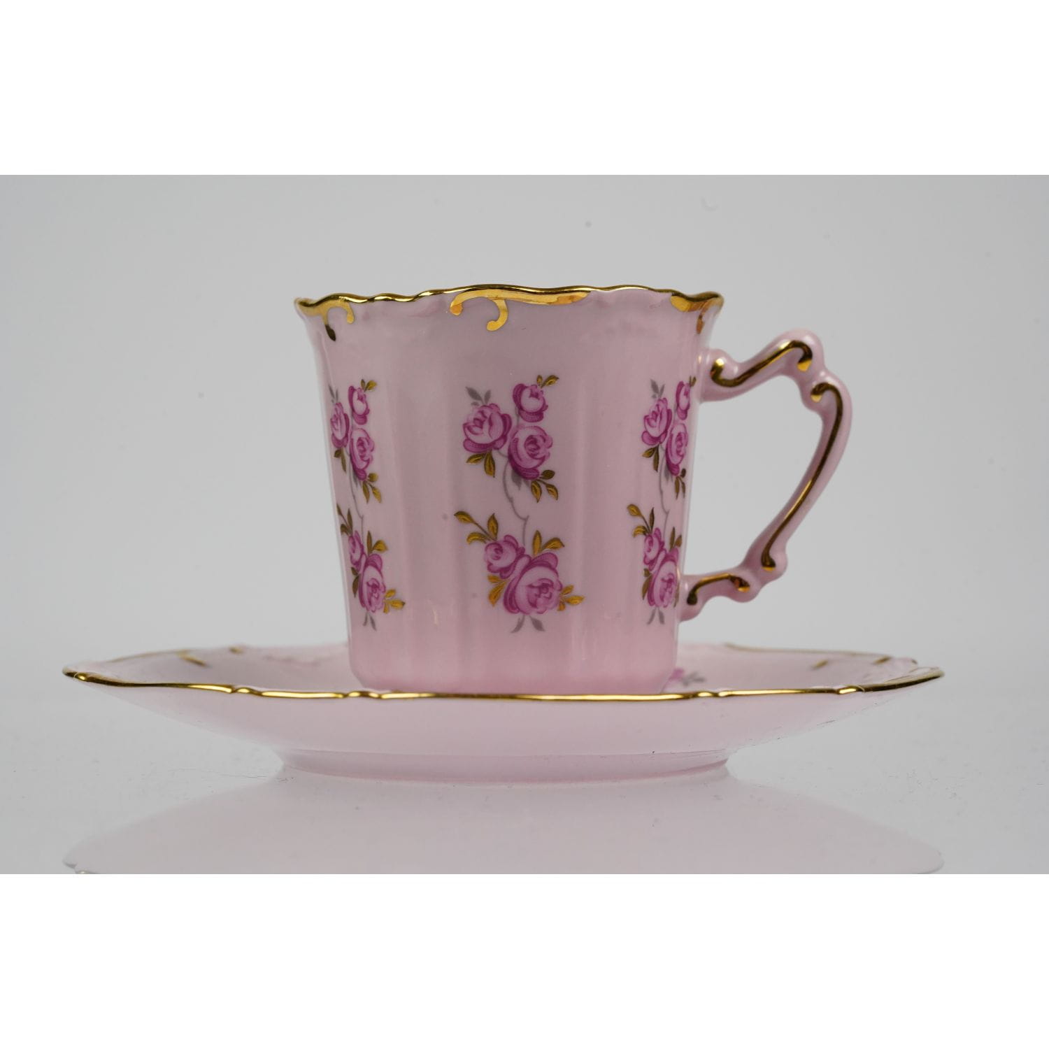 Pochodzi z Czech z miejscowości Loučky z Karlovarský Porcelán (Leander). Fason Amis. Porcelana różowa, którą otrzymuje się dzięki dodatkowi złota. Śliczna forma dekorowana niezwykłymi, przepięknymi, wyrazistymi reliefami przy krawędziach. Reliefy bardzo subtelne. podkreślone złoceniami. Na porcelanie bukiety różyczek.