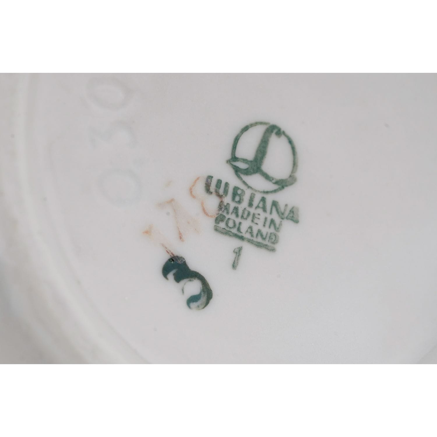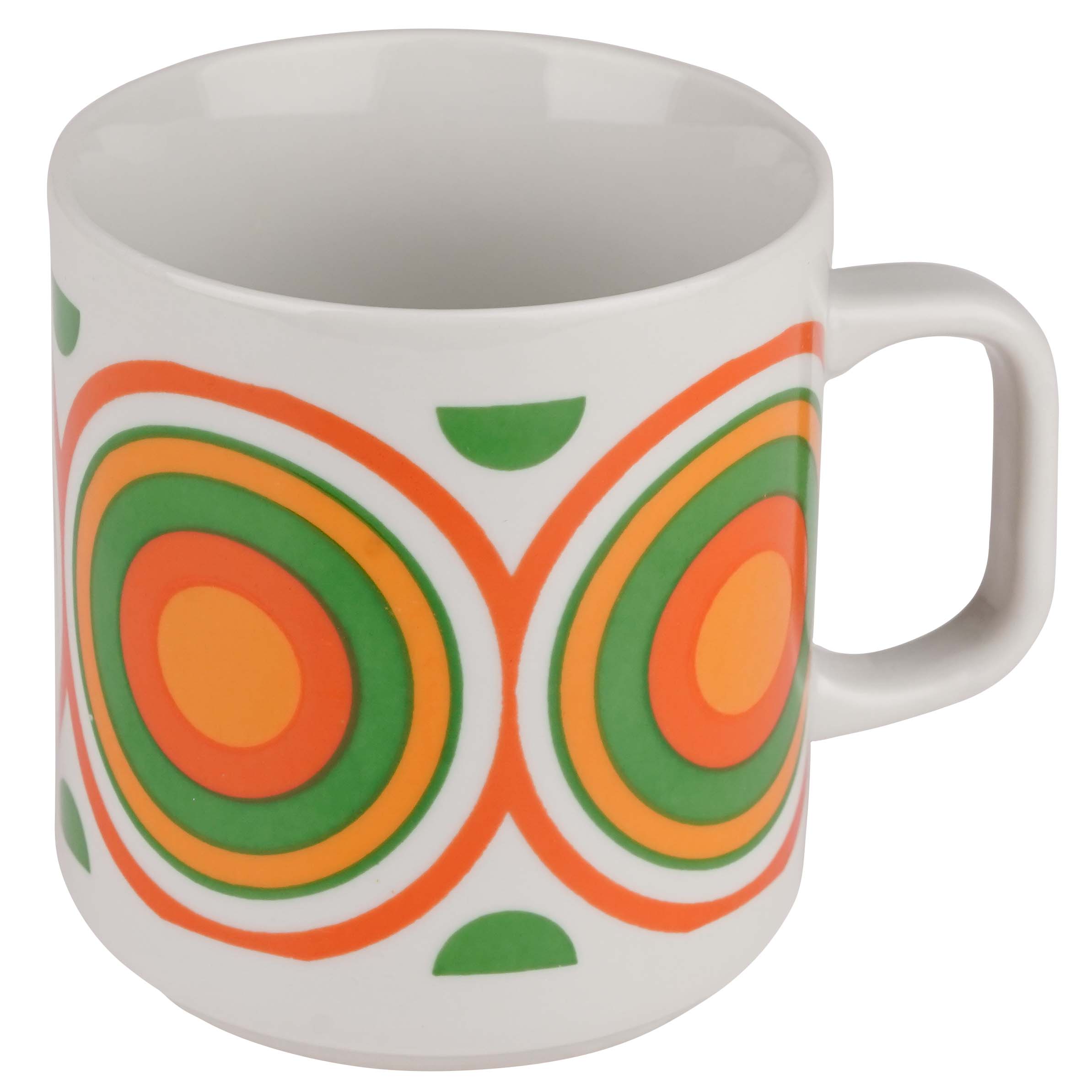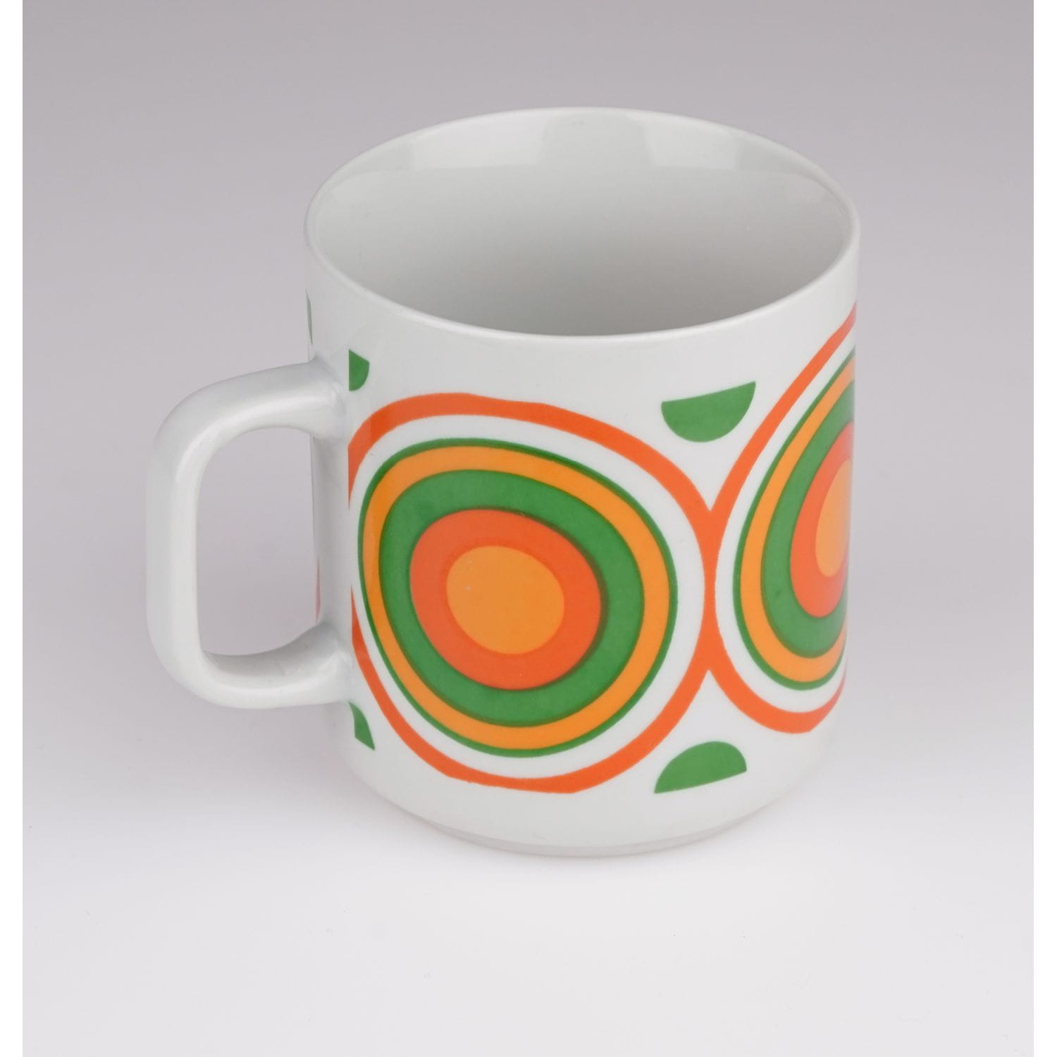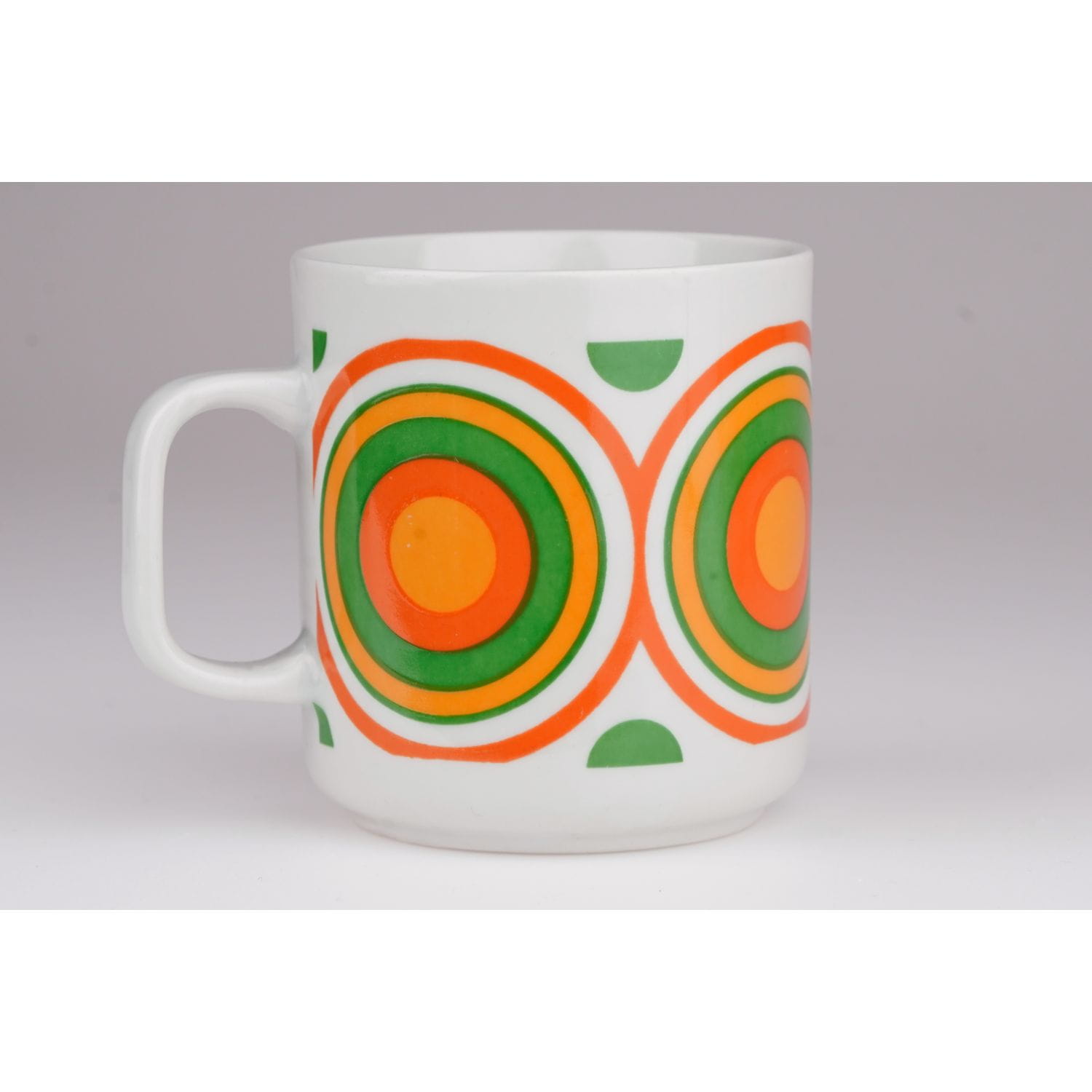 Wykonany przez wytwórnię porcelany Lubiana ("Lubiana" Zakłady Przemysłu Ceramicznego, PP Pomorze, Łubiana), lata 70-te XX wieku. Wykonany z solidnej porcelany w odcieniu bieli. Prosty kształt z poręcznym uszkiem. Zdobiony zielono- pomarańczowo-żółtym dużym wzorem o motywie kół, kręgów wpisujących się w stylistykę op-art.