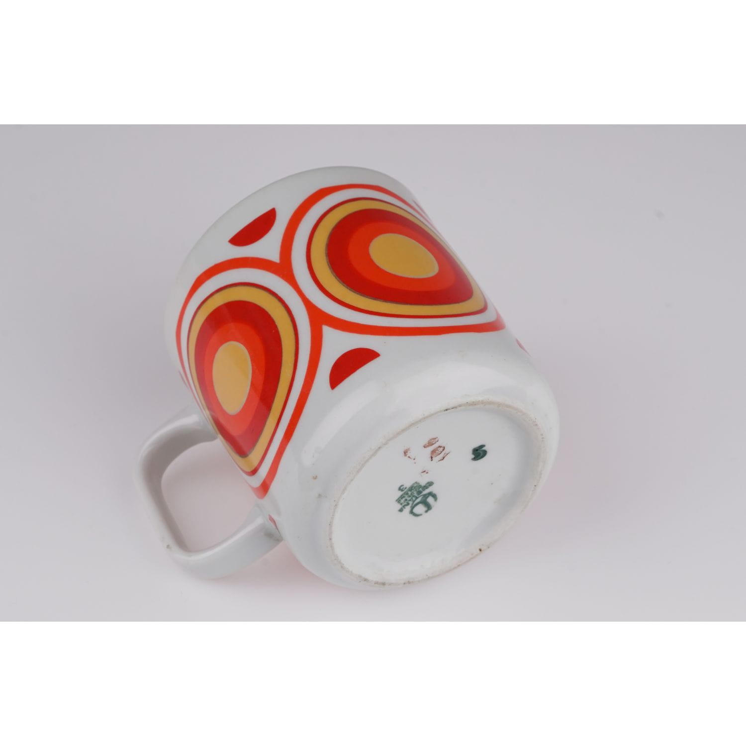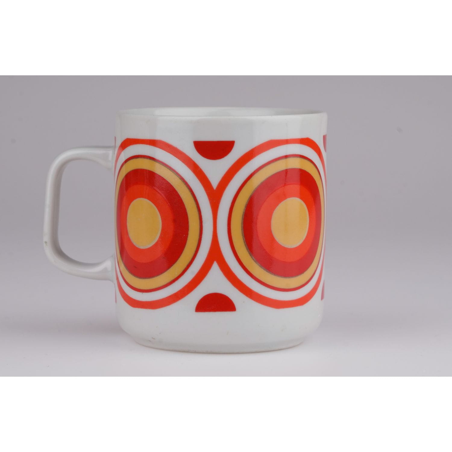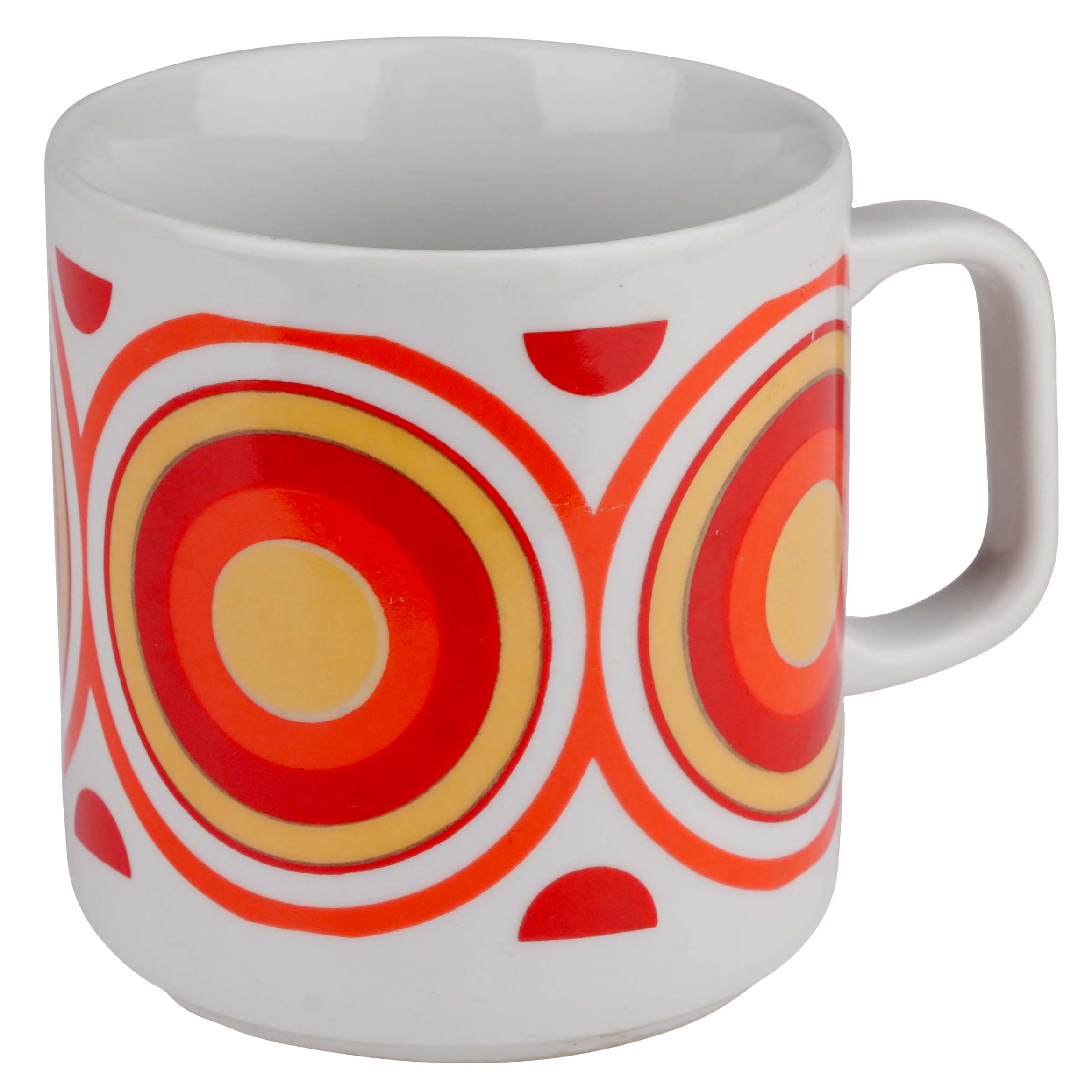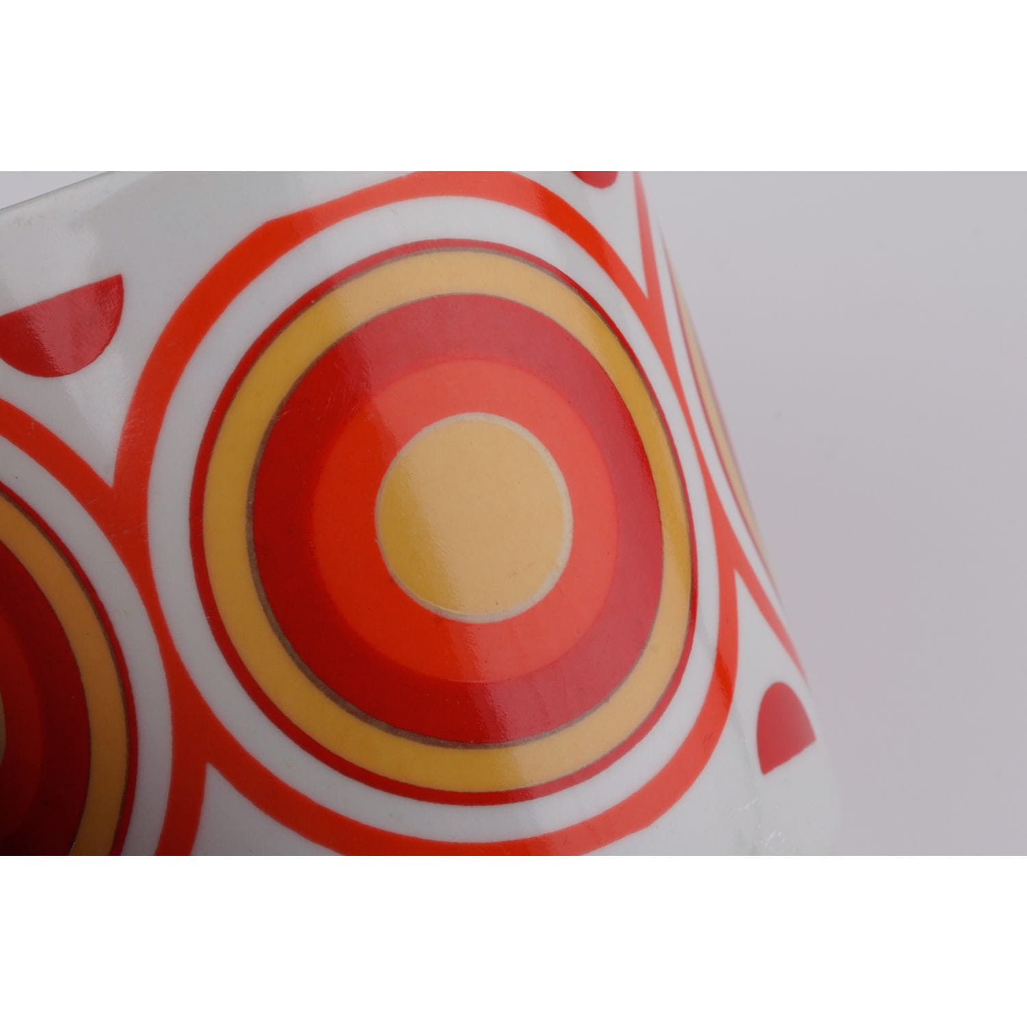 Wykonany przez wytwórnię porcelany Lubiana ("Lubiana" Zakłady Przemysłu Ceramicznego, PP Pomorze, Łubiana), lata 70-te XX wieku. Wykonany z solidnej porcelany w odcieniu bieli. Prosty kształt z poręcznym uszkiem. Zdobiony czerwono- pomarańczowo-żółtym dużym wzorem o motywie kół, kręgów wpisujących się w stylistykę op-art.