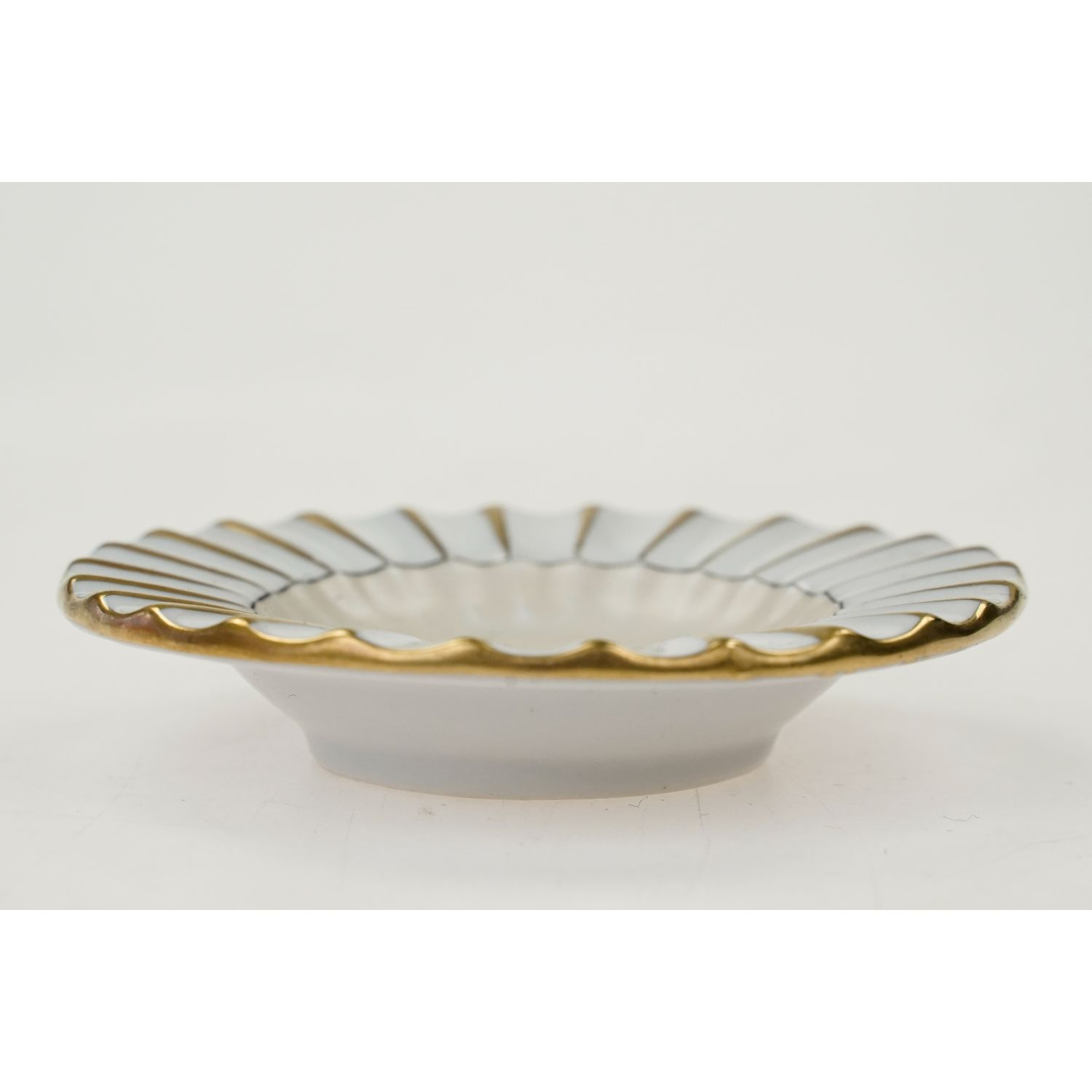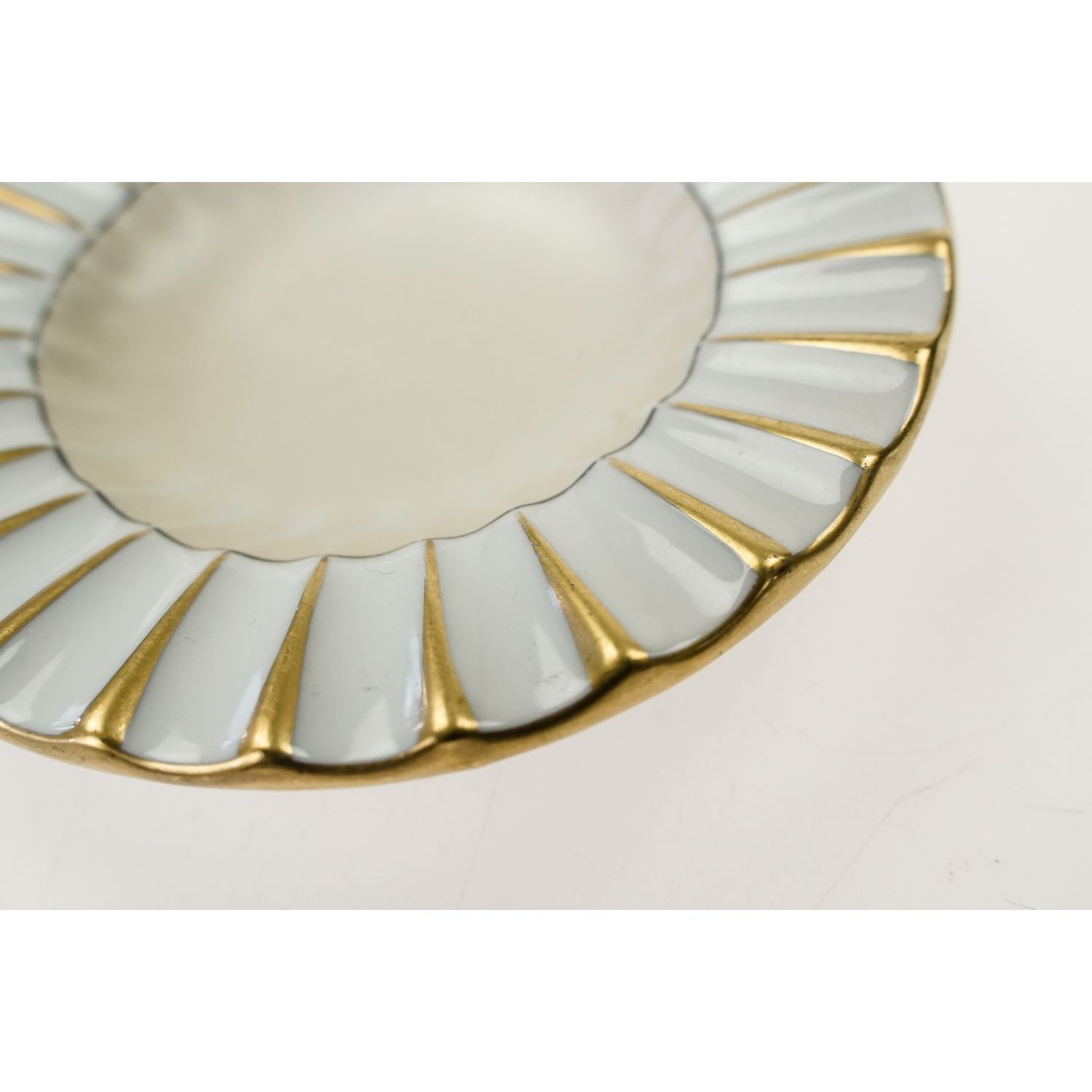 Porcelana biała, ręcznie malowana na beżowy kolor na lustrze w czarnej obwódce. Oryginalna produkcja z lat 1936-40. Duński styl. Projekt z eleganckim, wypukłym wzorem na krawędziach, który wyglądają jak plisowane, podkreślone złoceniami. Projekt przypisuje się Frankowi Lensfortowi i wyprodukowano w fabryce porcelany Lyngby.