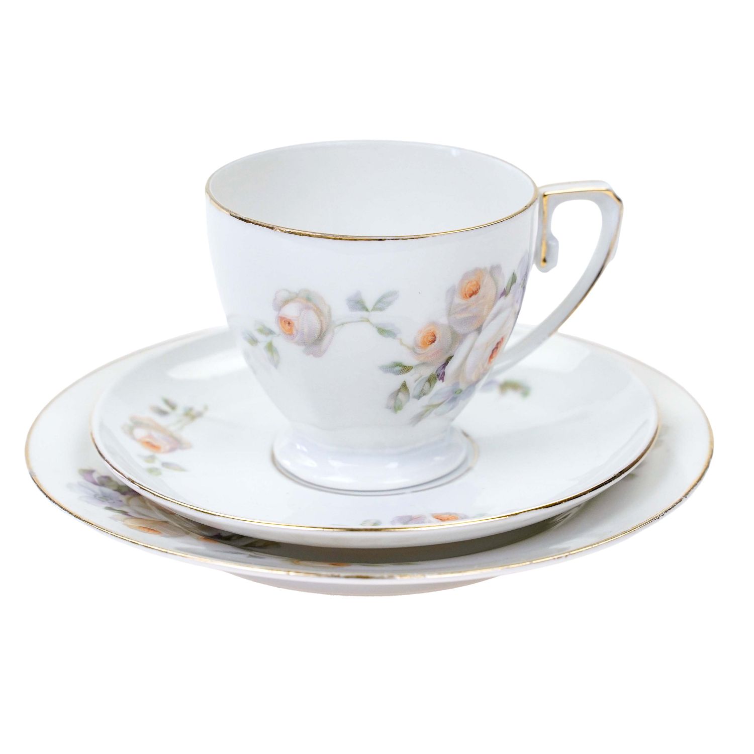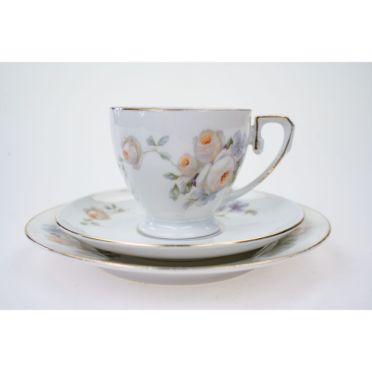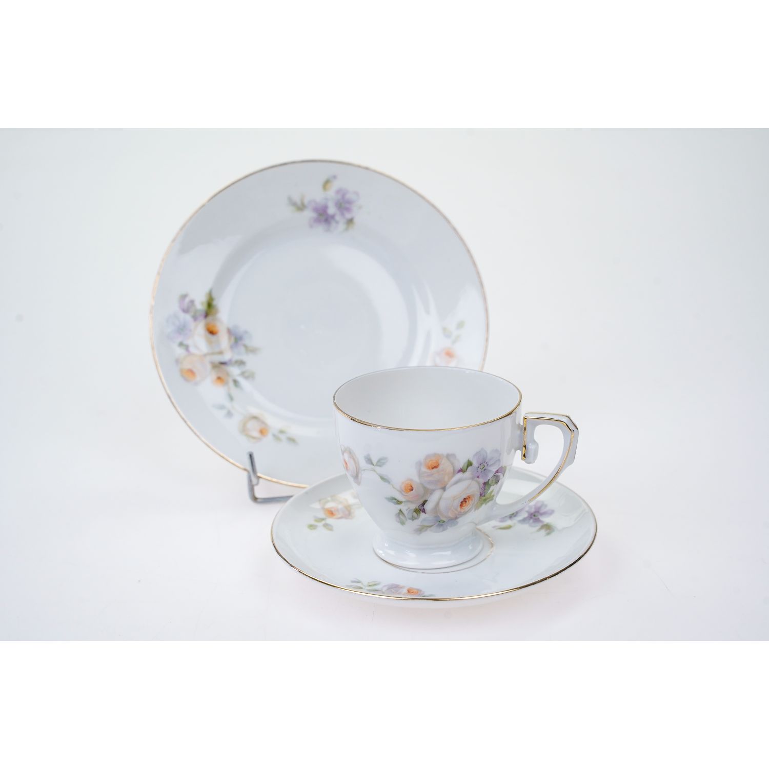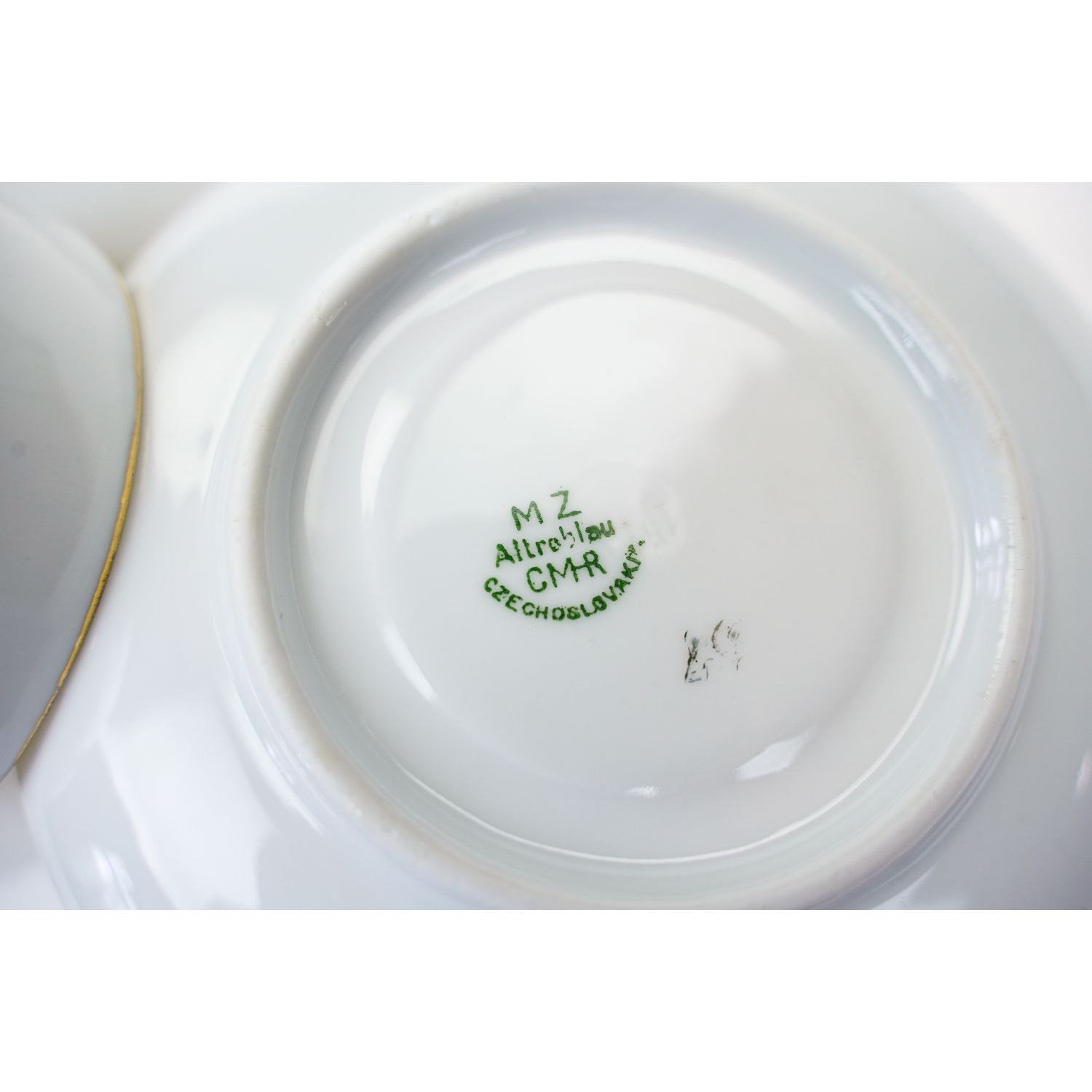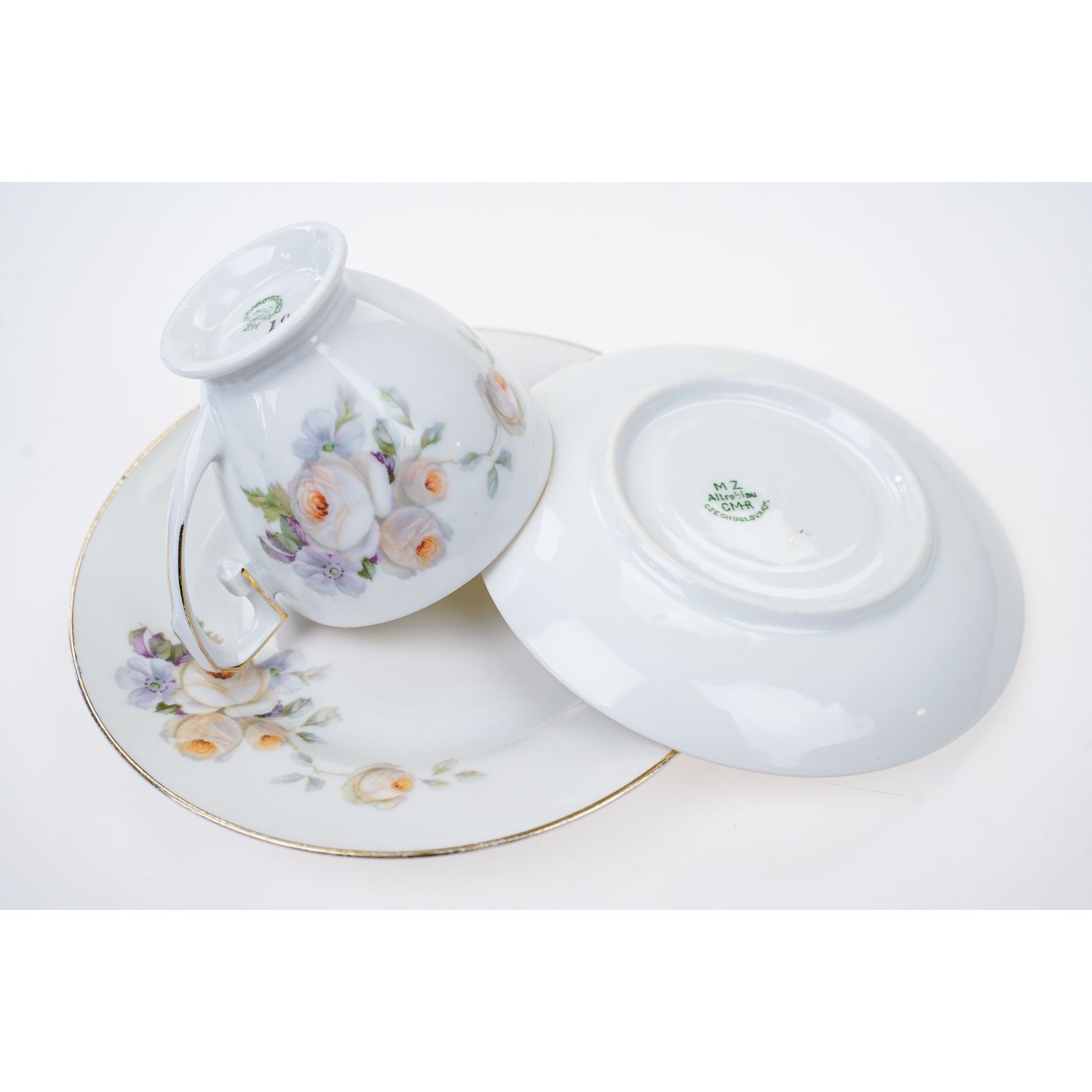 Pochodzi z terenów obecnych Czech z Altrohlau z Altrohlauer Porzellan-Fabriken AG. Sygnowany znakiem stosowanym od 1909 roku, kiedy firmę kupił C.M. Hutschenreuther. Porcelana biała o prostej formie z uszkiem w kształcie litery "J". Ozdobiona bukietami różyczek i fiołków oraz złoceniami na konturach. Świetne formy z rzędem perlatury przy stopie filiżanki.