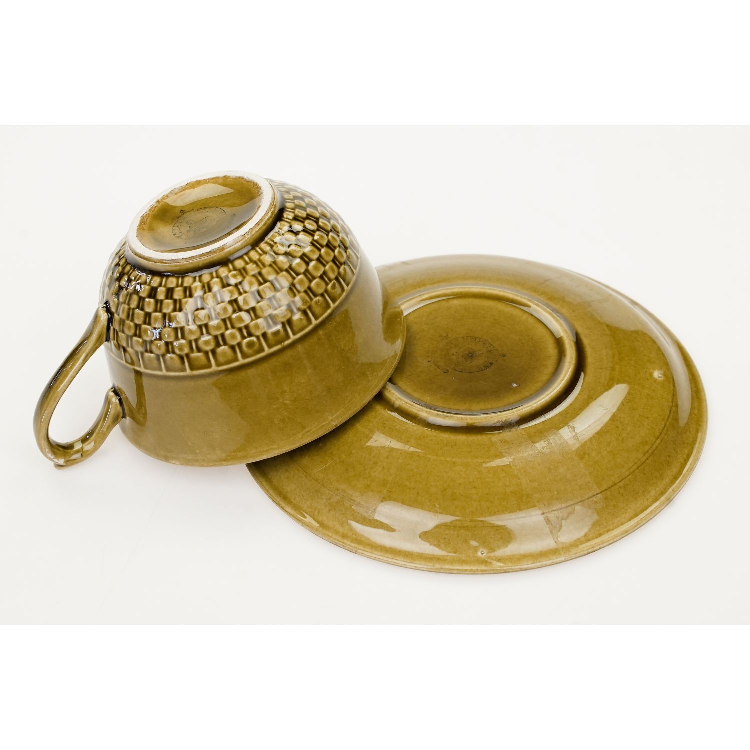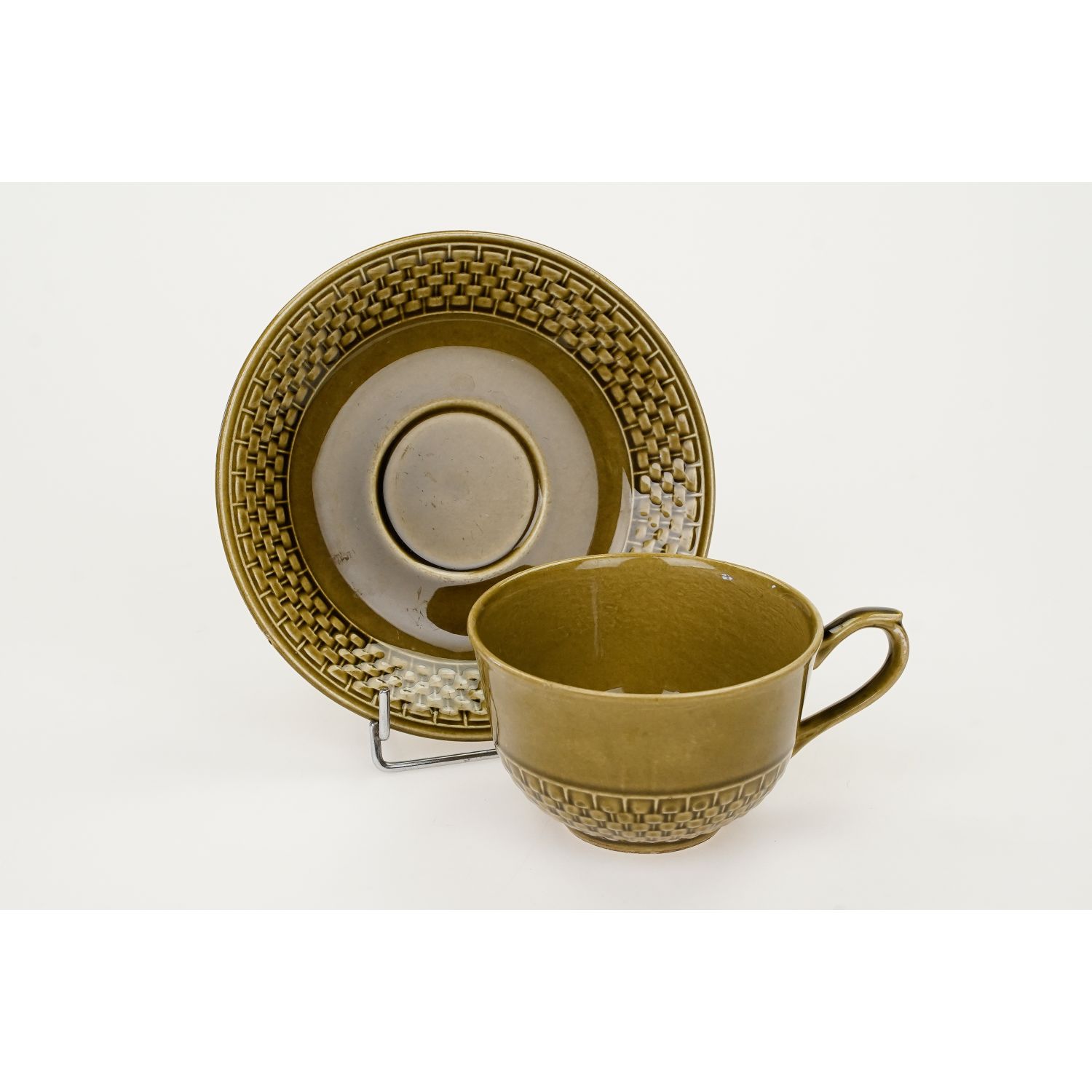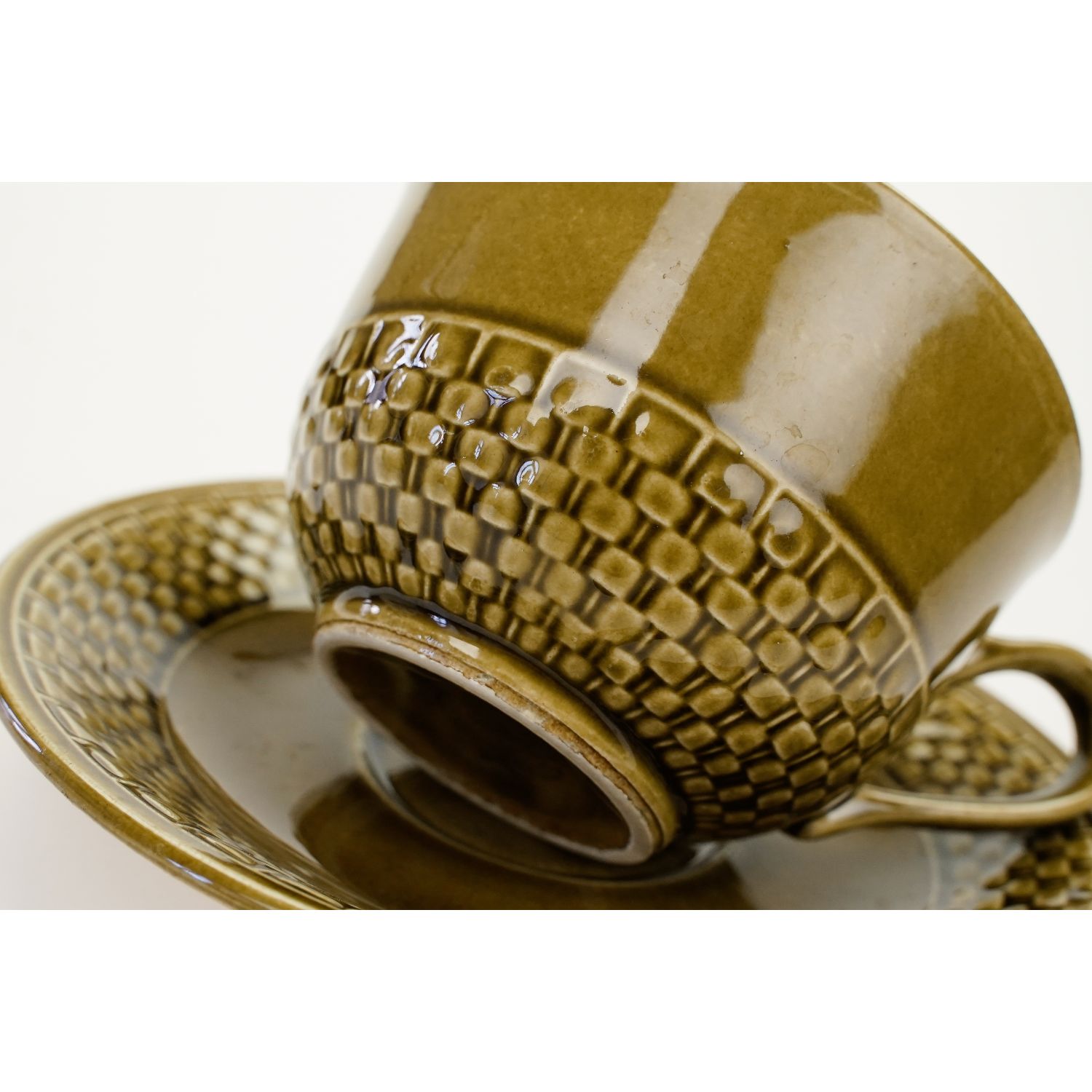 Całość w kolorze oliwkowym. Na kołnierzyku spodka i w dolnej części filiżanki reliefy imitujące plecionkę wiklinowego koszyka.