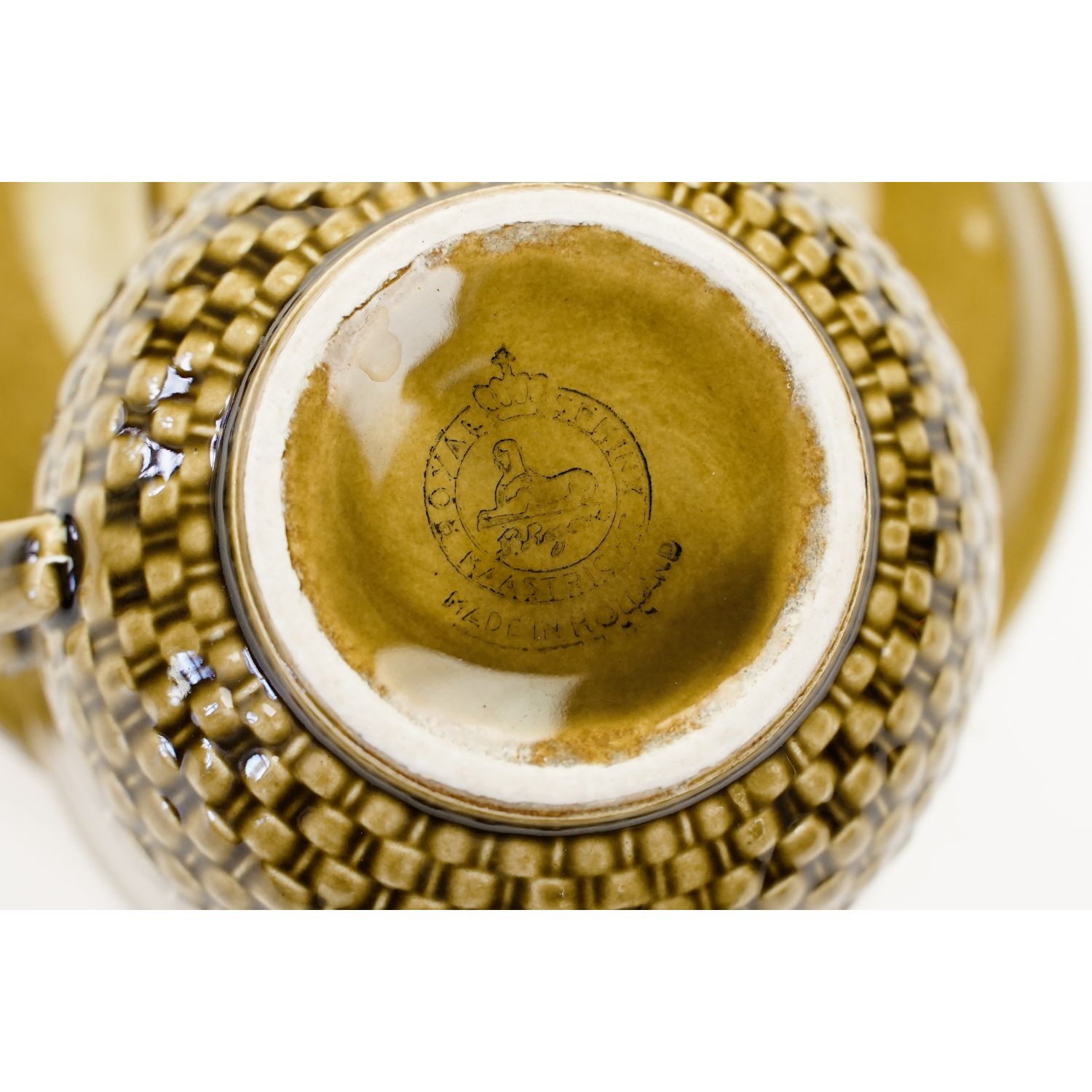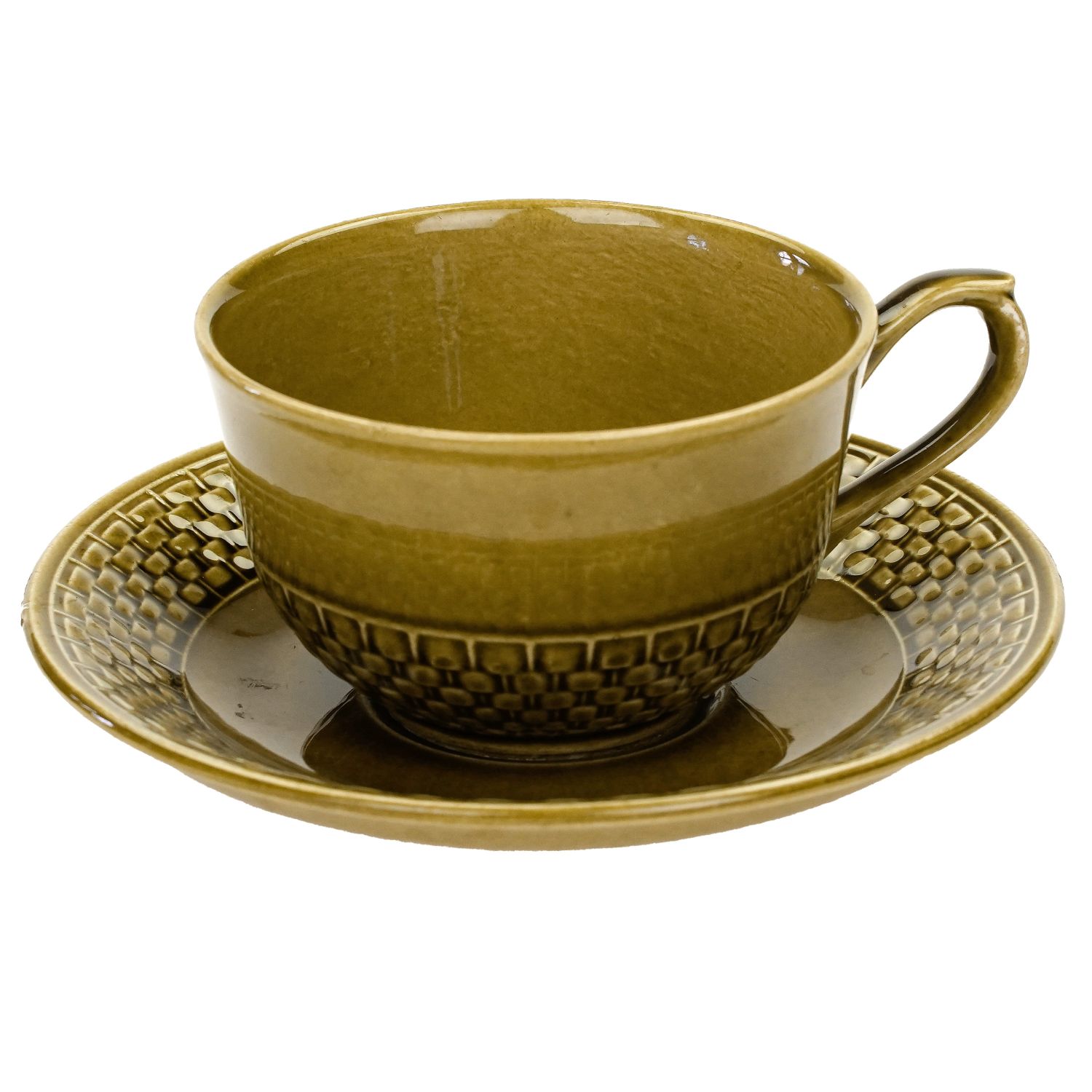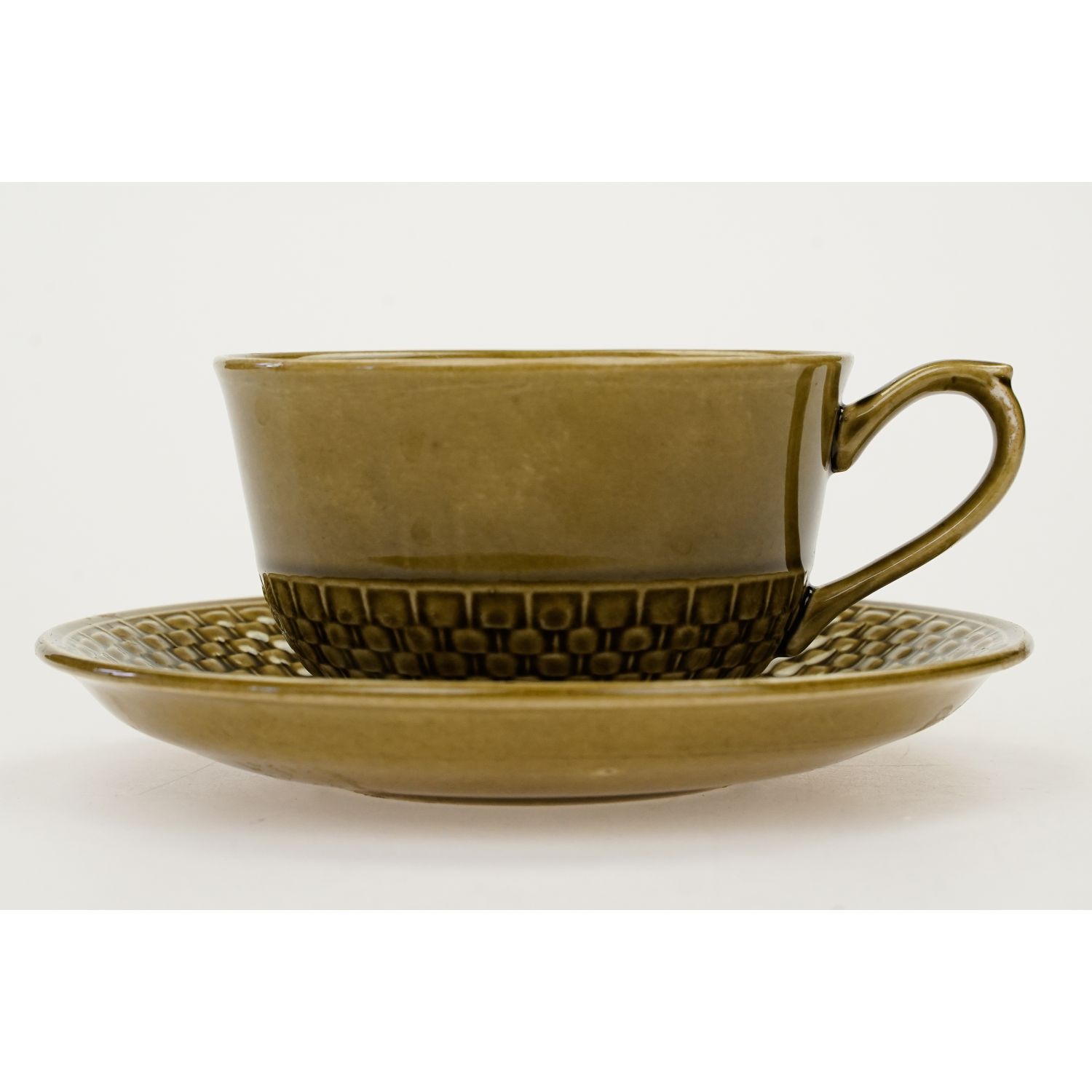 Całość w kolorze oliwkowym. Na kołnierzyku spodka i w dolnej części filiżanki reliefy imitujące plecionkę wiklinowego koszyka.