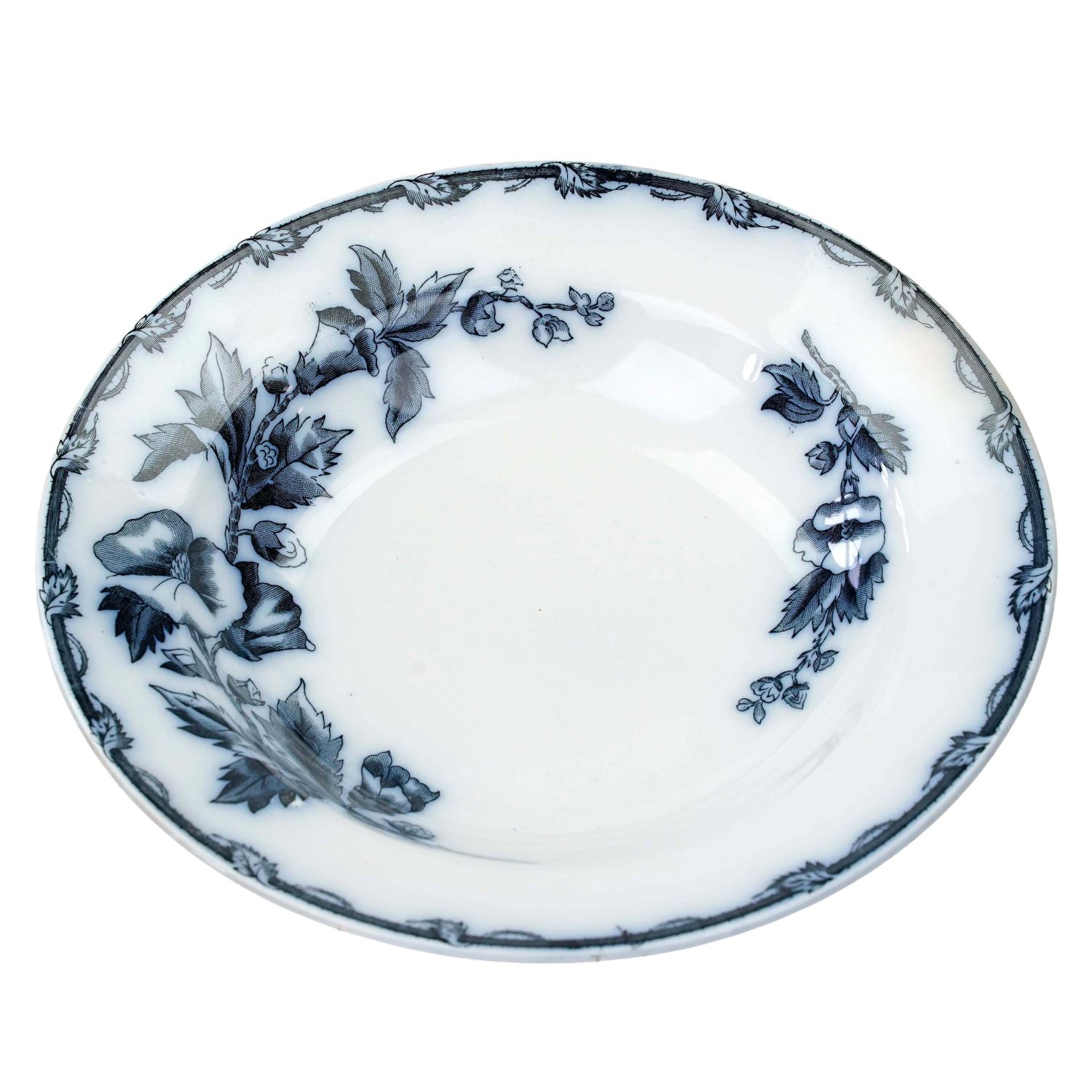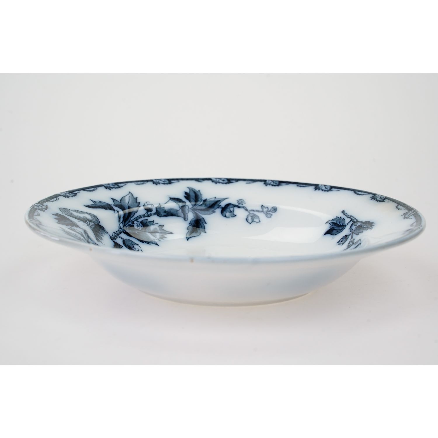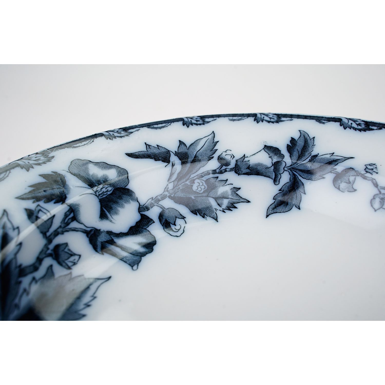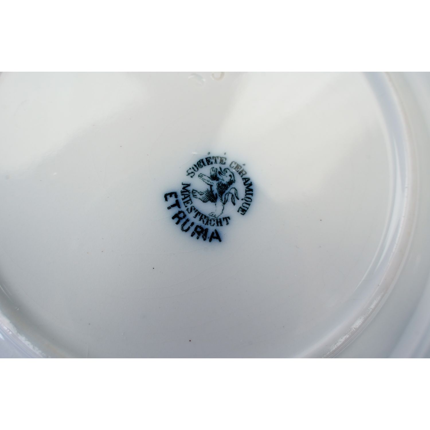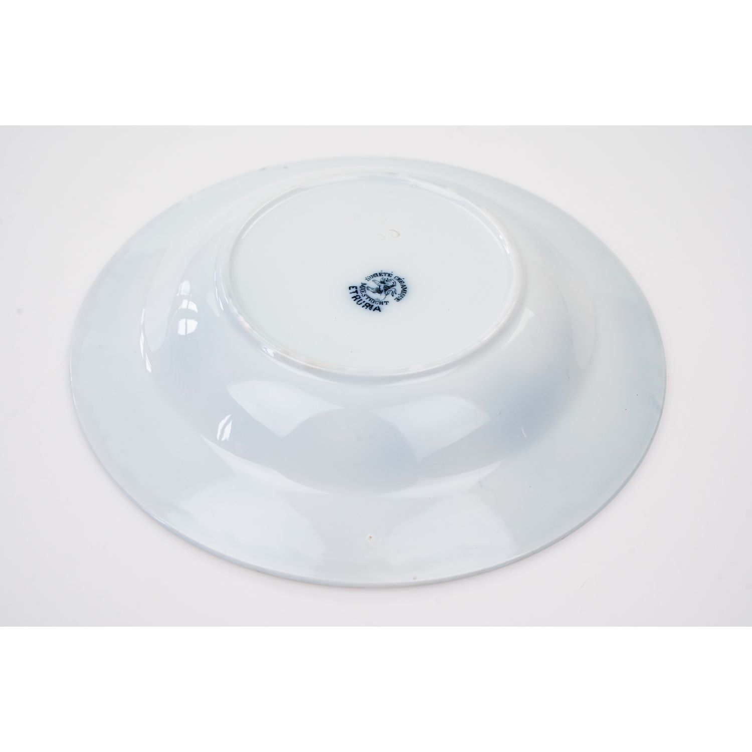 Pochodzi z Ceramique Societe Maastricht, Holandia, sygnowane znakiem stosowanym od 1885 do 1910 roku. Z kolekcji Etruria z dekoracją przedstawiającą kobaltowe kwiaty i ładnie wykończoną krawędzią. Całość w kolorze złamanej bieli lub jasnym kremie. Całość z przebarwieniami i krakelurą. Porcelana bardzo ładna, przedmiot wyjątkowo dekoracyjny, jak obraz!