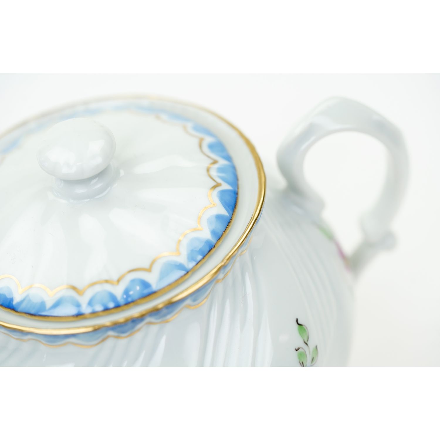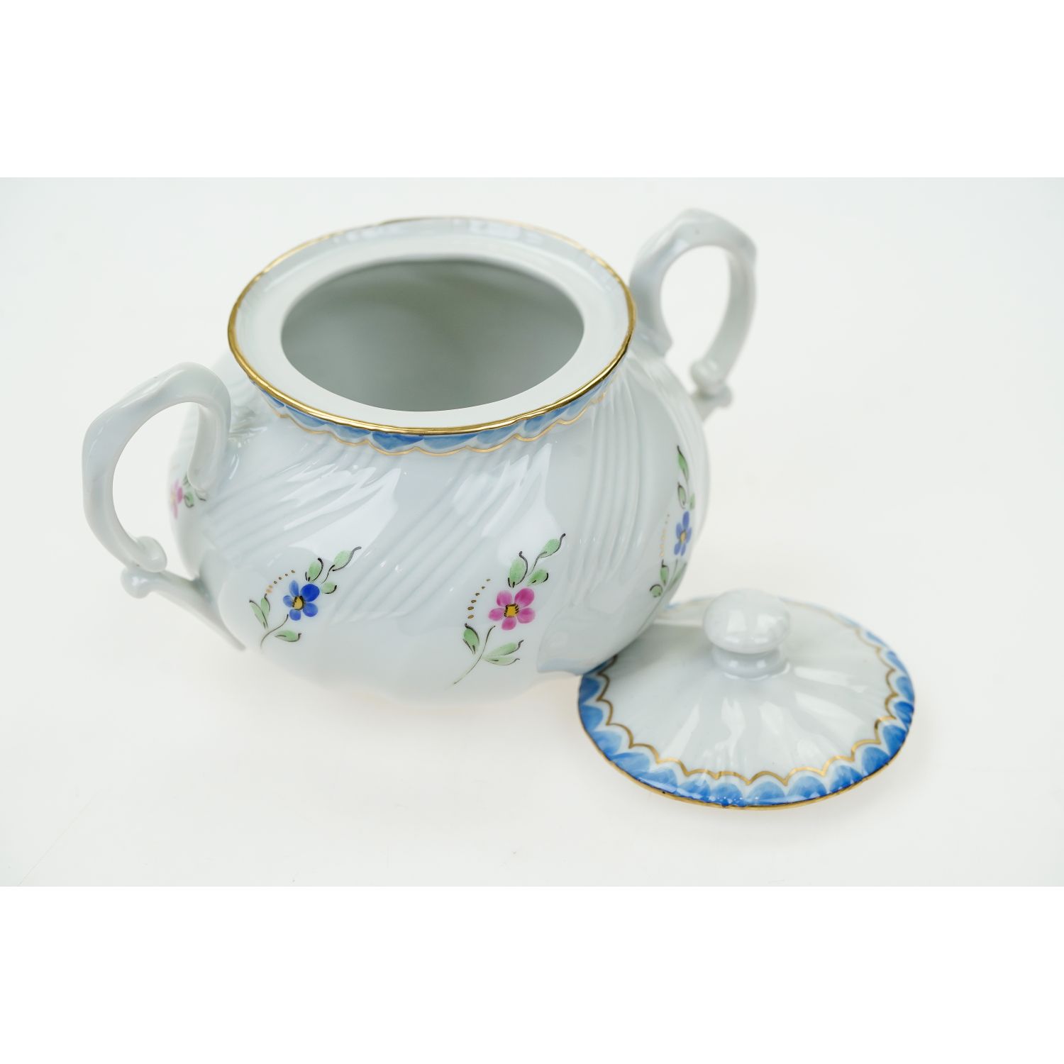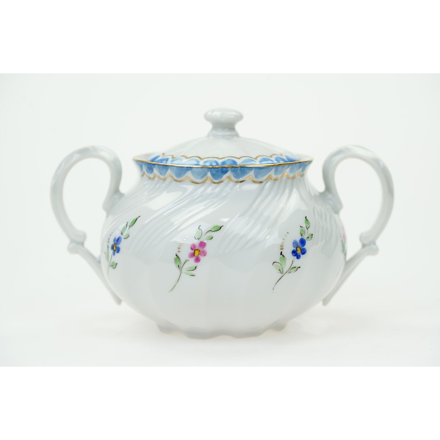 Pochodzi z Limoges. Sygnowana jak na zdjęciu. Wykonana z białej, ukośnie kanelowanej. Na porcelanie ręcznie malowane drobne kwiatuszki. Przy krawędzi niebieski szlaczek. Kontury w złoceniach. Zachwycają ergonomicznie uformowane uszka z oparciem pod kciuk.