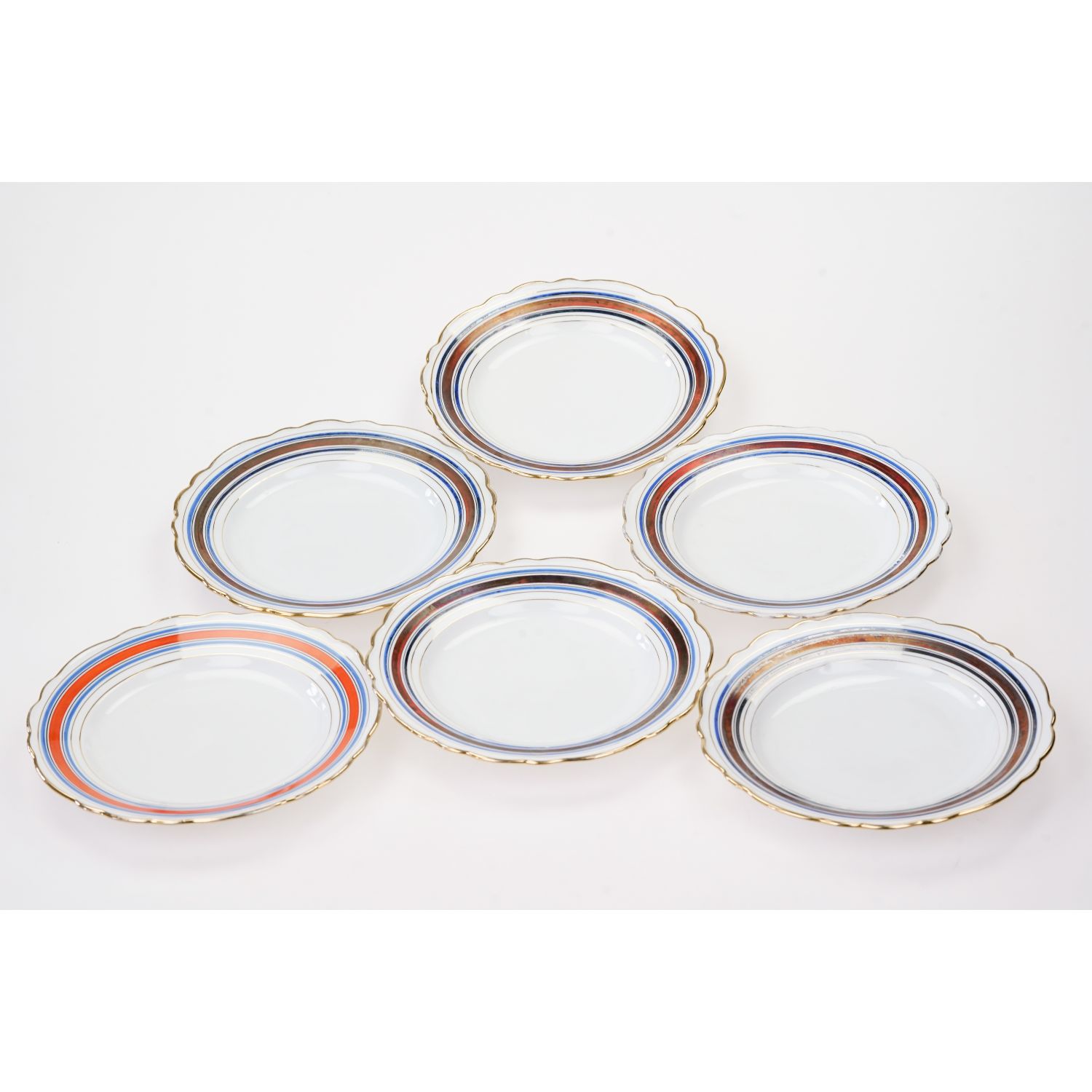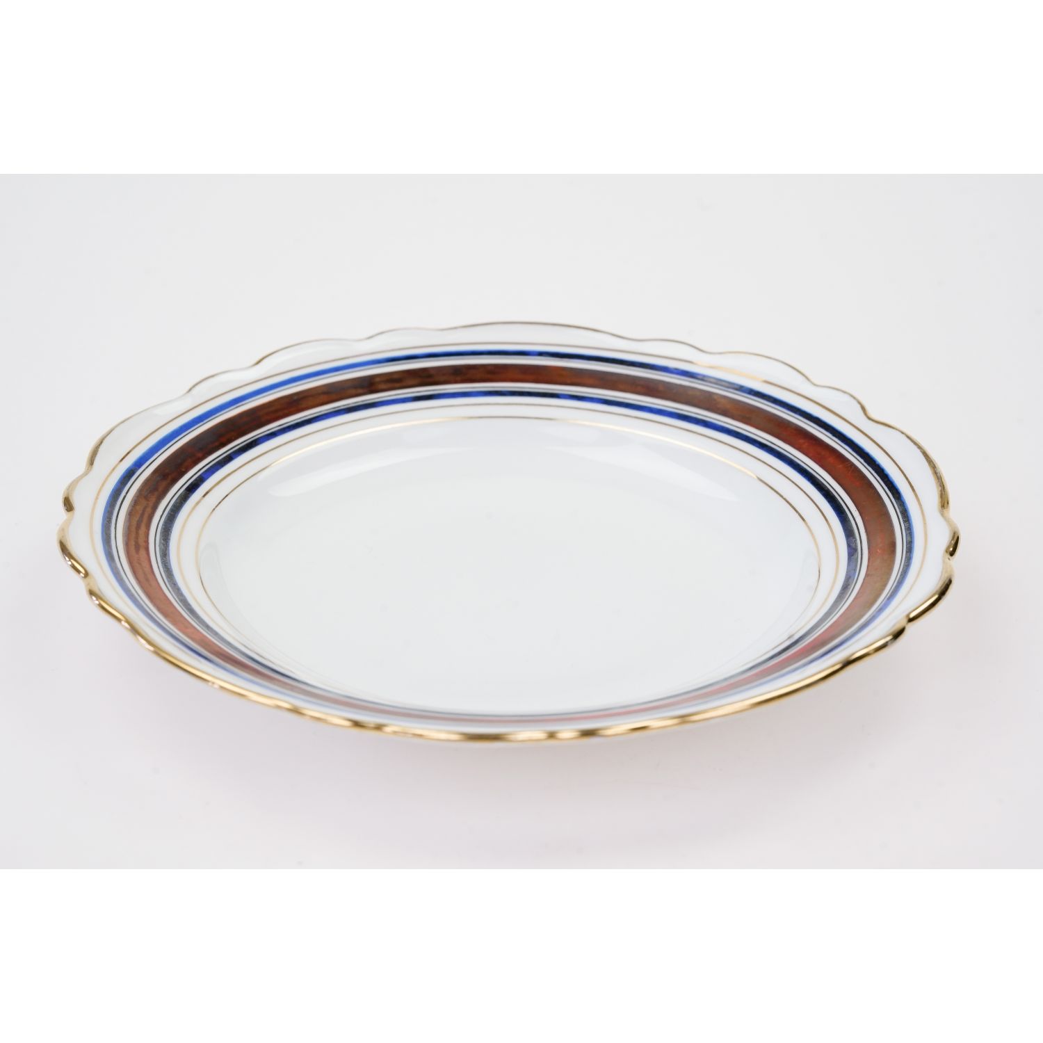 Porcelana w odcieniu bieli. Na kołnierzach bordowy i szafirowe paseczki. Jeden z talerzy ma czerwony paseczek. Rant w złoceniu.