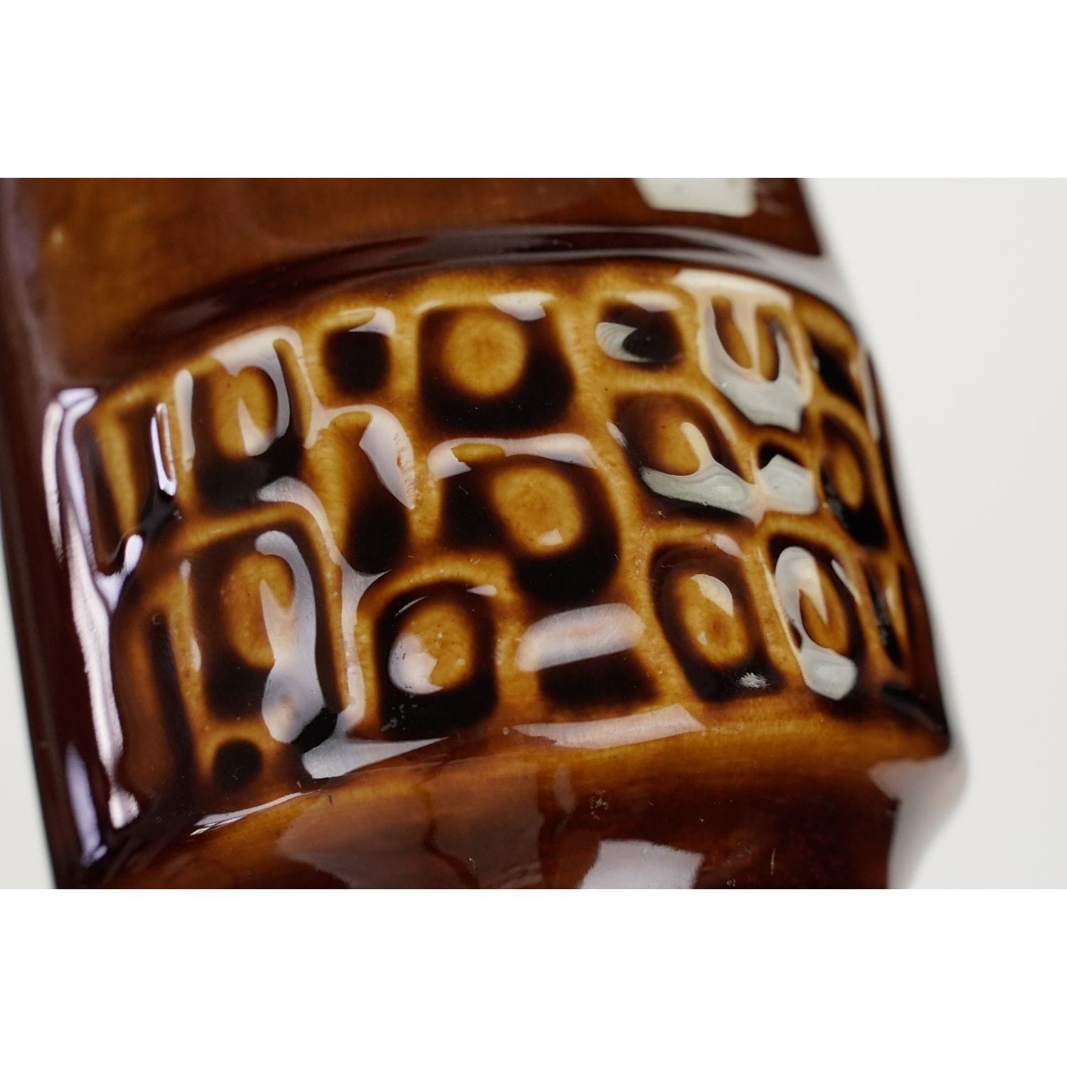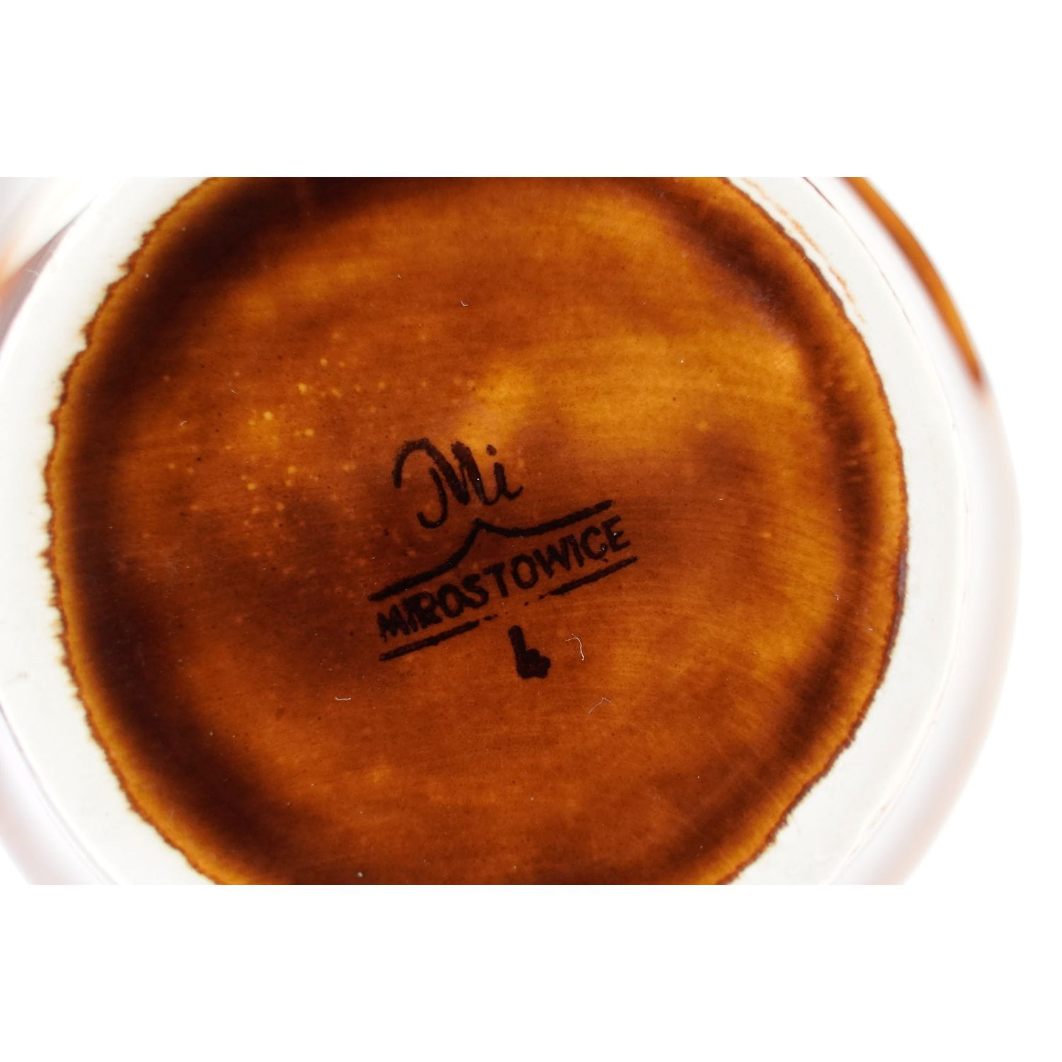 Pochodzi z Mirostowickich Zakładów Ceramicznych z Mirostowic Dolnych z lat 60/70-tych-tych XX wieku. Numer W-113. Wykonany z porcelitu szkliwionego. Szkliwo kryjące w odcieniach. Naczynie ma wymyślną, brzuchatą formę z krótką, płaską szyjką. Brzusiec z obu stron zdobiony abstrakcyjnym reliefem.
