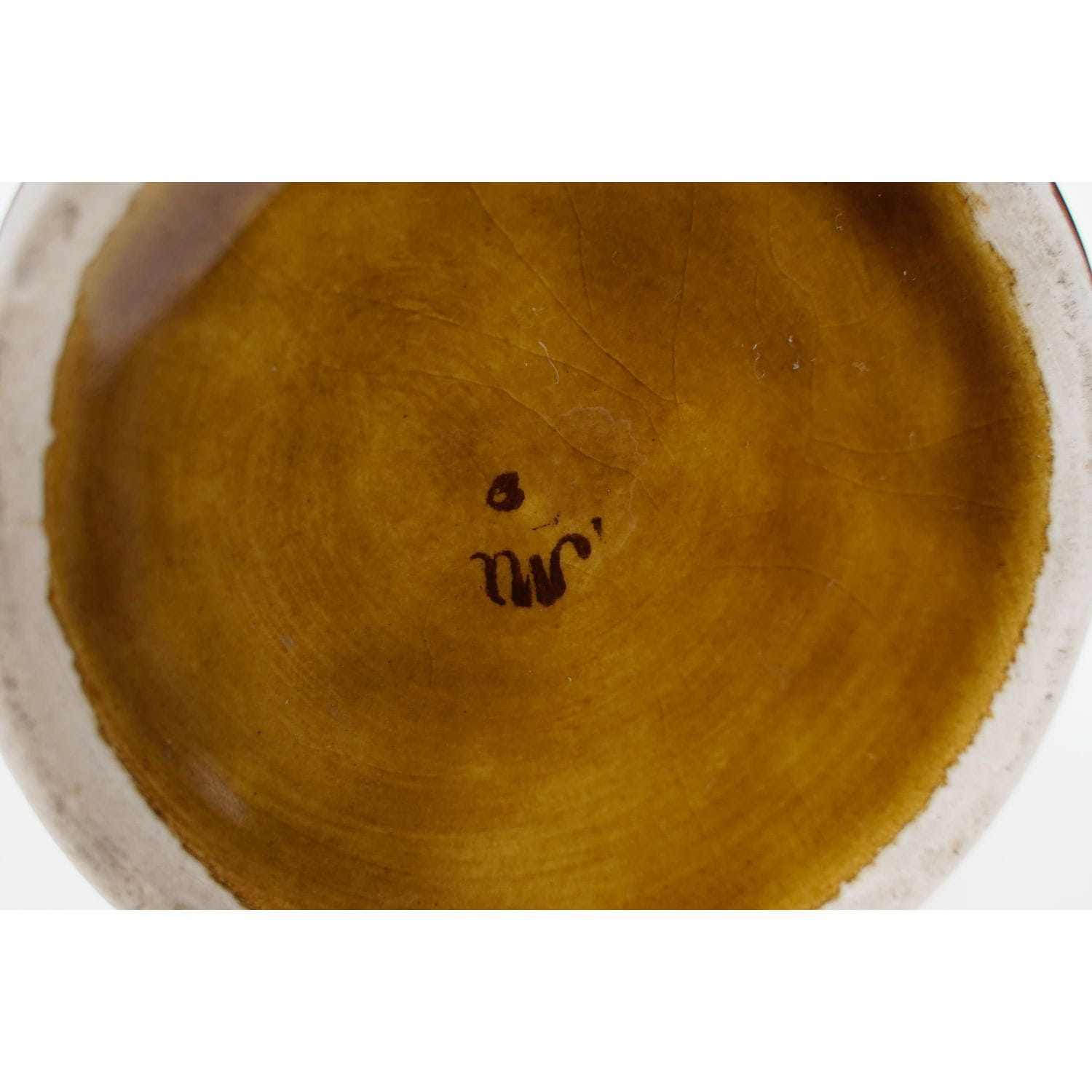 Pochodzi z lat 60-tych z Mirostowickich Zakładów Ceramicznych. O symbolu W-112. Wytworzony z ceramiki, pokryty szkliwem kryjącym w odcieniach miodowego brązu, z abstrakcyjną, zgeometryzowaną dekoracją z obu stron. Kolor nieco ciemniejszy niż na zdjęciach. Świetna forma!