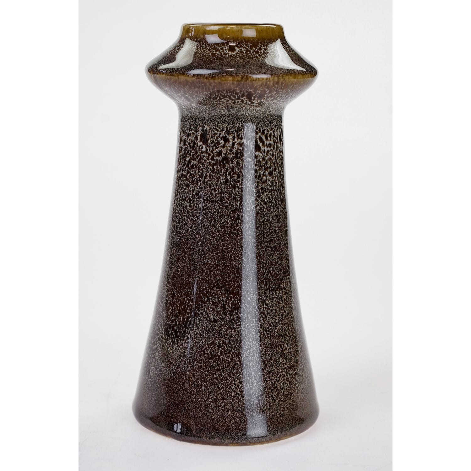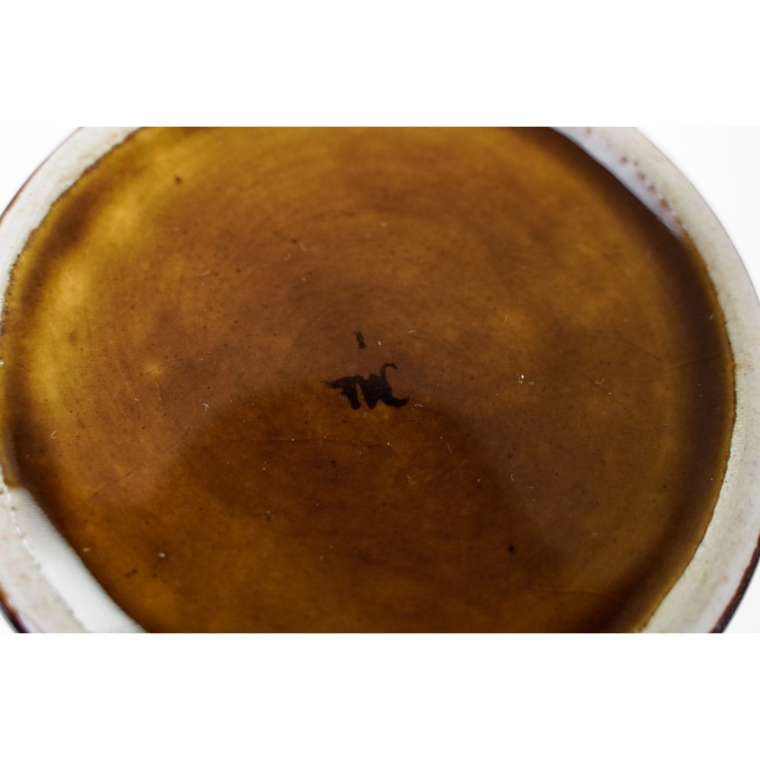 Pochodzi z Mirostowickich Zakładów Ceramicznych z Mirostowic Dolnych z lat 60/70-tych-tych XX wieku. Numer W-129. Wykonany z porcelitu szkliwionego. Szkliwo kryjące w odcieniach brązu z nakrapianiem przypominającym deseń na ptasich jajach.