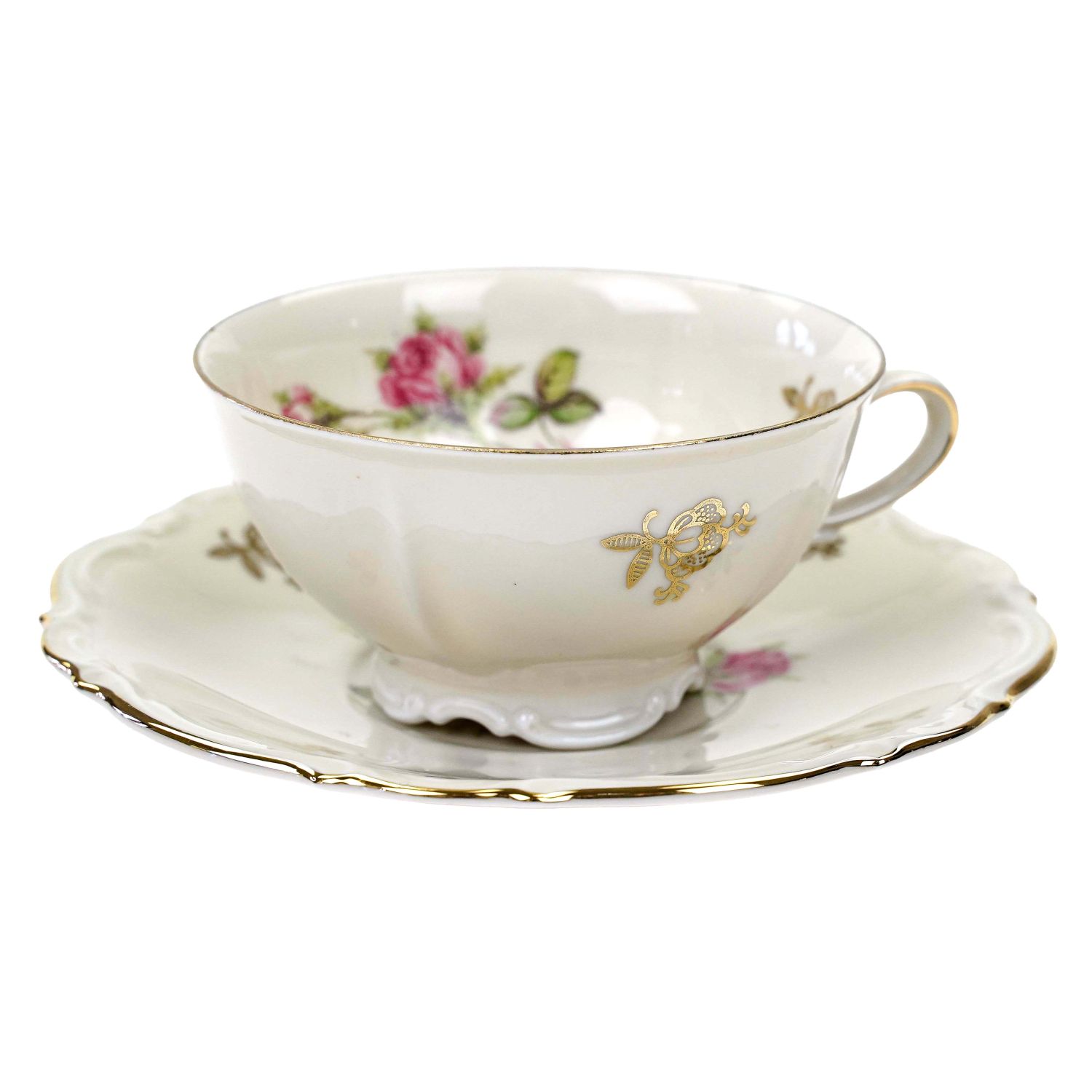 MITTERTEICH KOŚĆ SŁONIOWA RÓŻE I ZŁOTE KWIATY FILIŻANKA ZE SPODKIEM