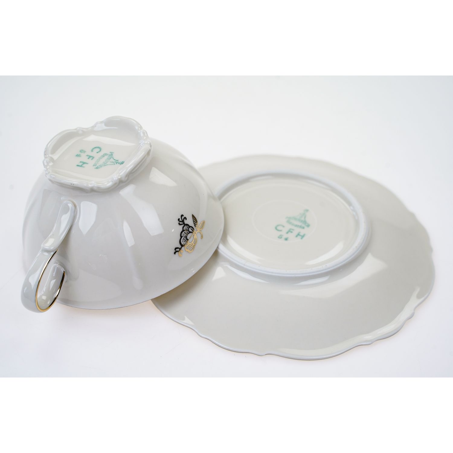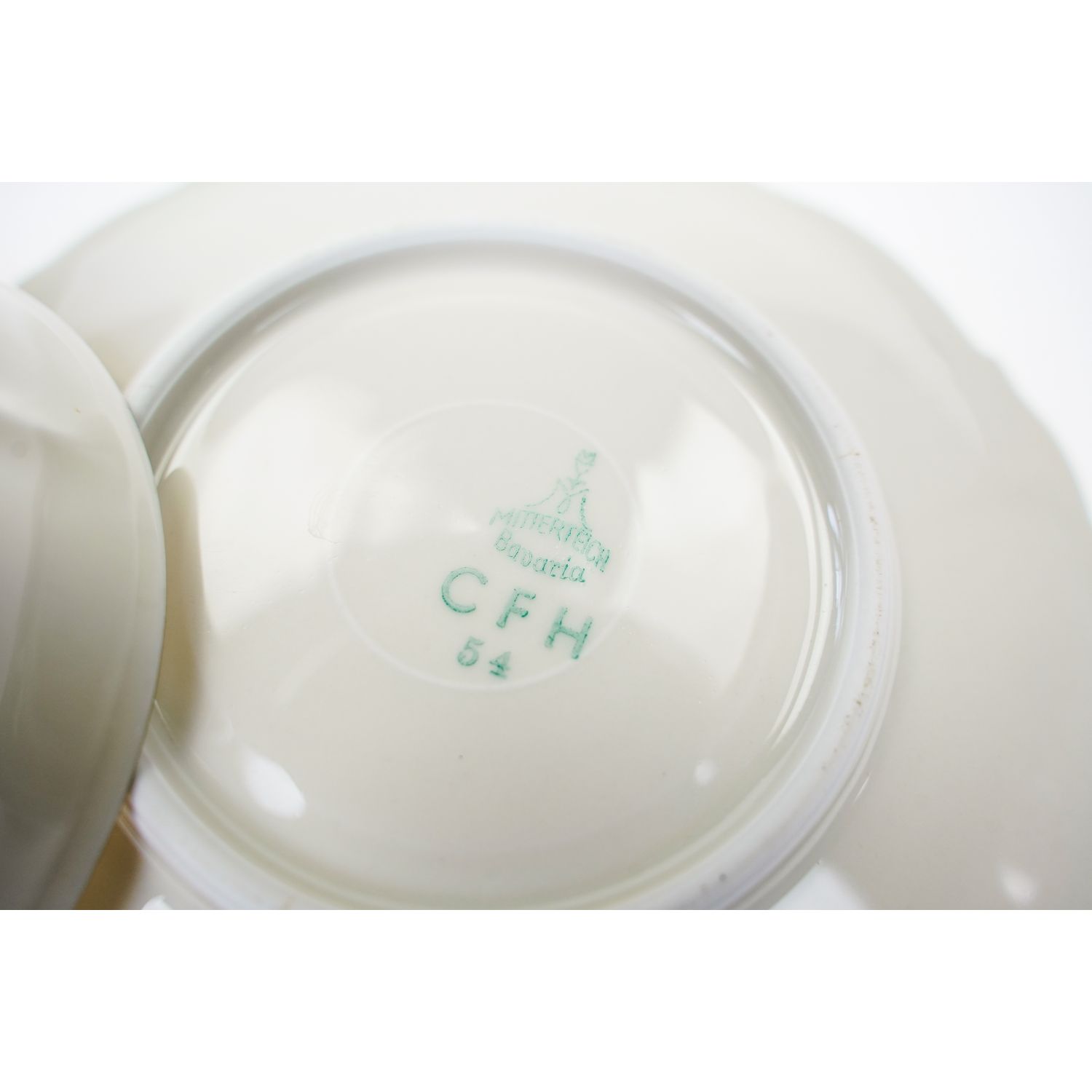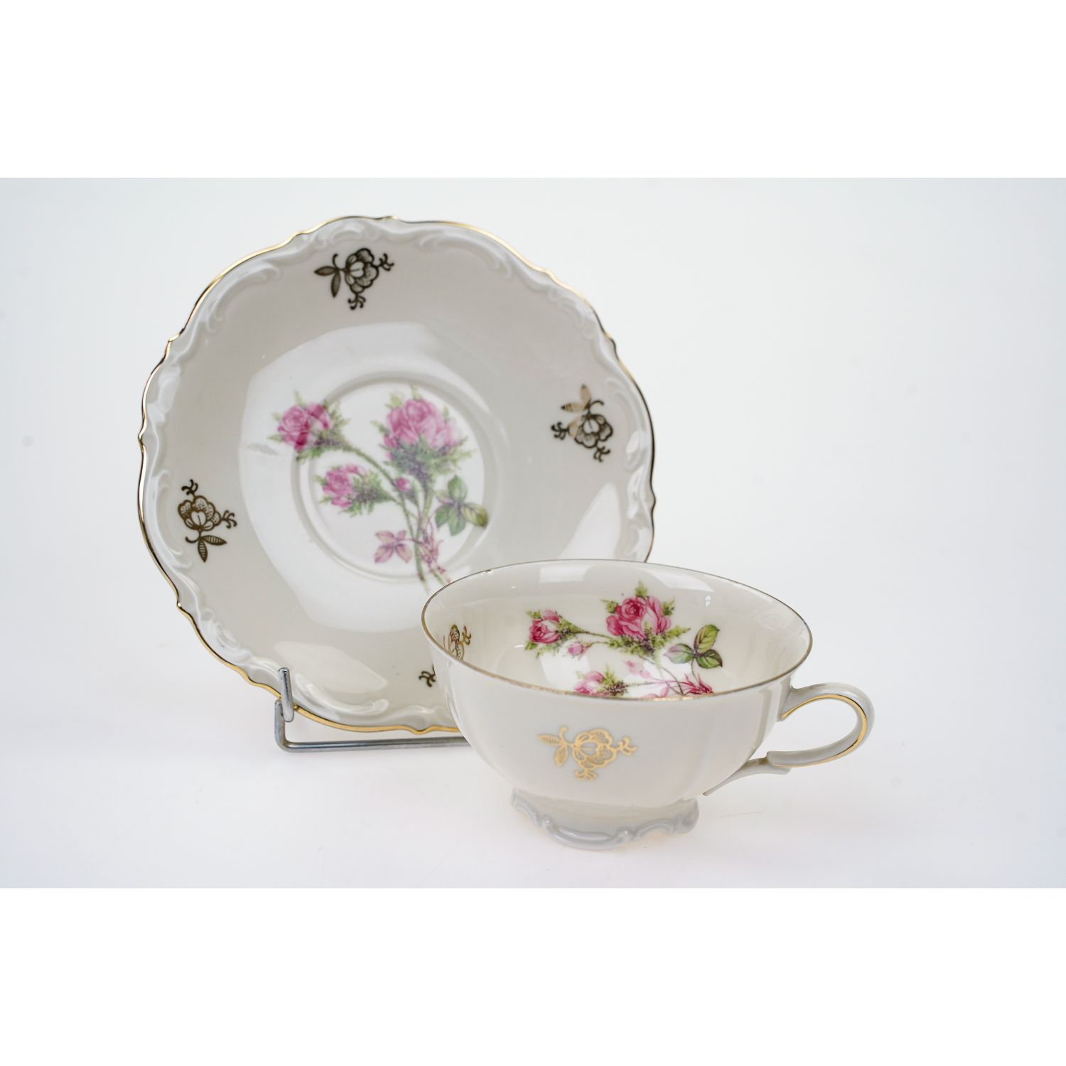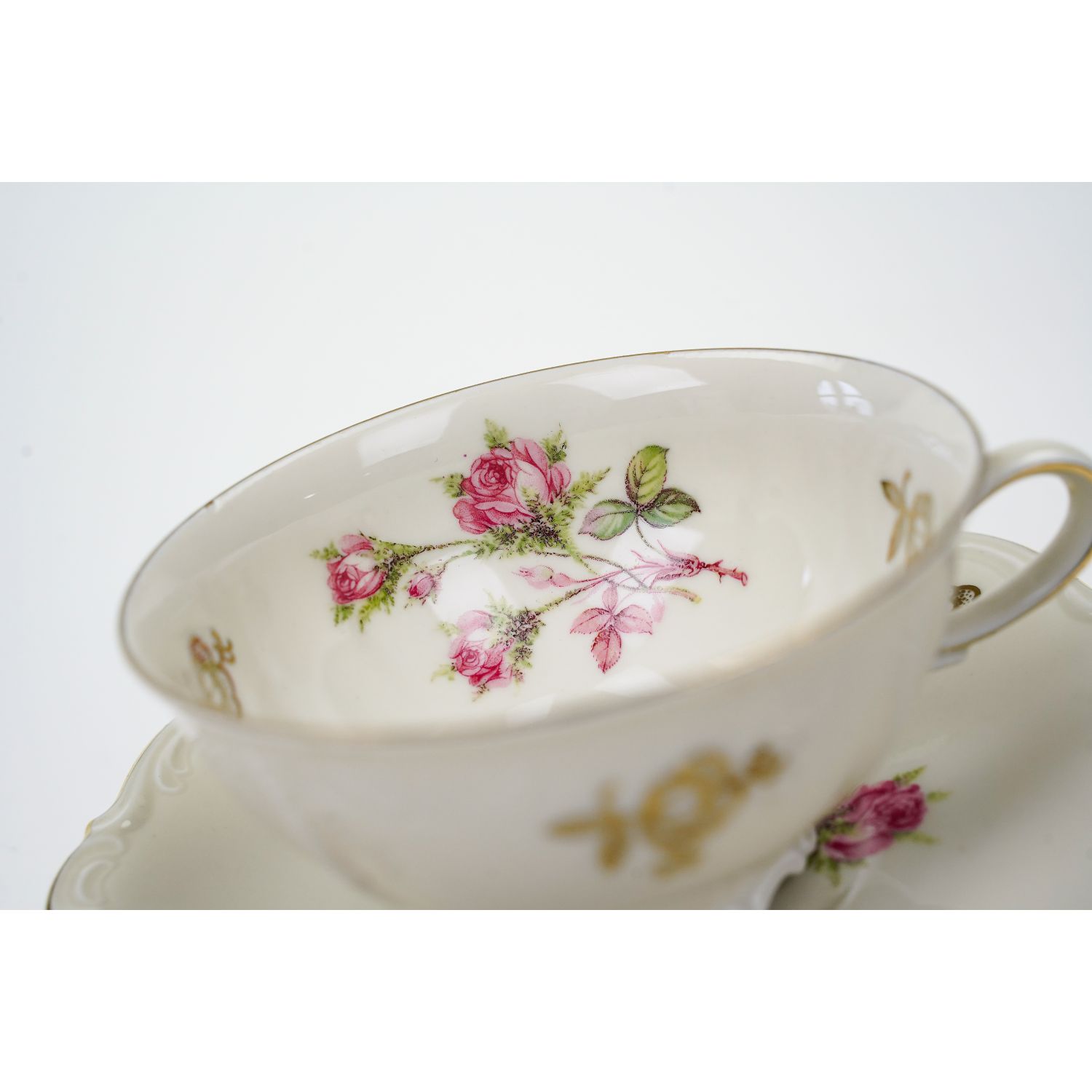 Pochodzi z Bawarii z Mitterteich, z Porzellanfabrik Mitterteich AG. Sygnowana znakiem stosowanym po 1931 roku. Porcelana w kolorze kości słoniowej z bogatymi reliefami. Ranty pięknie, delikatnie złocone złocone. Na porcelanie piękne kwiaty róż nawet wewnątrz filiżanki, pomiędzy złotymi, roślinnymi ornamentami.