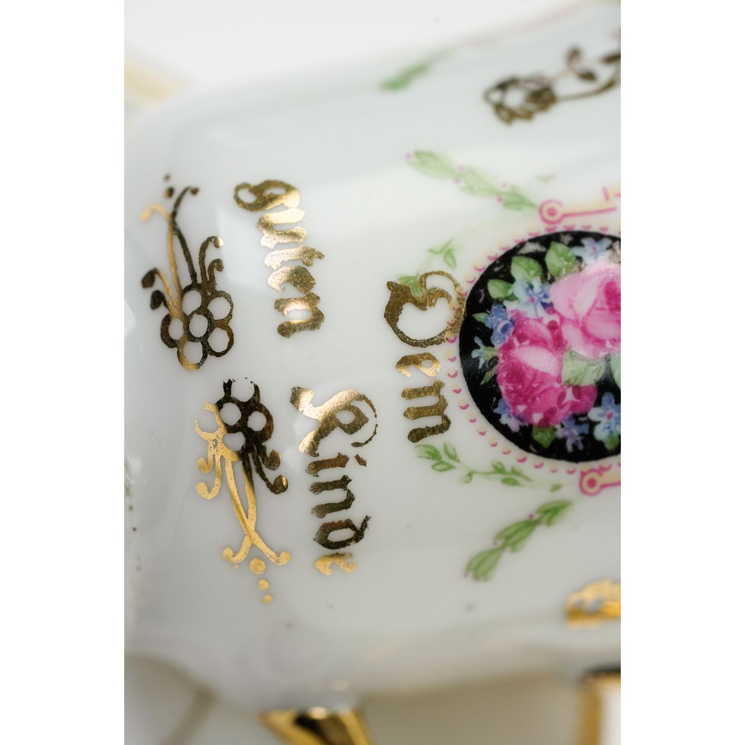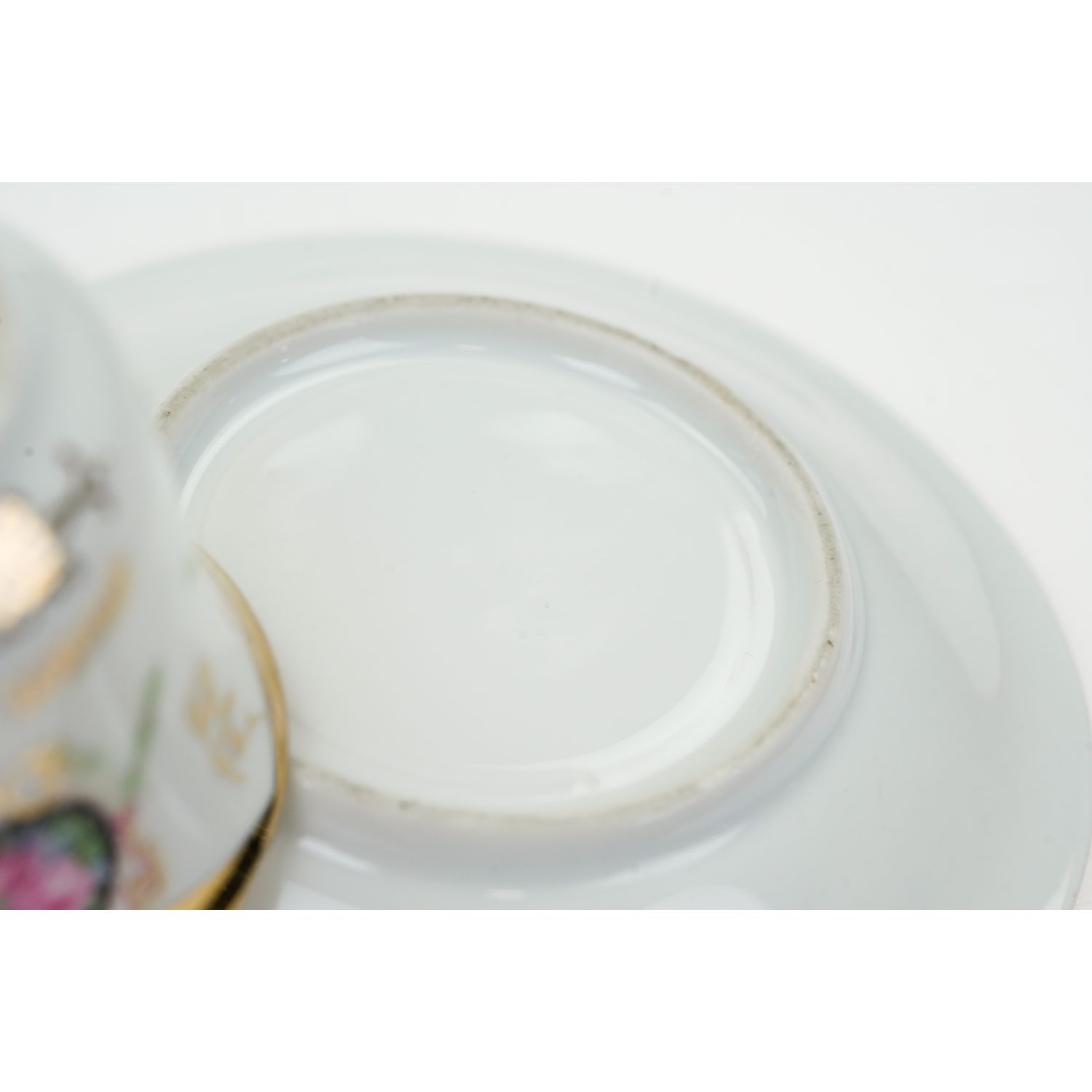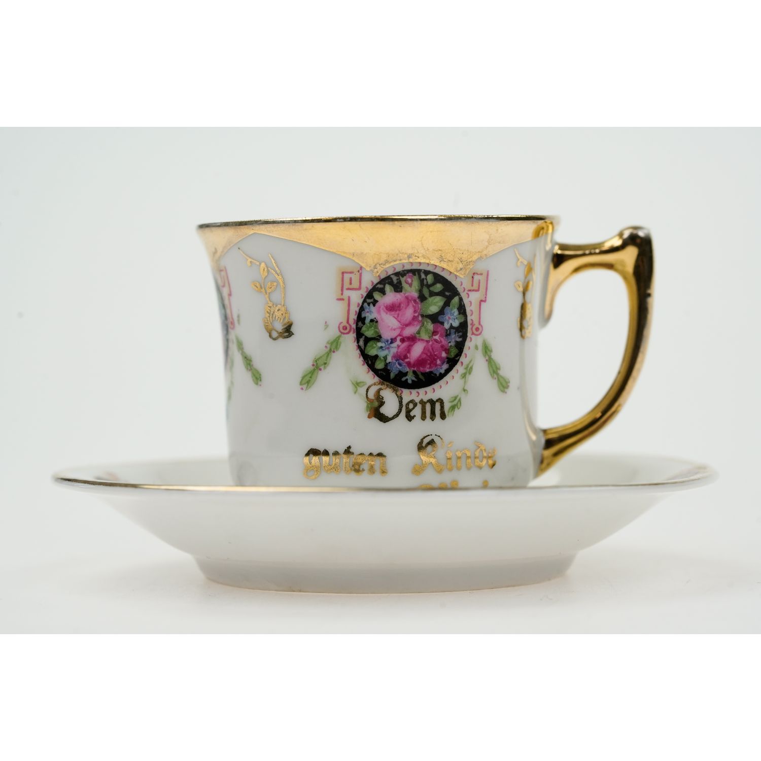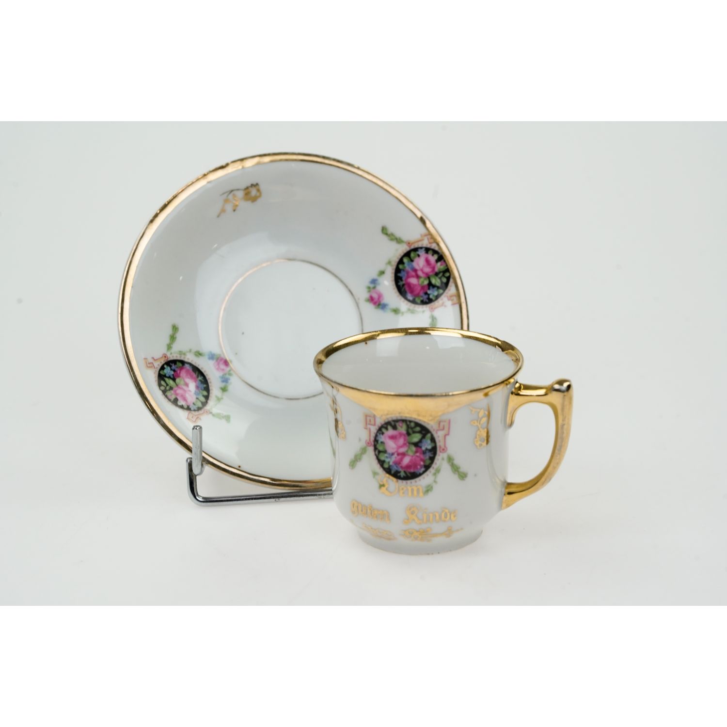 Nie posiada sygnatury. Wykonana z porcelany o odcieniu bieli. Na niej medaliony wypełnione kwiatami i delikatne girlandy kwiatów Ranty w złoceniu i w pełni złocone uszko. Na filiżance z jedne strony napis w języku niemieckim "Dem guten Kinde" ( Dla grzecznego dziecka, dla dobrego dziecka).