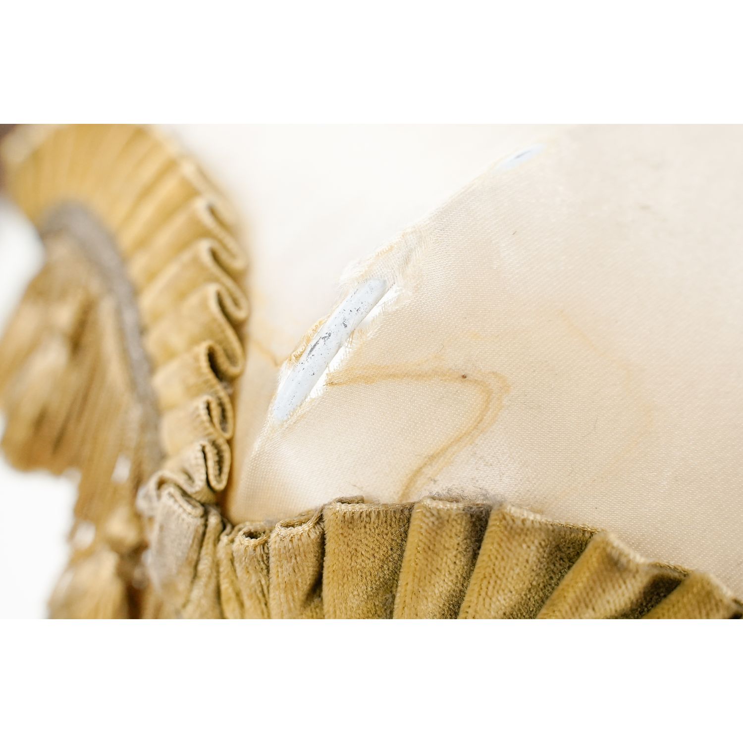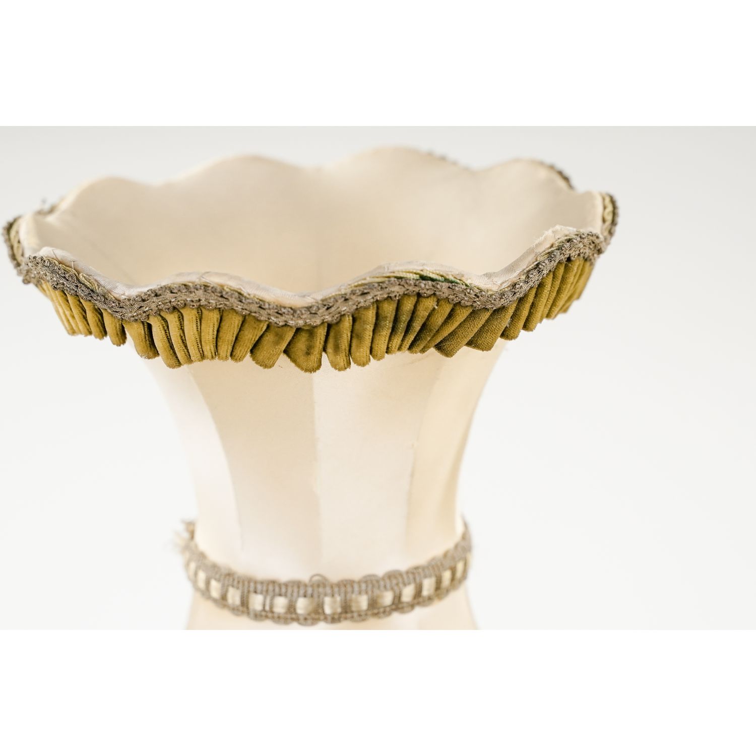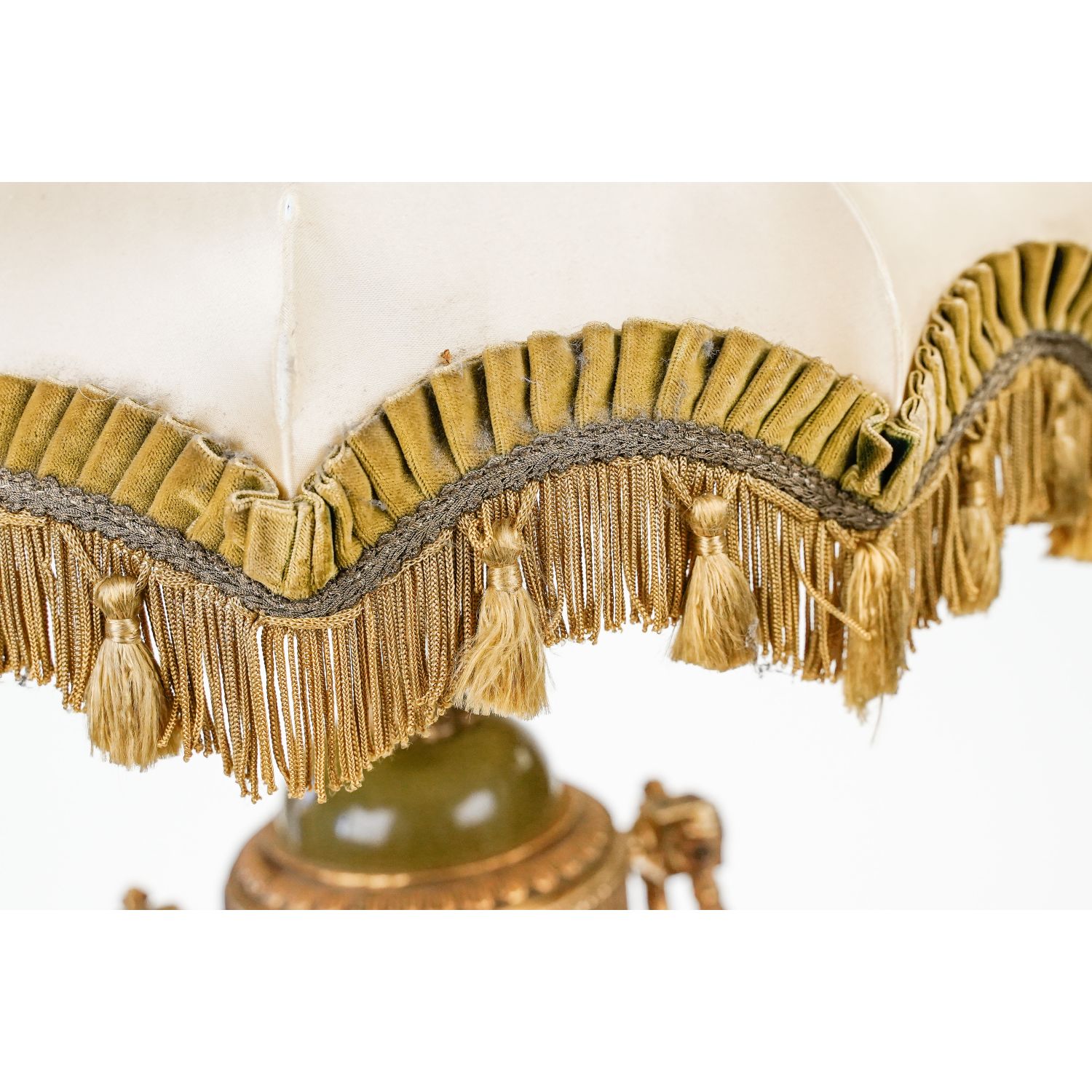 W tej chwili lampa wyposażona jest w piękny abażur o wymyślnej, dekoracyjne formie, ale w złym stanie, jednak na tyle ciekawa, że może ktoś skusi się i podda go renowacji, bo jego uroda jest tego warta.