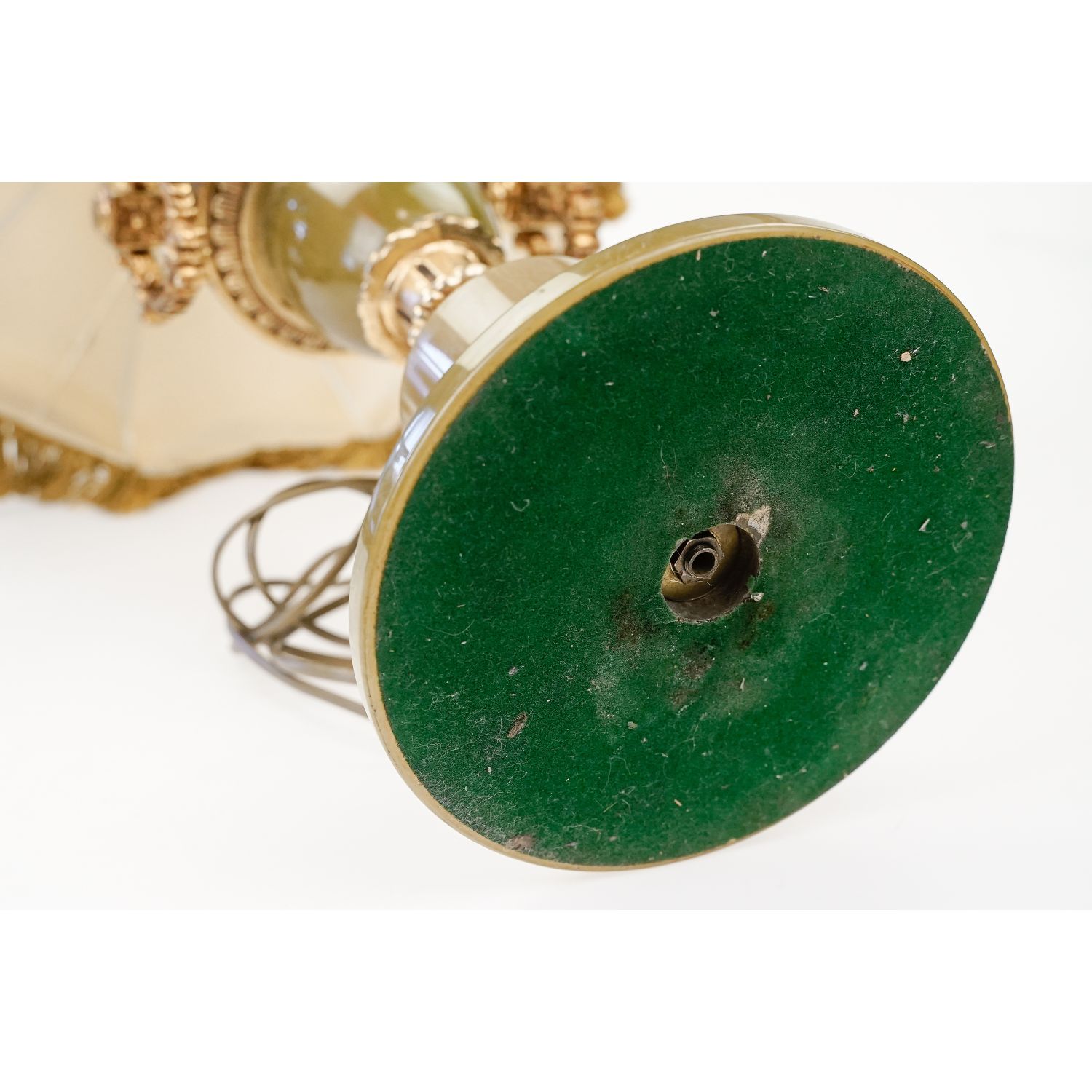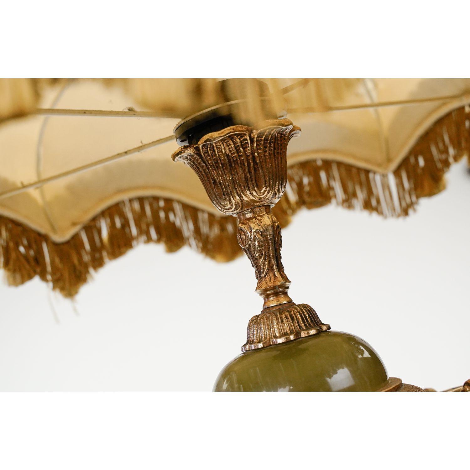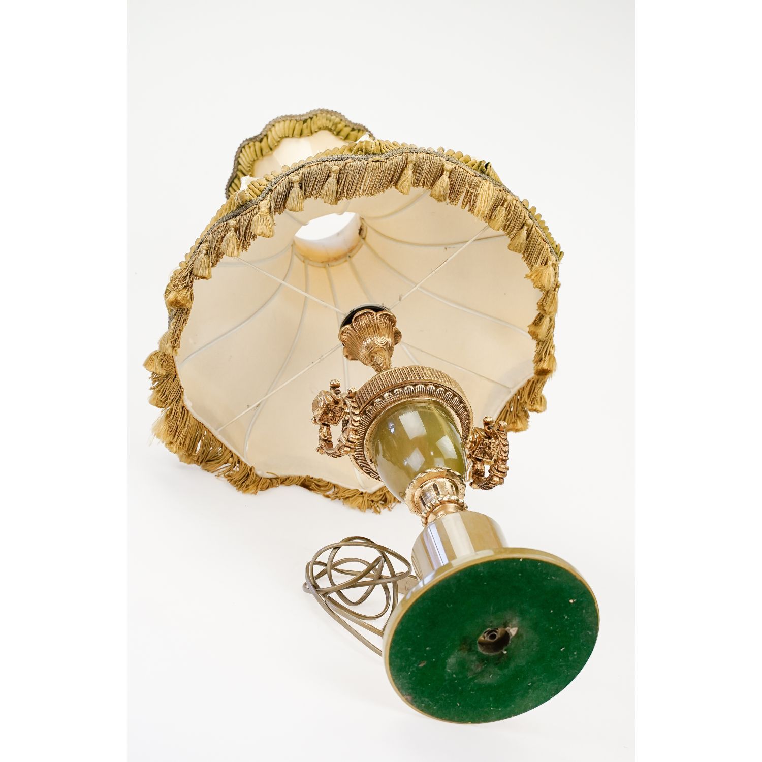 Przedmiotem sprzedaży jest podstawa lampy. Niepowtarzalna stylistyka i najwyższa jakość wykonania. Misterna konstrukcja podstawy wykonana z kamienia w zielonym kolorze z widocznymi żyłkami i mosiądzu z pięknymi uchwytami. Lampa posiada jeden punkt świetlny na żarówkę z dużym, standardowym gwintem. Ładna, klasyczna forma. Elektryka: przewód, wtyczka, włącznik o oprawka, wymienione.