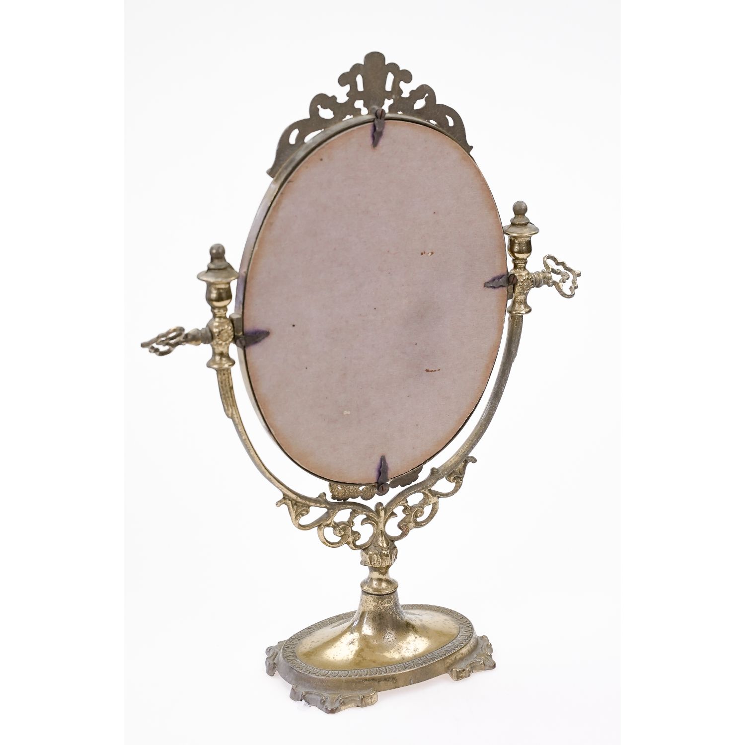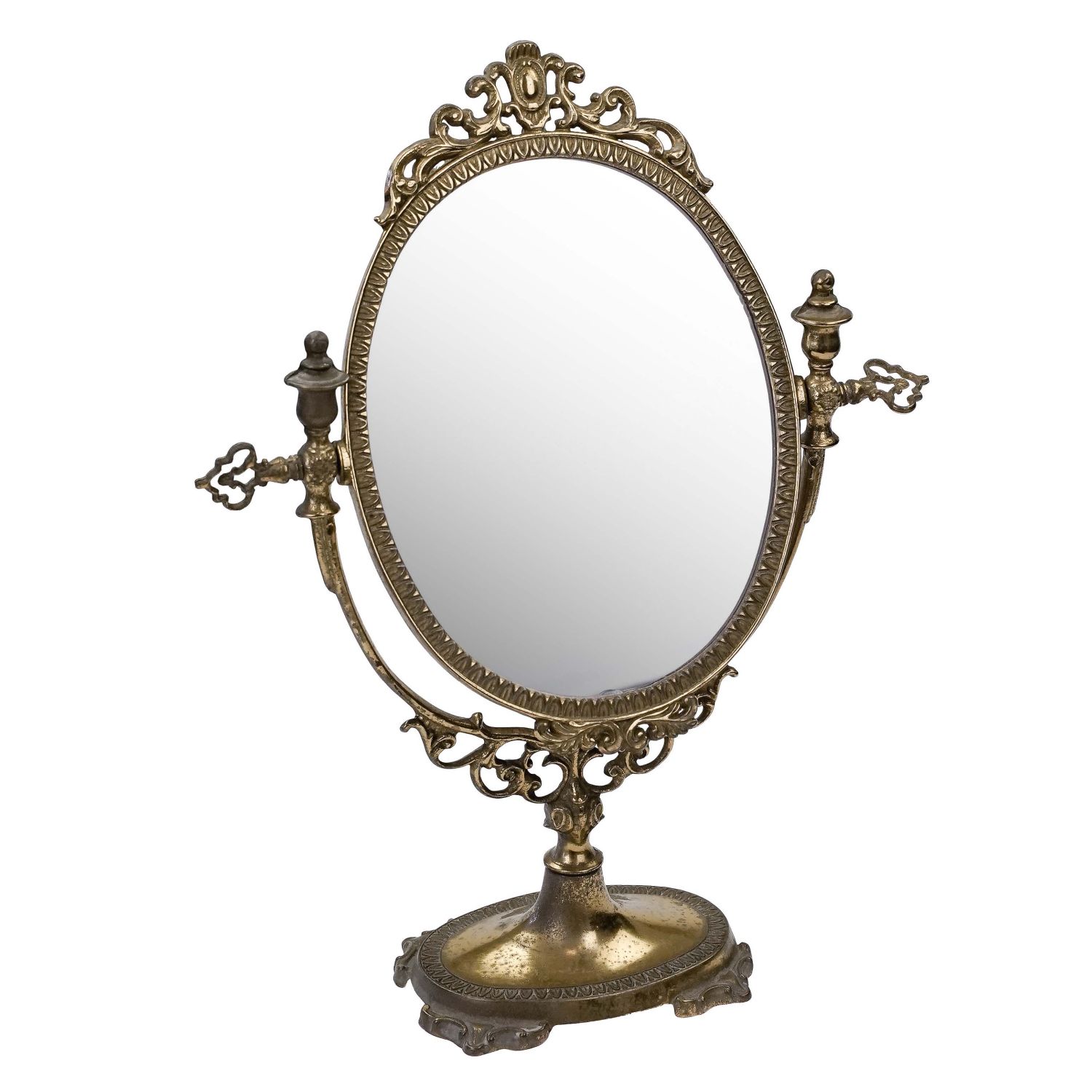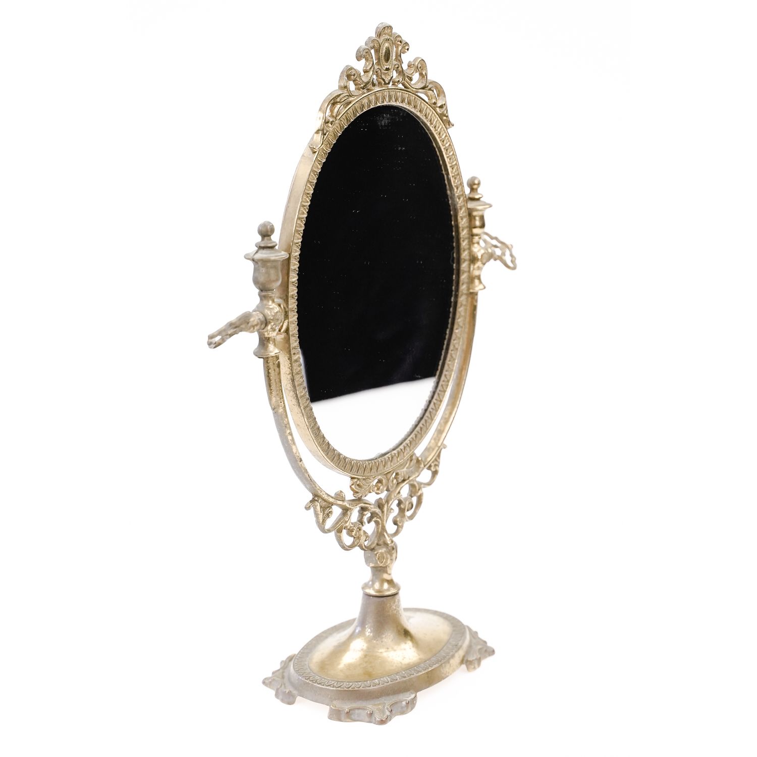 Oprawa posiada wygodną regulację, przez dokręcenie mosiężnych pokręteł. Można ustawić kąt położenia tafli. Lusterko zabezpieczone od tyłu tworzywem sztucznym. Szeroka podstawa na zdobionych nogach zapewnia stabilność przedmiotu.