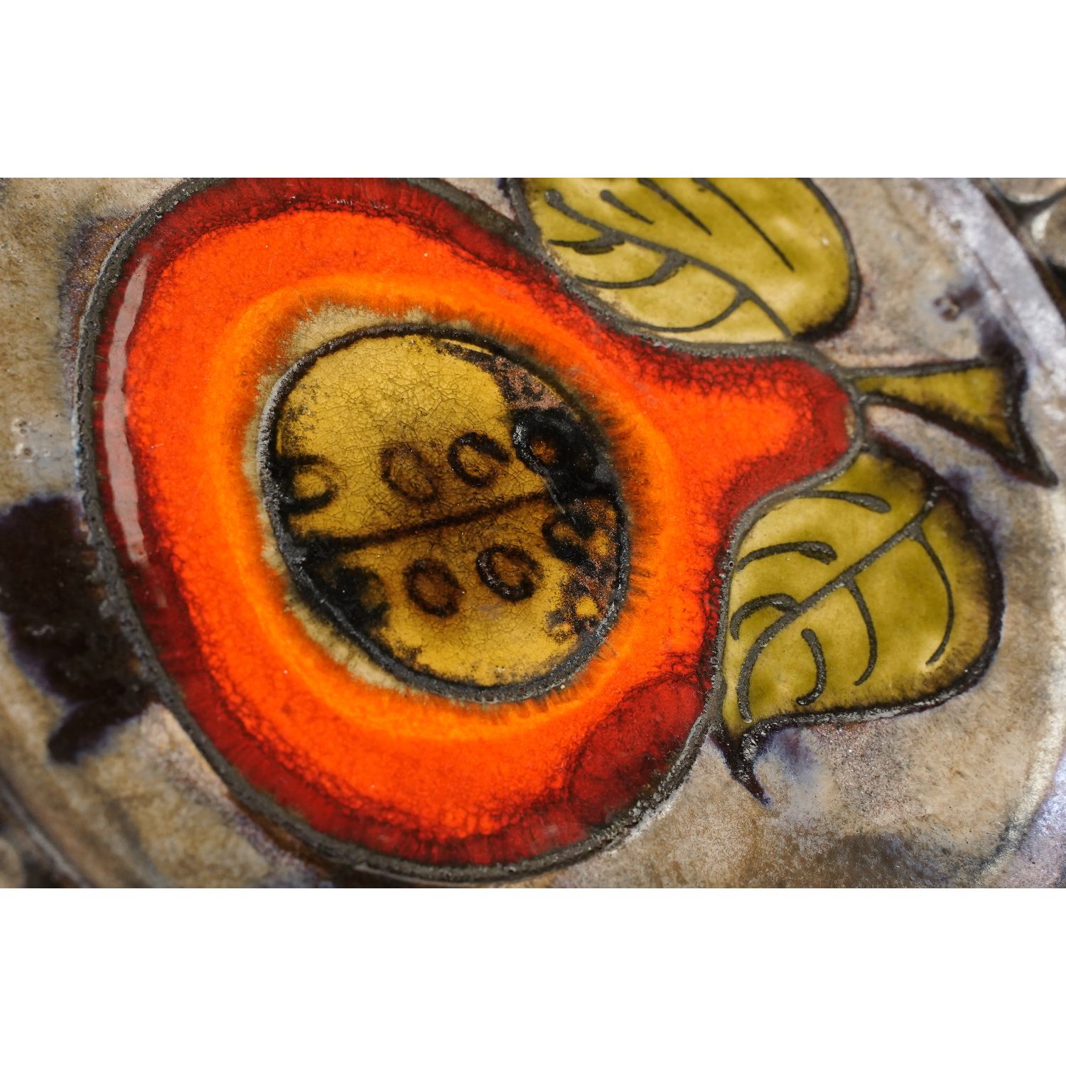 Wzornictwo typowe dla lat 70-tych z wyrazistym. ręcznie malowanym motywem owocowym na środku i dekoracyjnym obrzeżem. W stylu Heibi Keramik. Ceramika szkliwiona.