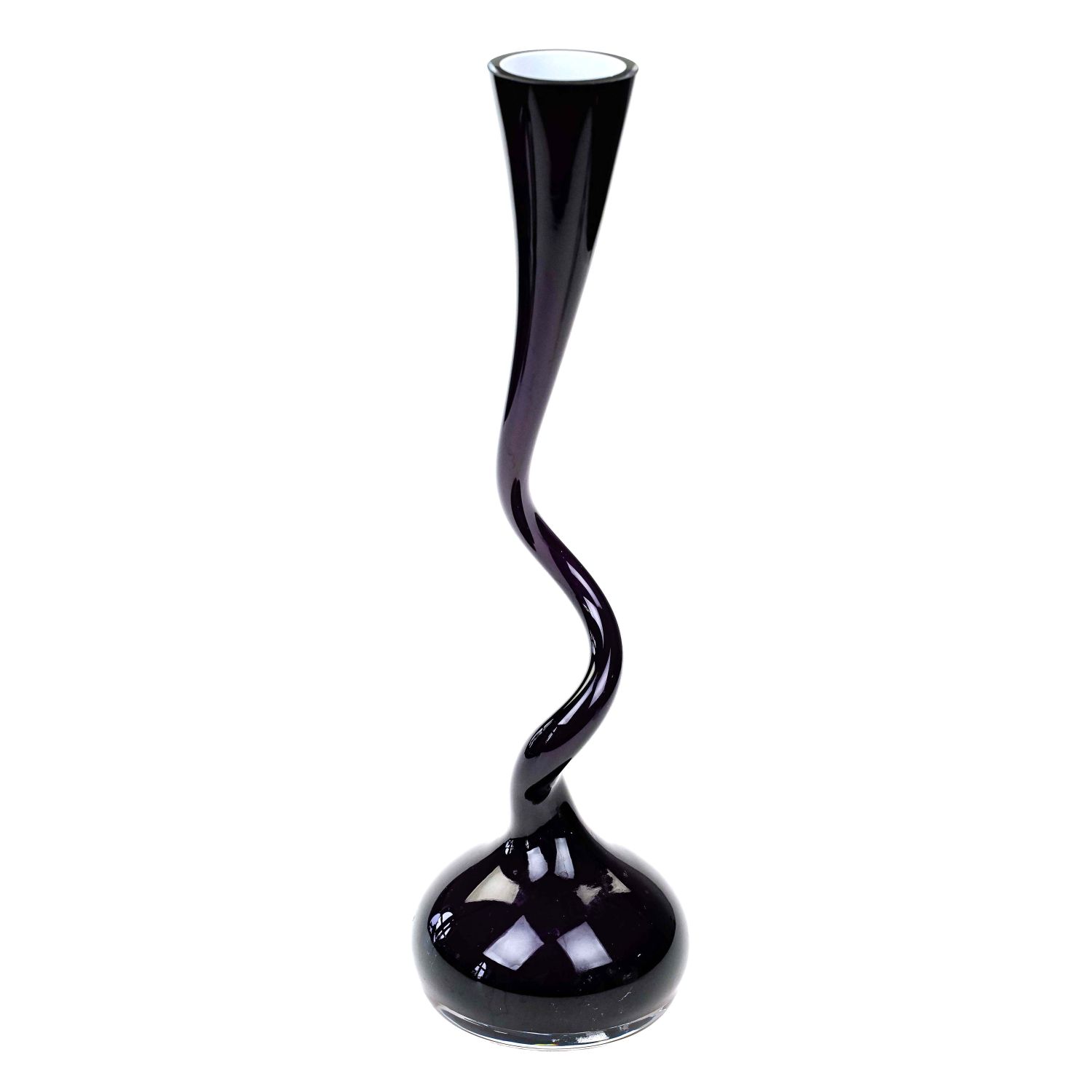 Dekoracyjny wazon Swing, zrobiony ze szkła warstwowego w pięknym, energetycznym kolorze. Zaprojektowany przez Brittę Bonnesen. Wyprodukowany przez duńską firmę Normann Copenhagen w latach osiemdziesiątych/dziewięćdziesiątych XX wieku. Zachowała się naklejka producenta. Szkło dwuwarstwowe. Świetny kształt. Charakteryzuje się ikoniczną, skręconą szyją. Dmuchane ręcznie, przez co każdy egzemplarz jest unikalny. Bakłażanowa, mleczna kolorystyka sprawia, że jest to klasyczny element skandynawskiego designu.