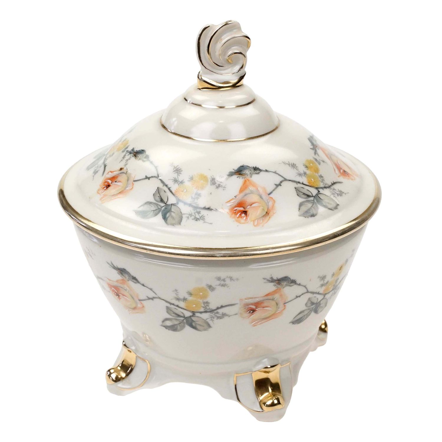 Piękna, ręcznie dekorowana, pękata bomboniera na złoconych nóżkach.