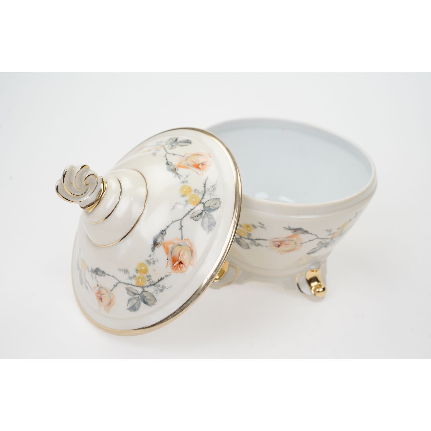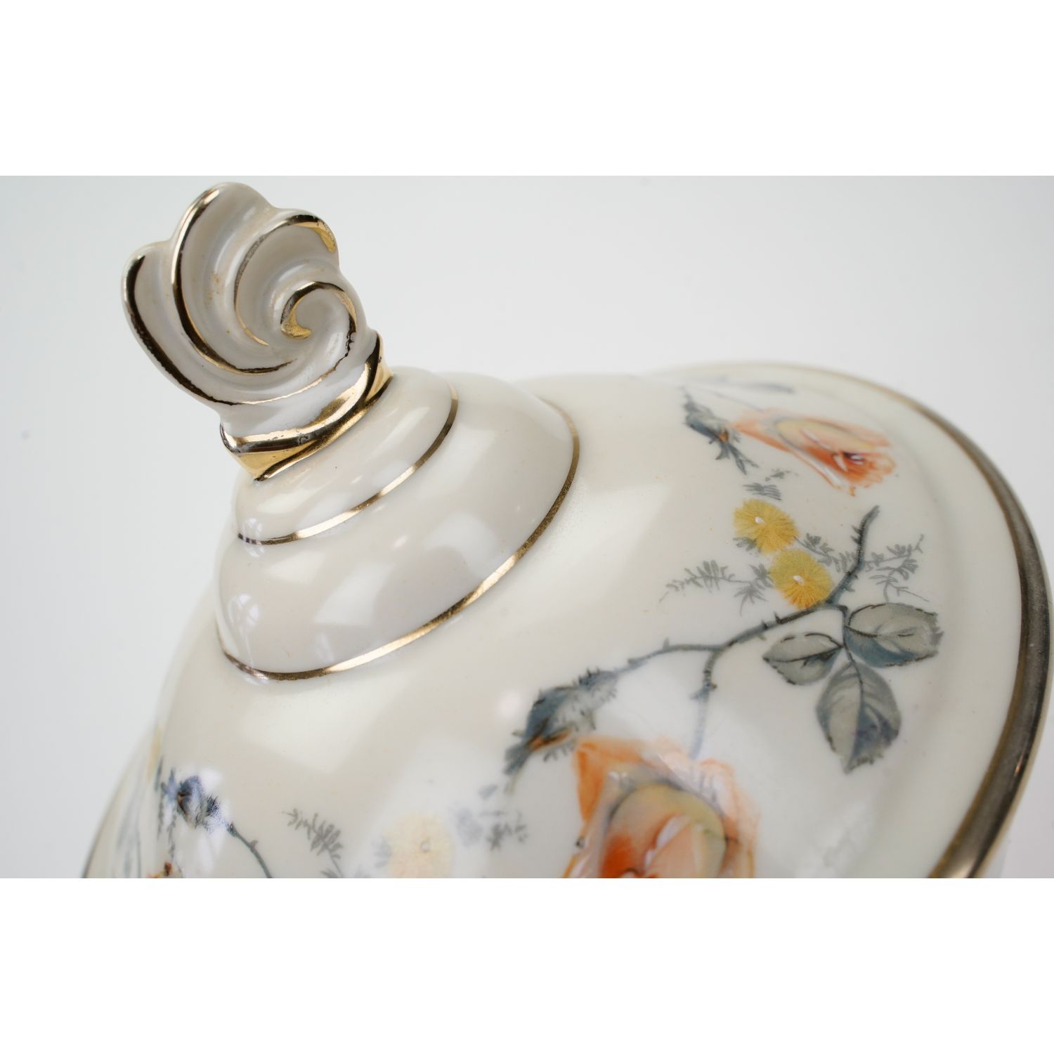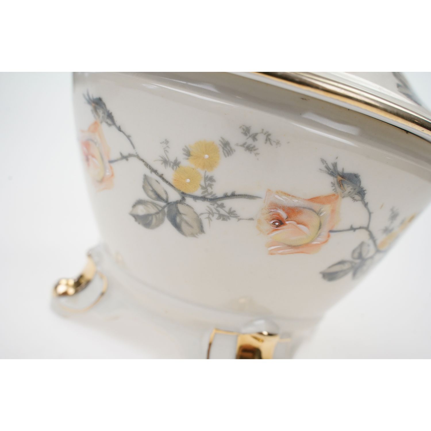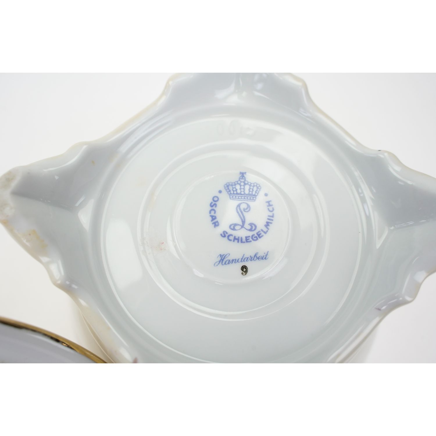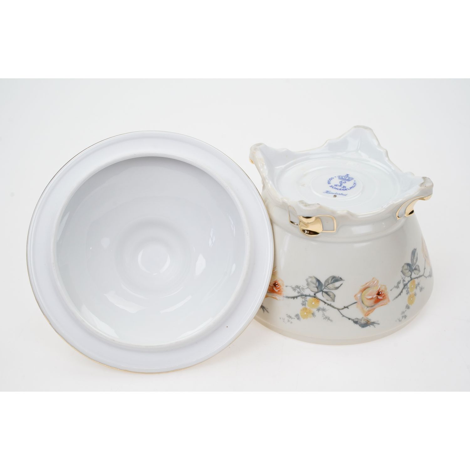Pochodzi z Langewiese z Porzellanfabrik Langewiesen Oscar Schlegelmilch z lat 50-tych XX wieku z dopiskiem "Handarbeit". Porcelana biała, pokryta kremową/waniliową malaturą, na niej ręcznie podmalowane herbaciane róże. Brzegi w złotej konturówce. Świetna konturówka.