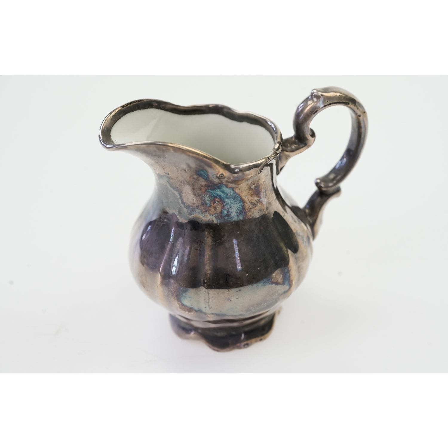 Nie posiada sygnatury. Powstał z doskonałej jakości porcelany w kolorze kości słoniowej. W całości pokryty platerowaną na srebrno mosiężną blachą. Elegancka i wytworna reliefowana, "falująca" forma. Wspaniała ręczna praca.