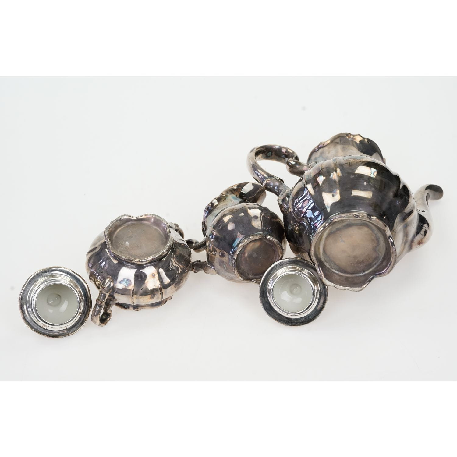 Wspaniały, zabytkowy komplet, zestaw, garnitur środka stołu: dzbanek, cukiernica i mlecznik.