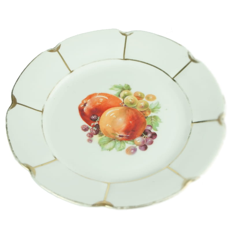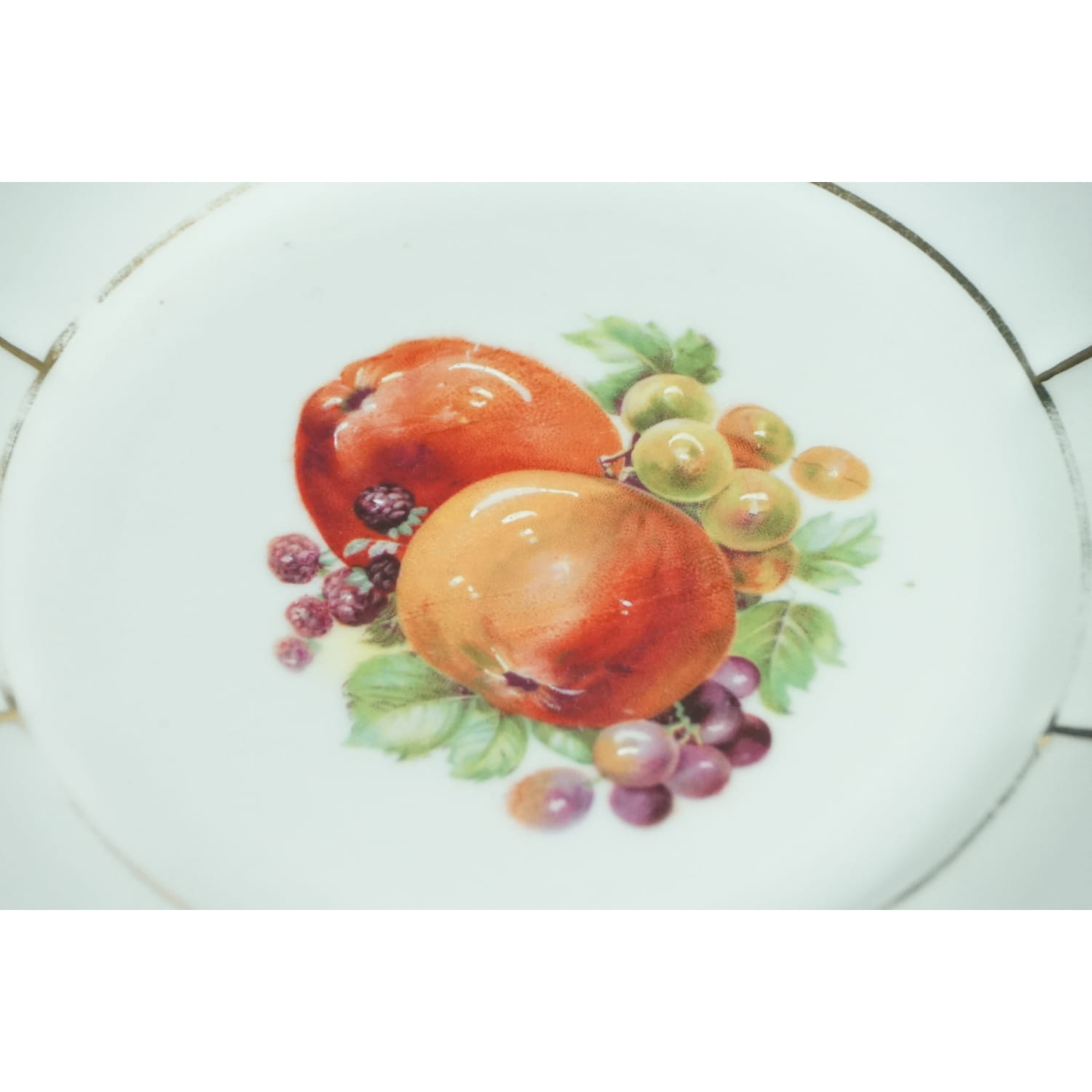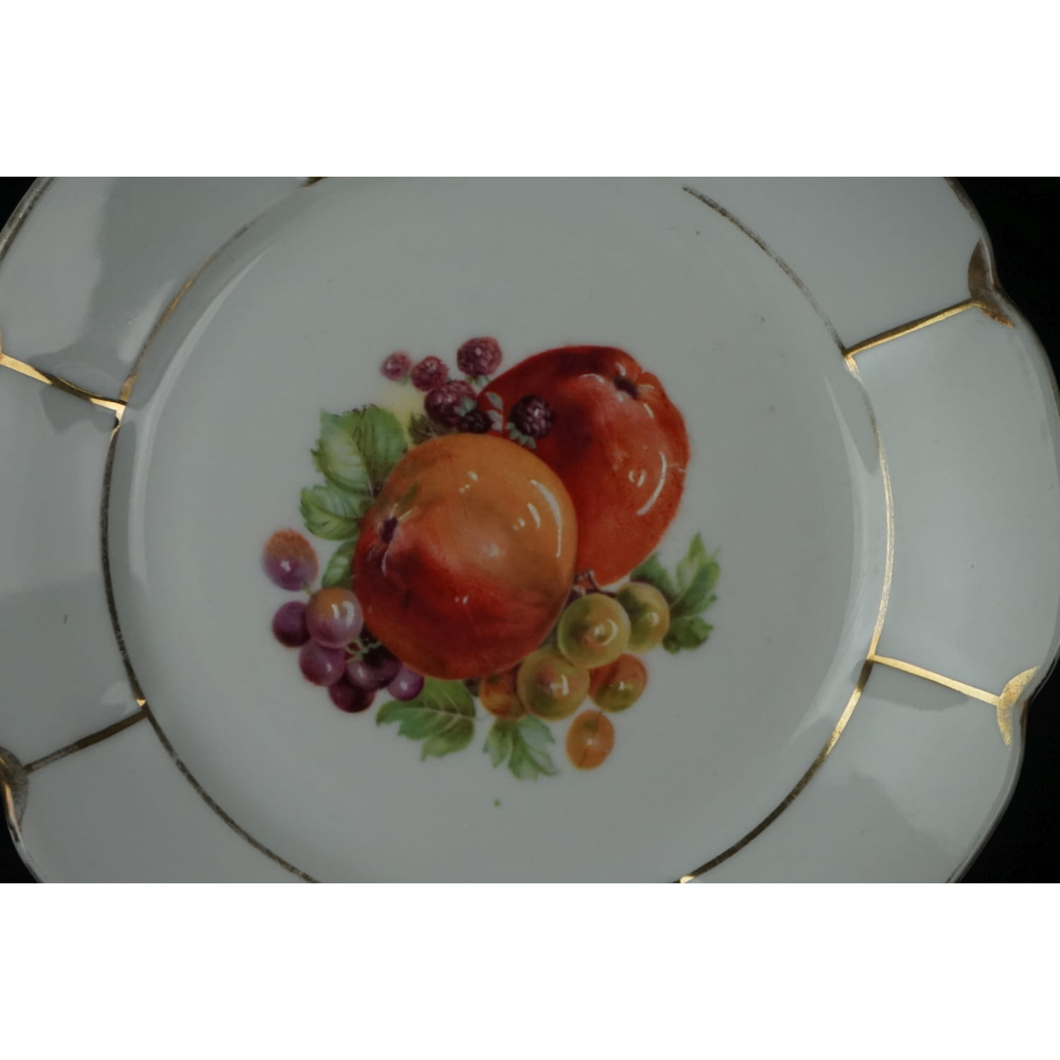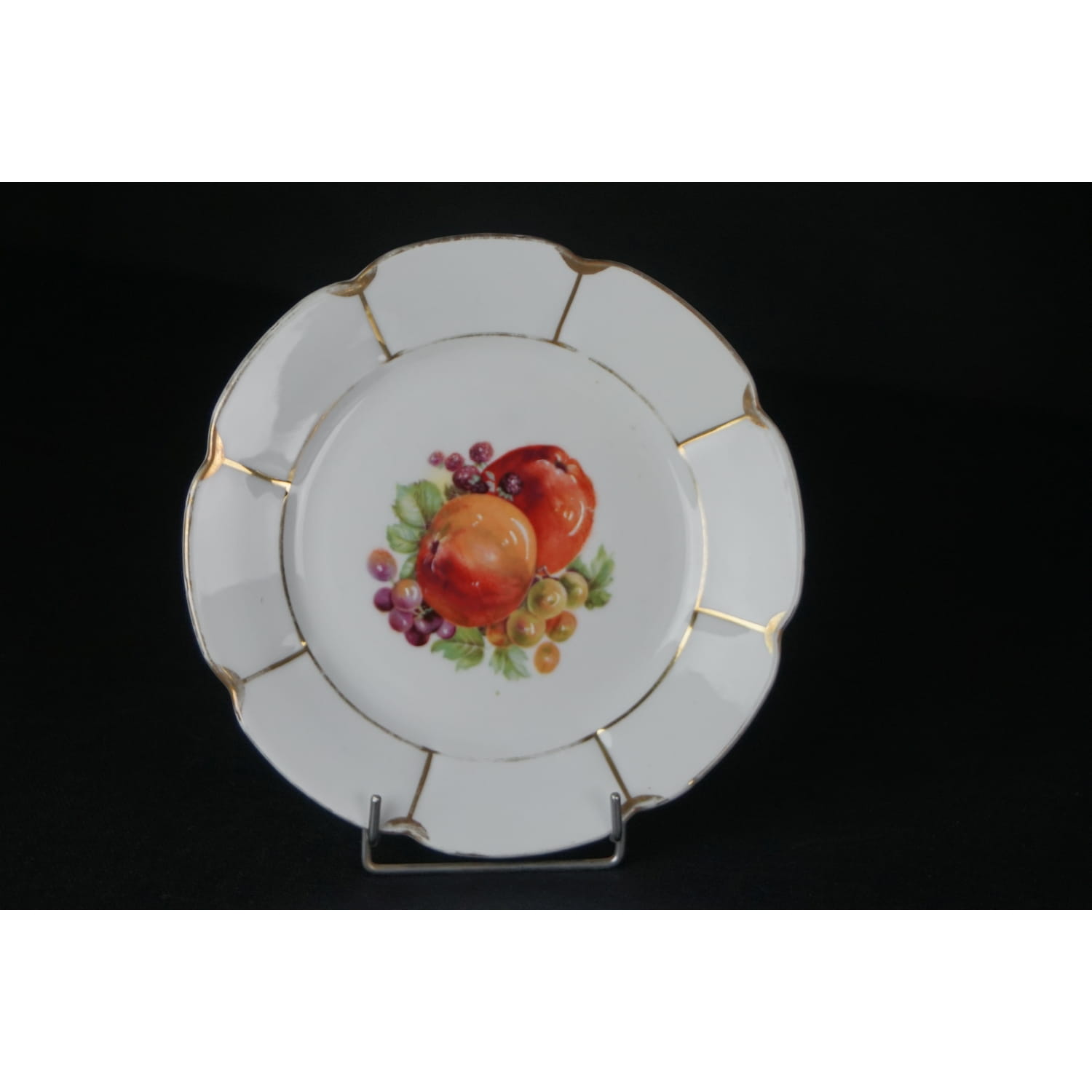Pochodzi z Dolnego Śląska z Parowej (niem. Tiefenfurt) z K. Steinmann, Porzellanfabriken. Sygnowany znakiem stosowanym w okresie 1910-1932. Porcelana biała, o graniastym kształcie, dekorowana kolorowymi, realistycznymi owocami, ręcznie podmalowywanymi. Rant w złotej dość szerokiej obwódce, ale już trochę poprzecieranej.