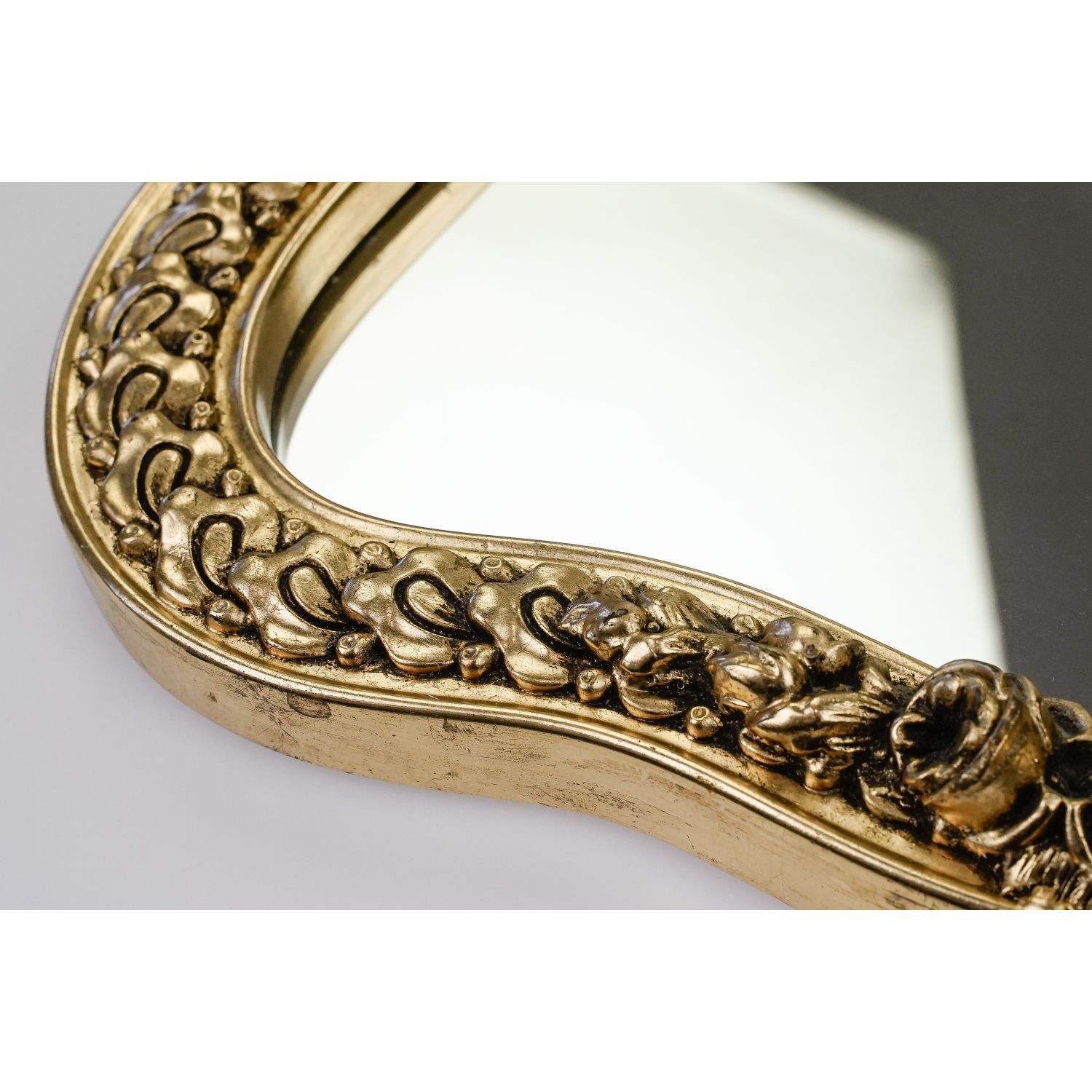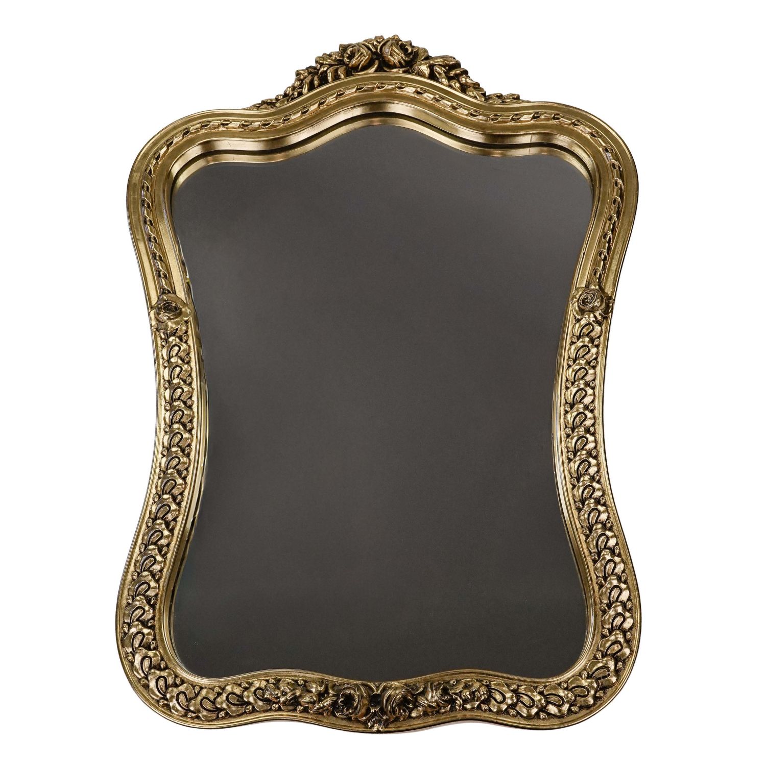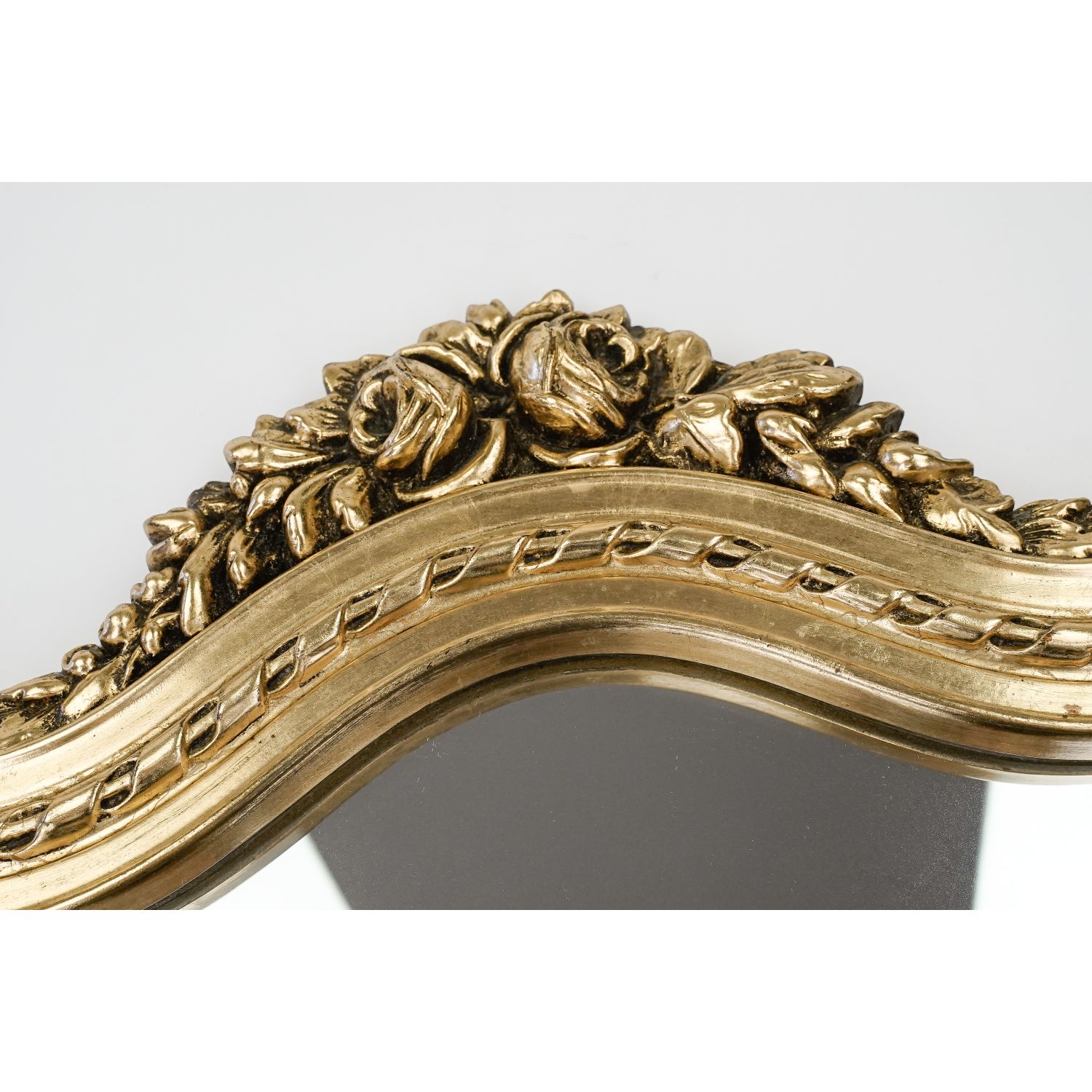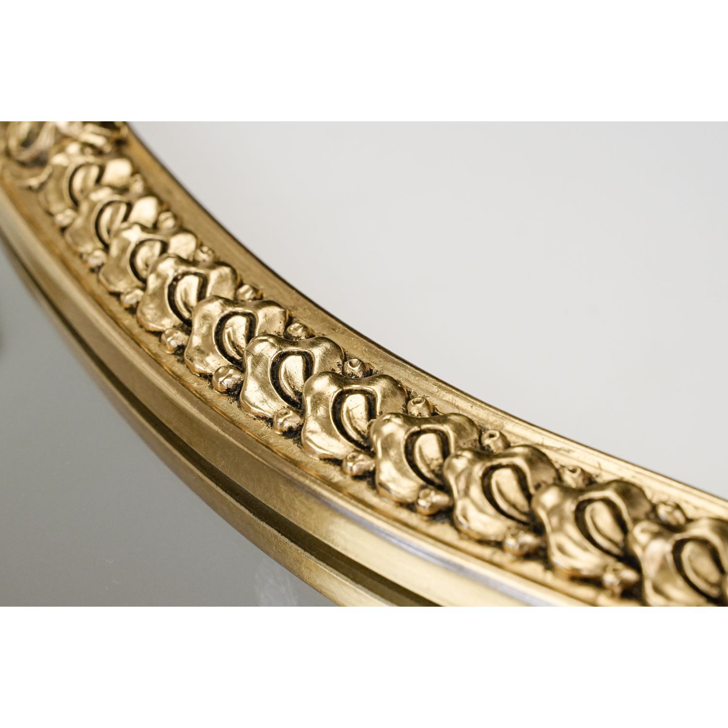 Rama wykonana z masy plastycznej, pokryta powłoką w kolorze starego złota z ozdobnymi zawijasami i kwiatami róż. Wewnętrzna krawędź wykończona listeczkami i perlaturą. Gotowe do zawieszenia. Idealne do wnętrza z antykami. Sprawdzi się w łazience, przedpokoju, czy salonie.