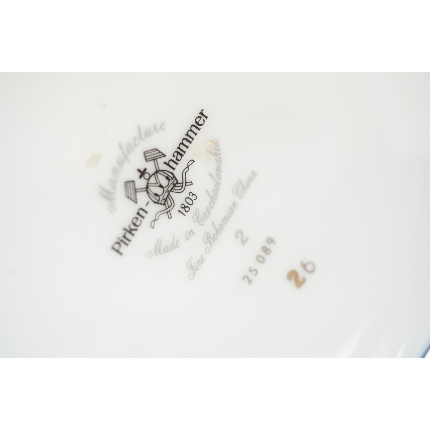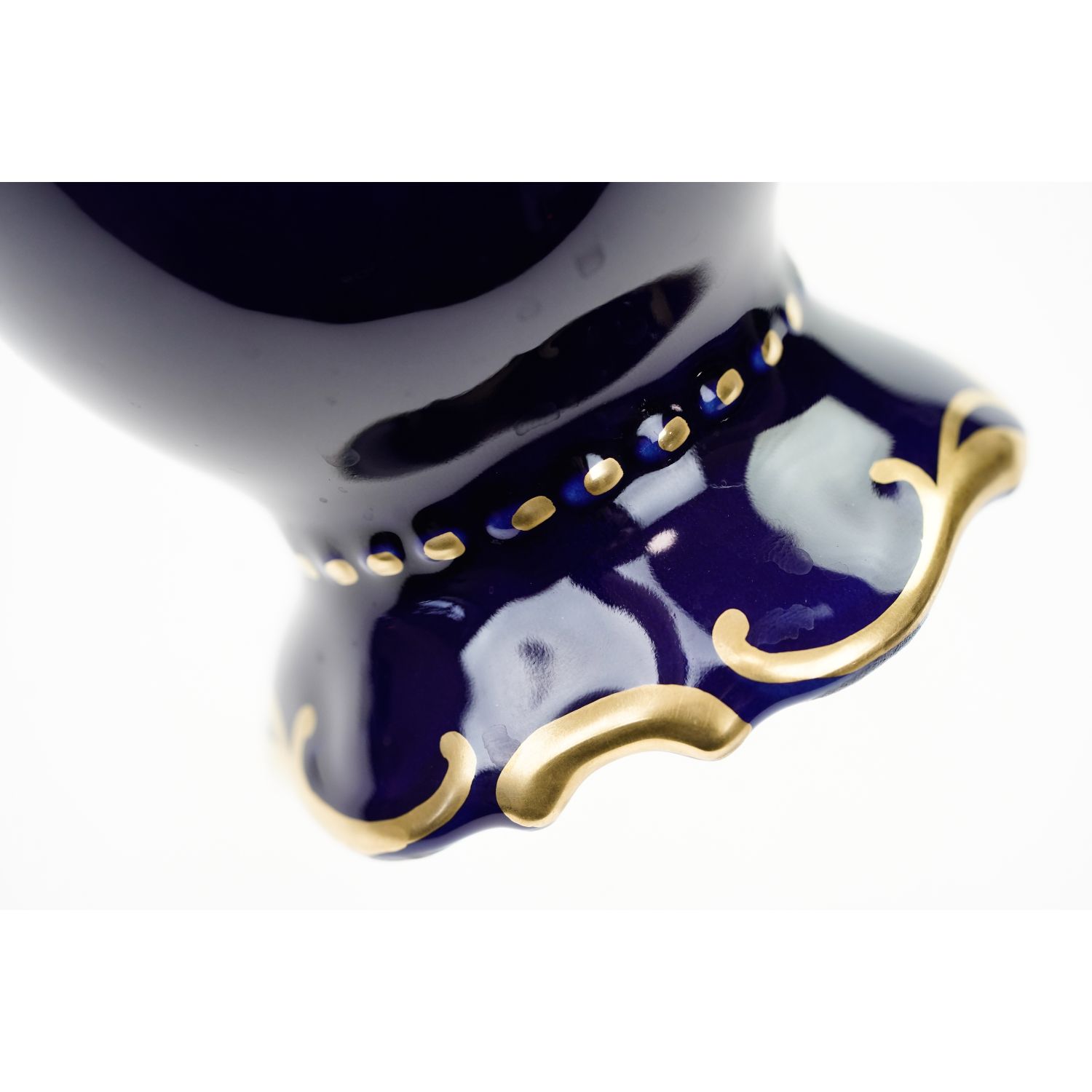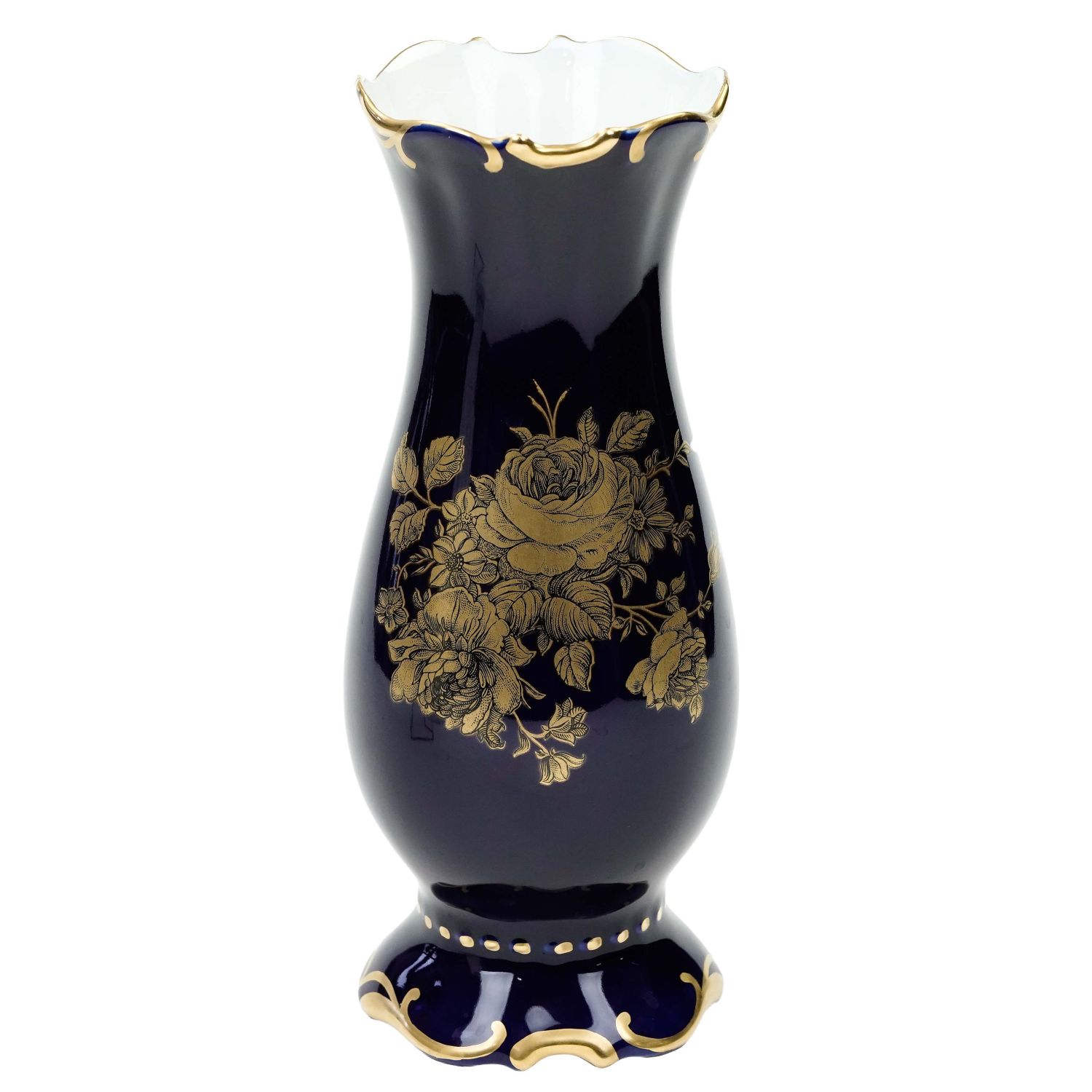 Pochodzi z Czech z miejscowości Březová z Karlovarský Porcelán. Sygnowany znakiem stosowanym od 1945 roku. Porcelana biała reliefowana z falowanymi krawędziami. Pokryty kobaltową malaturą, a na brzuścu umieszczono bukiet złotych róży. Krawędzie i reliefy podkreślono dość grubym, szlachetnym złoceniem.